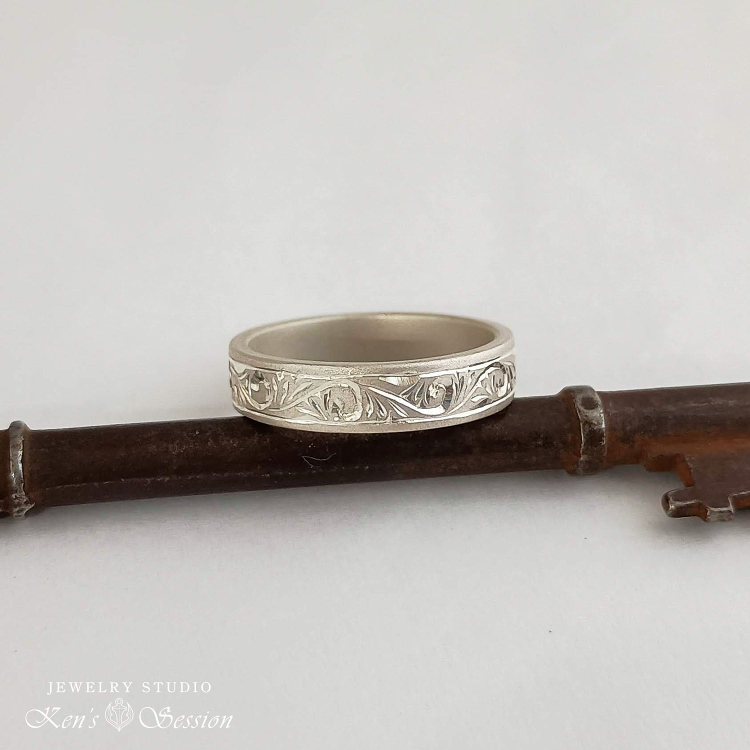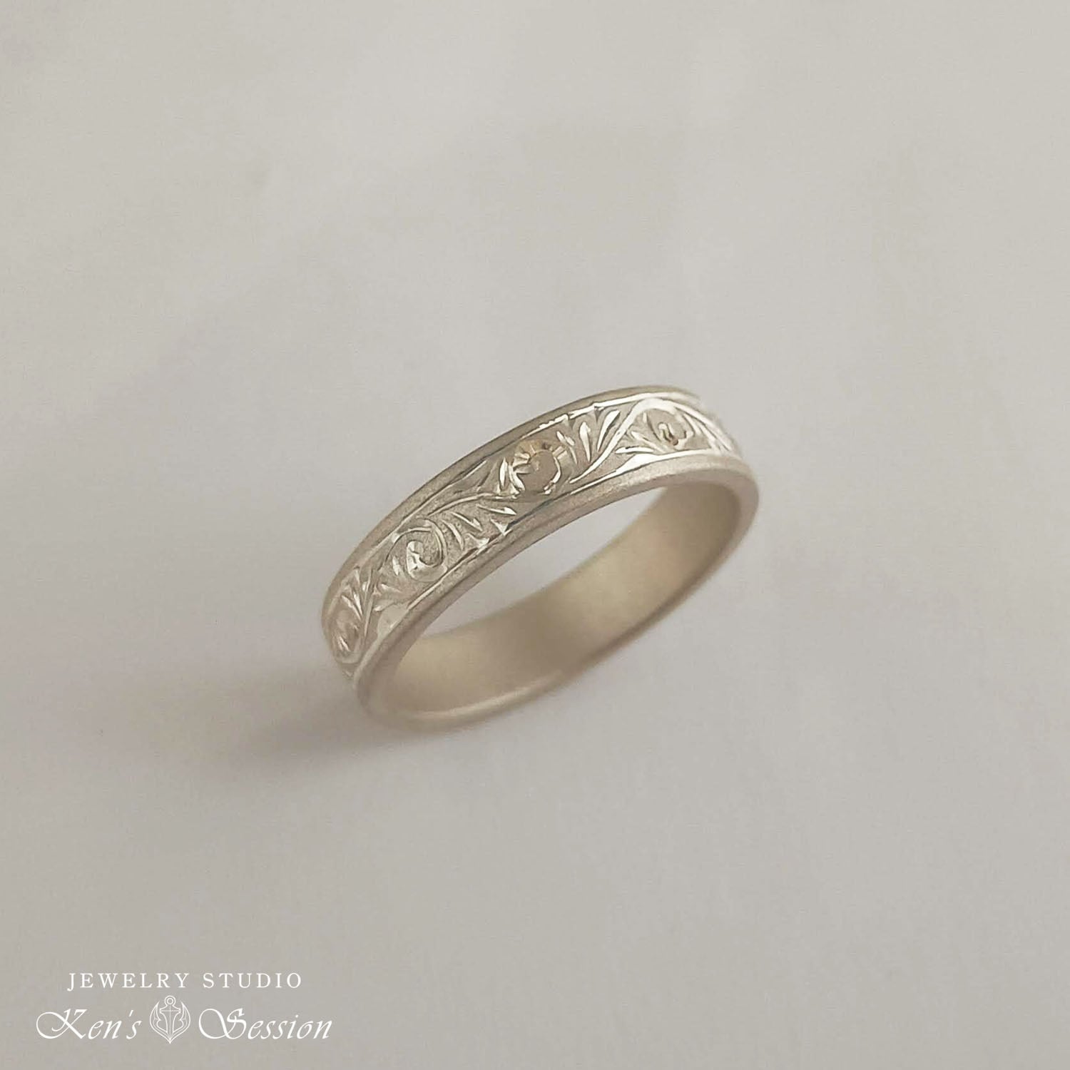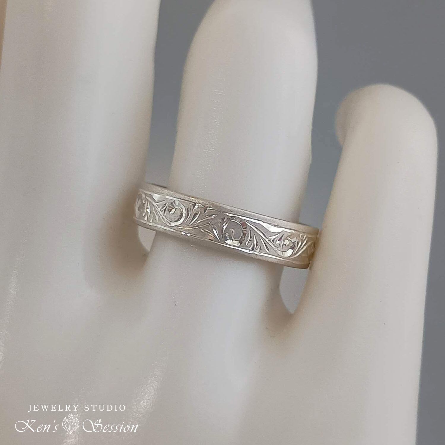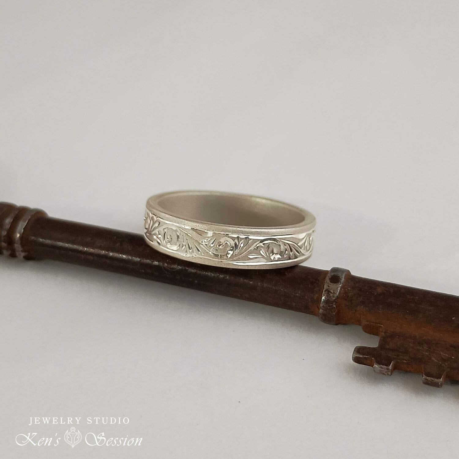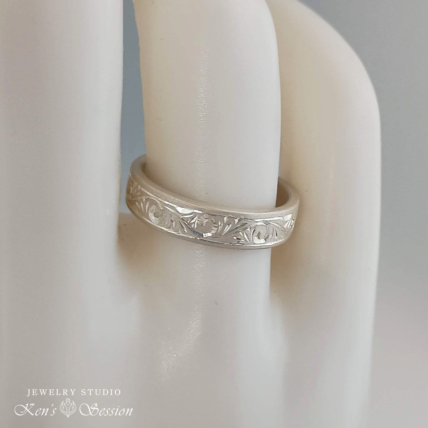 シルバーのプレートに唐草模様を手彫りにより施されたリングです。