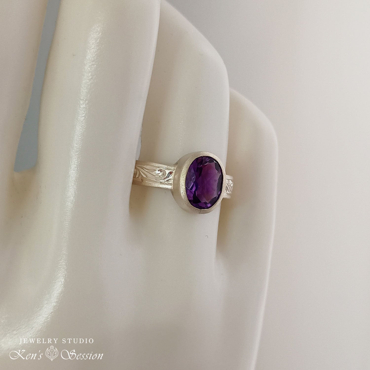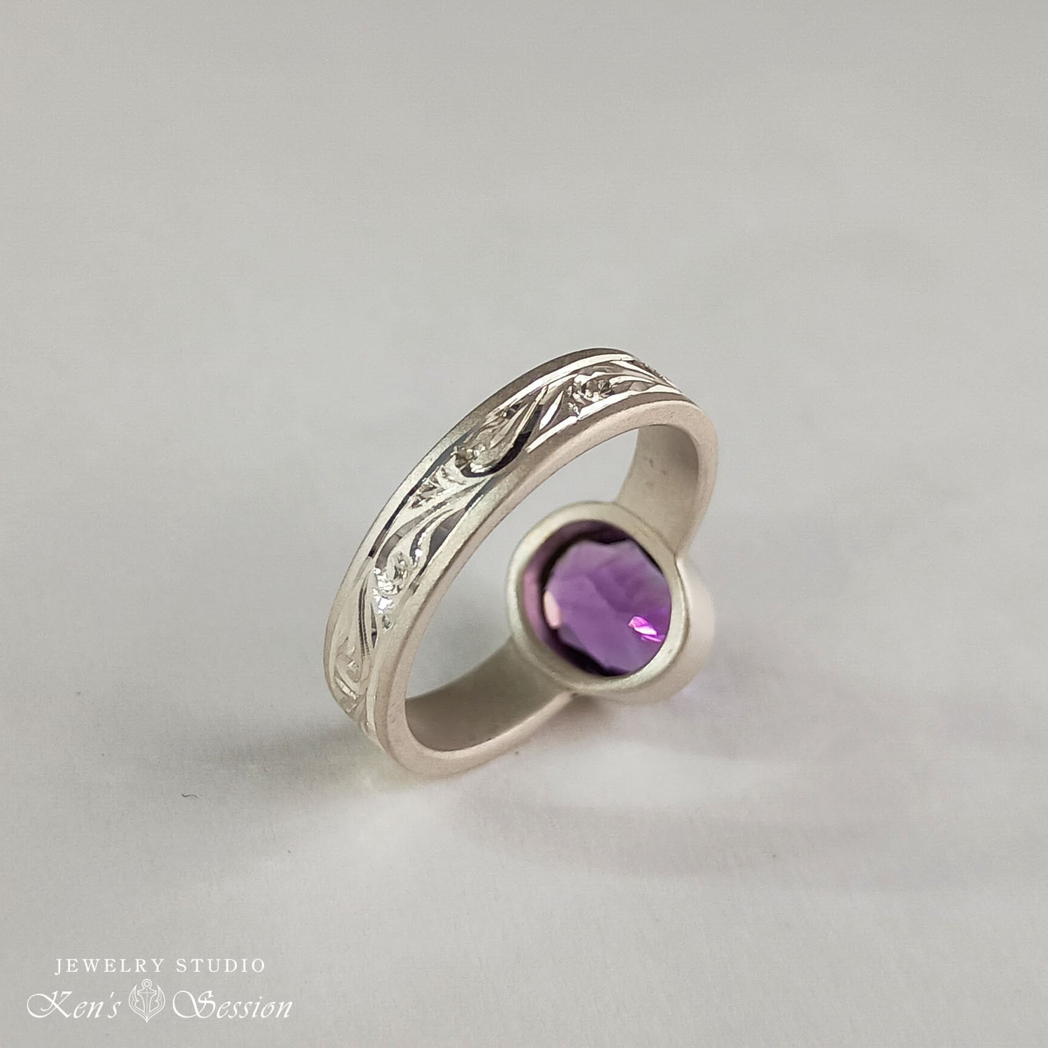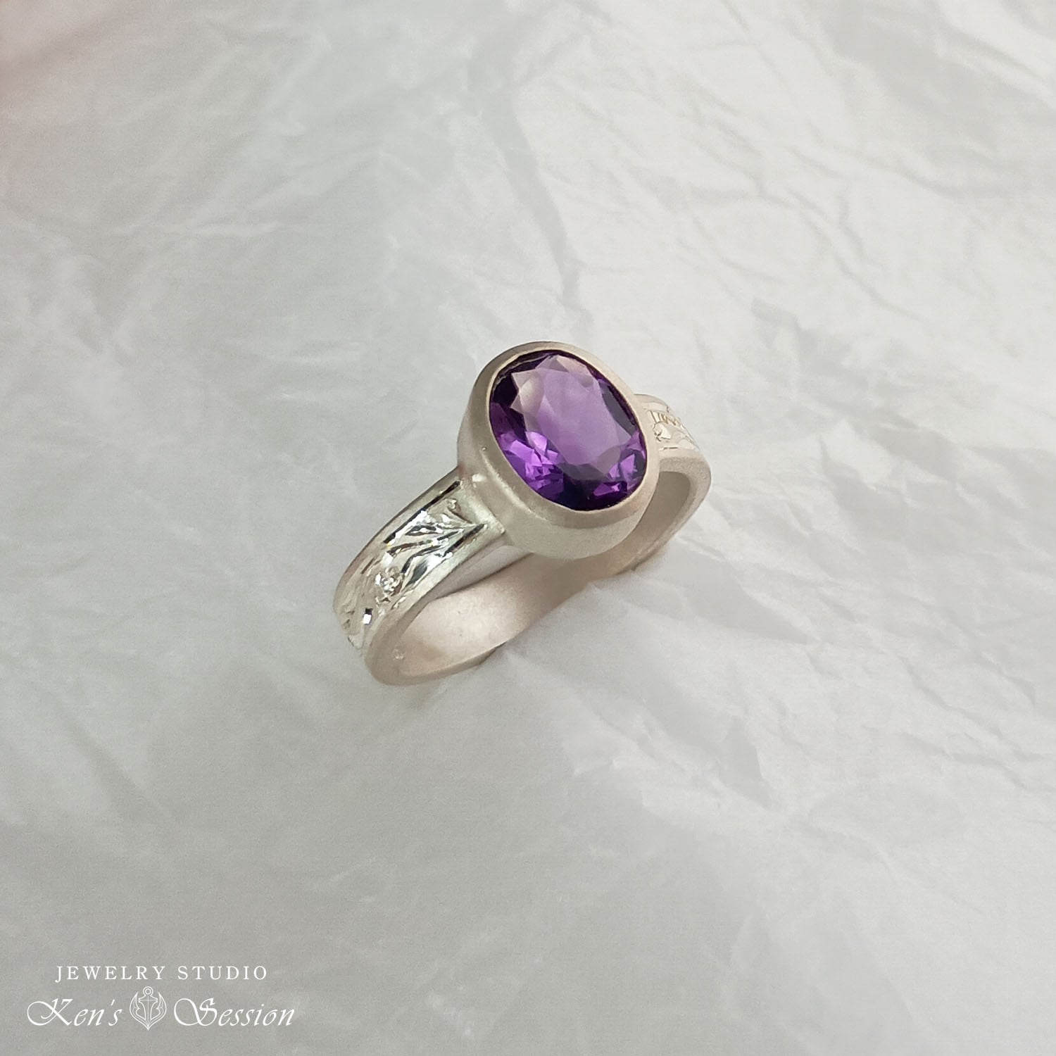 オーバルカットのアメシストを中心に、シルバーベースに唐草模様を手彫りにより施されたリングです。