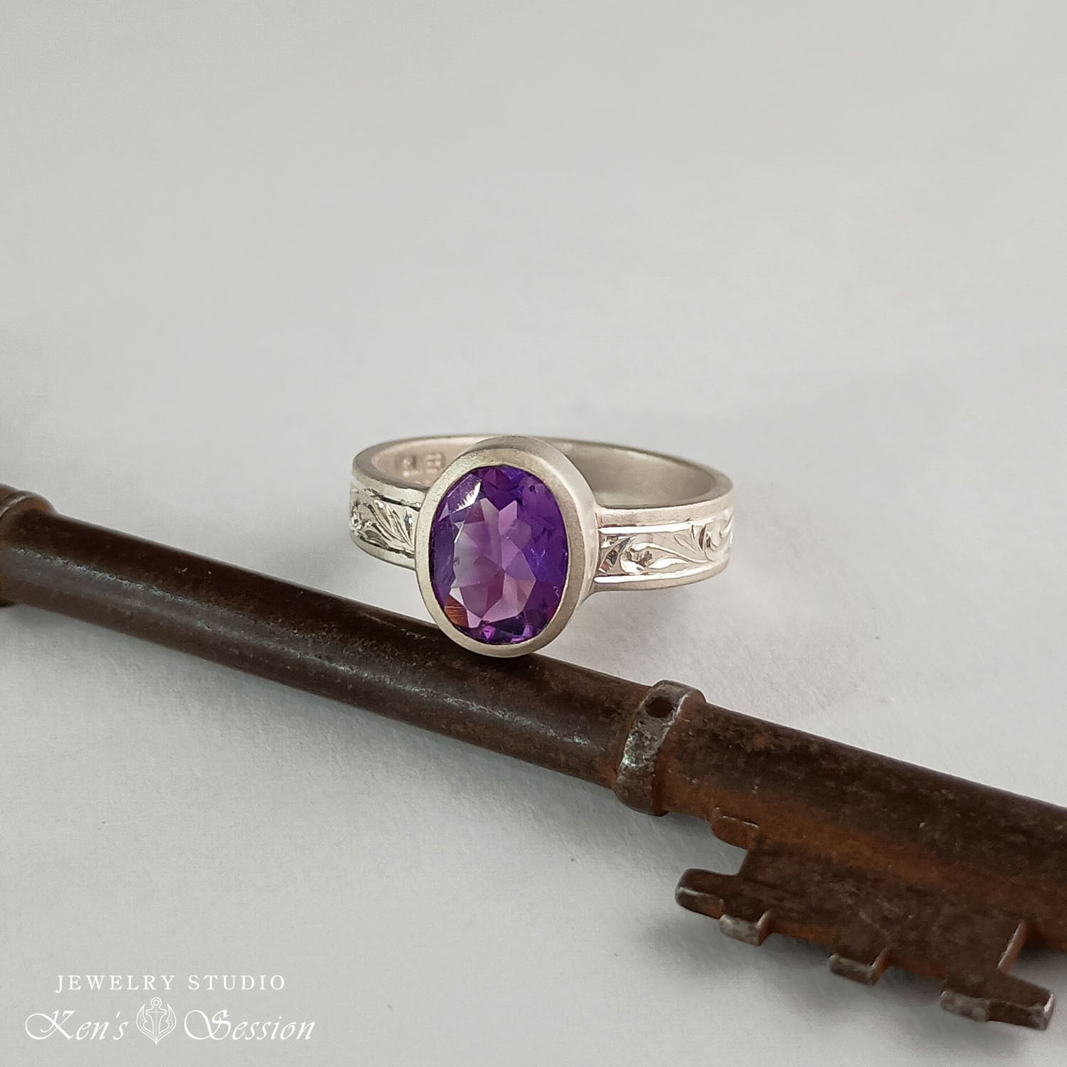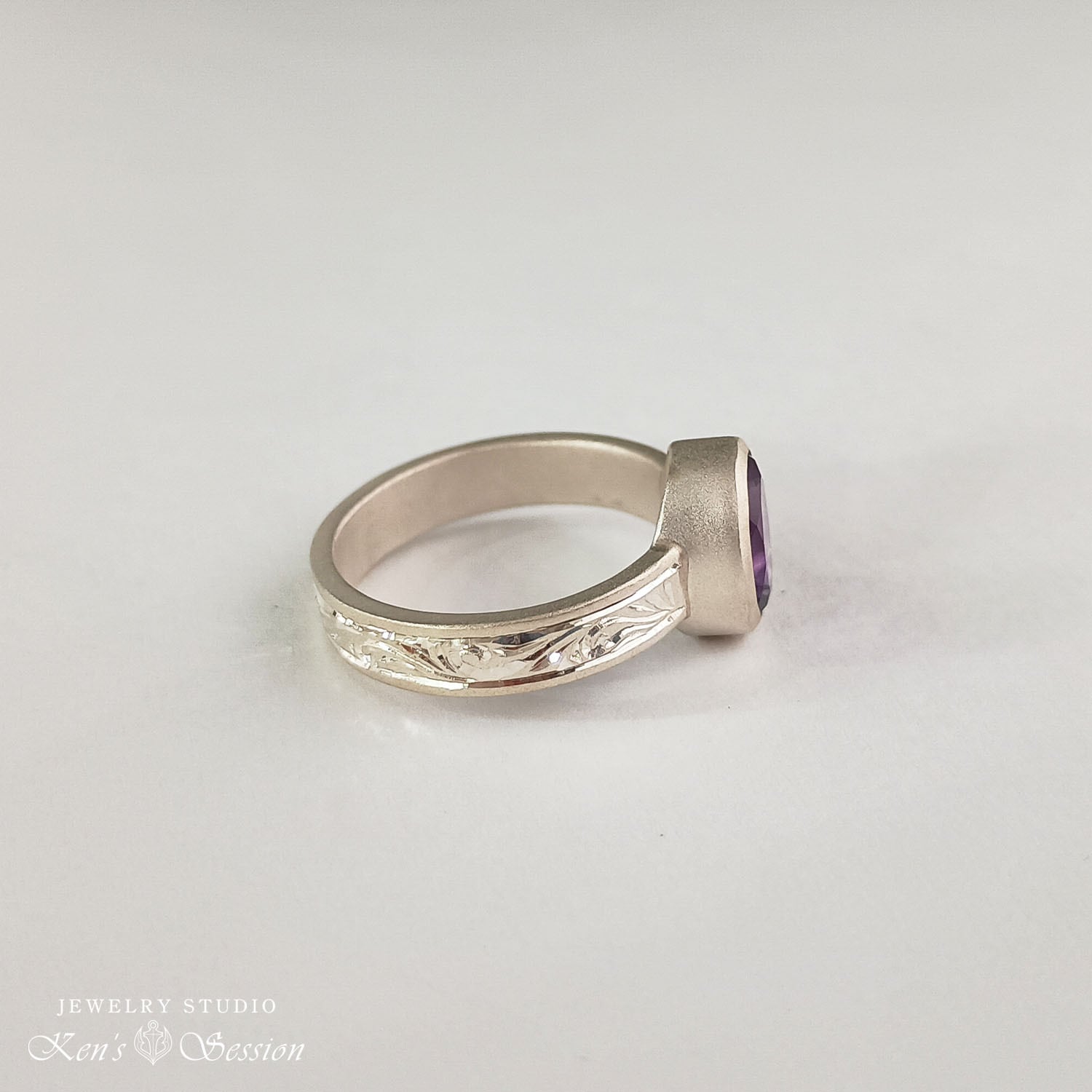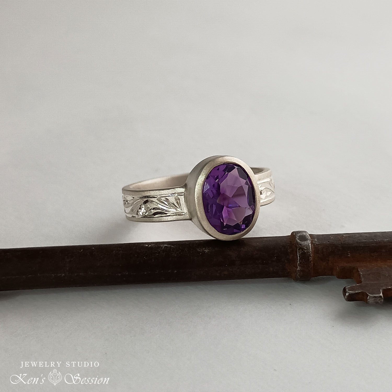 オーバルカットのアメシストを中心に、シルバーベースに唐草模様を手彫りにより施されたリングです。