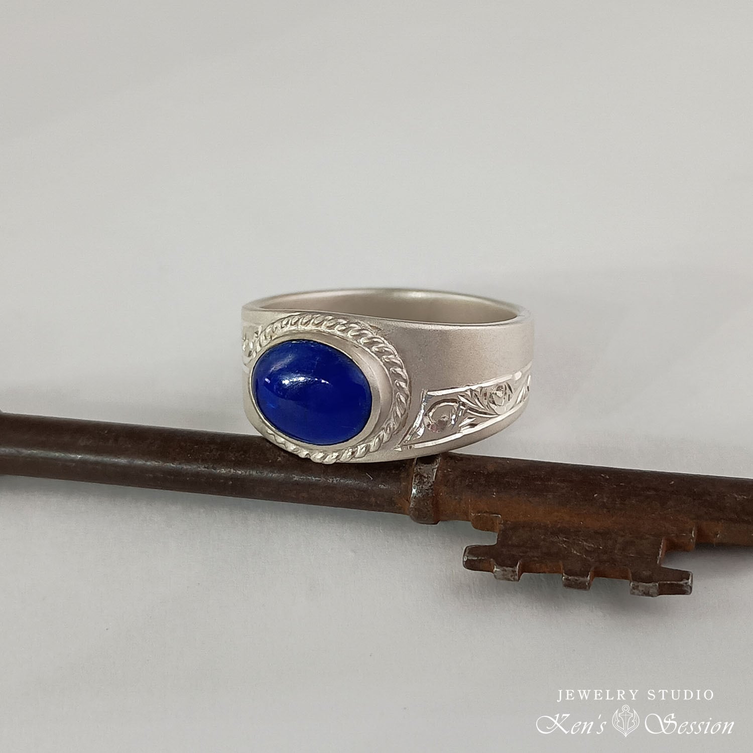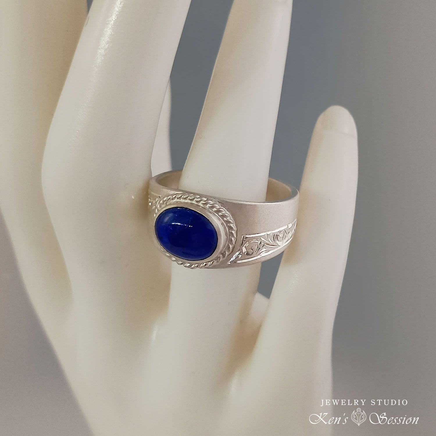 オーバルカットのラピスラズリを中心に、シルバーベースに唐草模様を手彫りにより施されたリングです。 ベースのリング部分は梨地(艶消し)仕上げにして唐草模様を彫っているので、彫った部分がキラキラと輝きます。 光を抑えたリングベースは、洋服を選ばずにコーディネート出来て、洗浄や磨きをして輝きを維持しながら着けるのも良いですし、使い込むうちに骨董のような風合いにもなります。ラピスラズリの落ち着いた色味と、手彫りによる唐草模様の輝きを、手元で楽しみたい方にお勧めです。