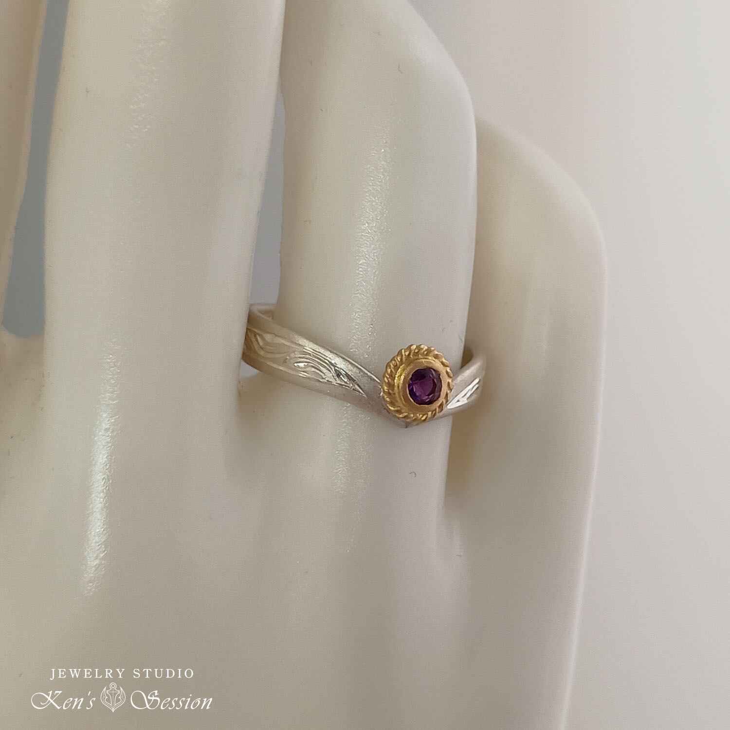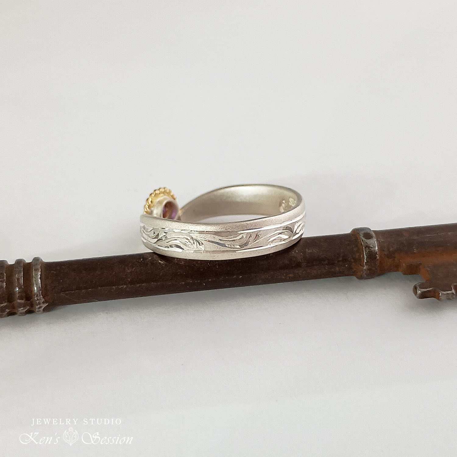 18金枠アメシスト手彫り唐草リング13.5号(K18,SV925)(kh-r-010-&k18ame)