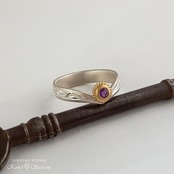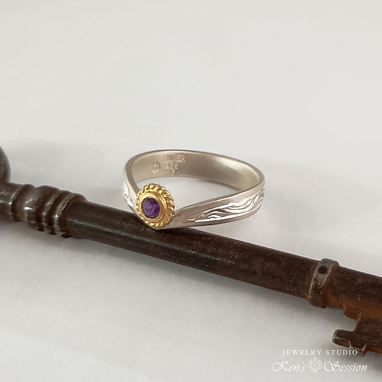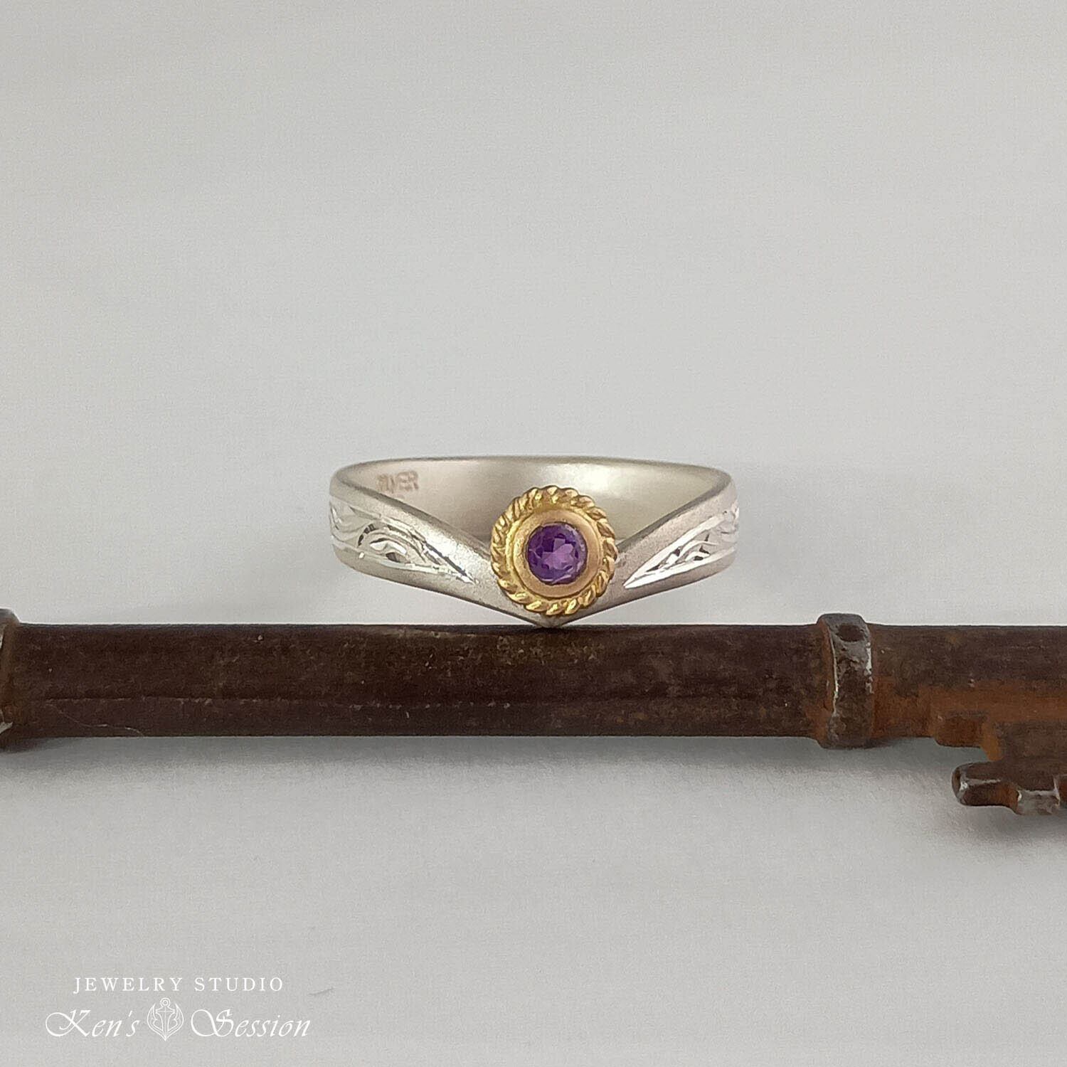 V字に切り出したシルバーベースのセンターに、ラウンドカットのアメシストを配置したリングです。 アメシストの18金枠がシルバーベースに対してのアクセントになり、ベースのリング部分は梨地(艶消し)仕上げにして唐草模様を彫っているので、彫った部分がキラキラと輝きます。 光を抑えたリングベースは、洋服を選ばずにコーディネート出来て、洗浄や磨きをして輝きを維持しながら着けるのも良いですし、使い込むうちに骨董のような風合いにもなります。
