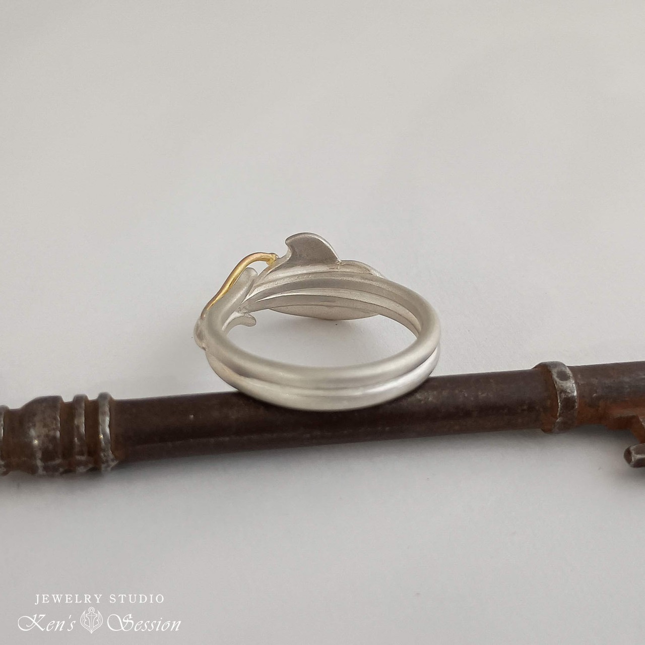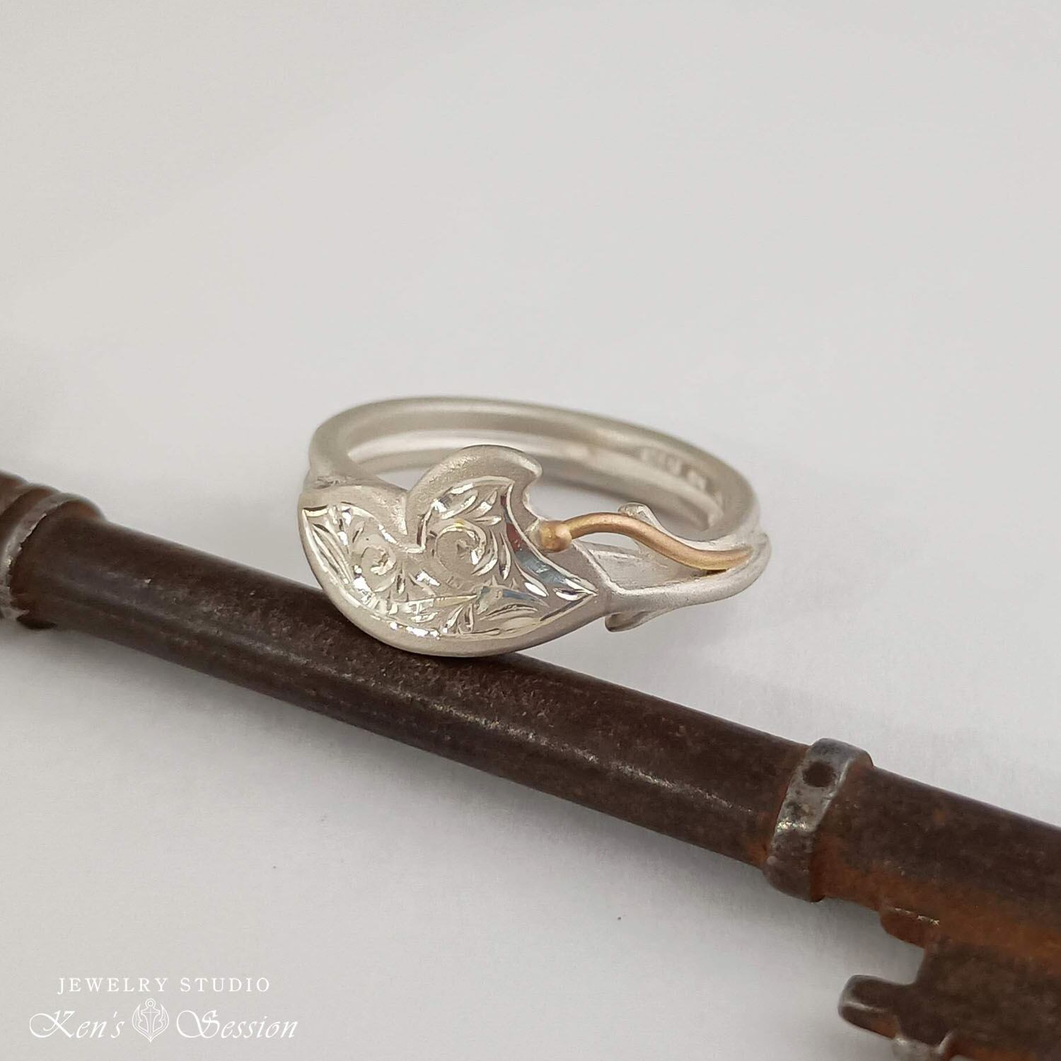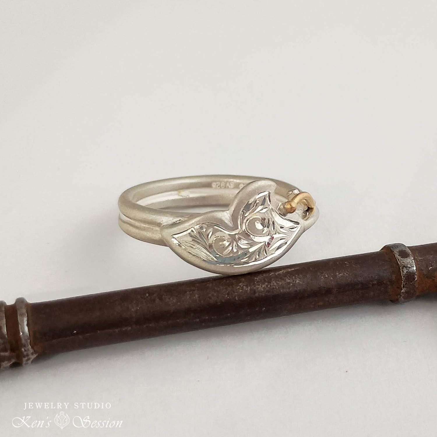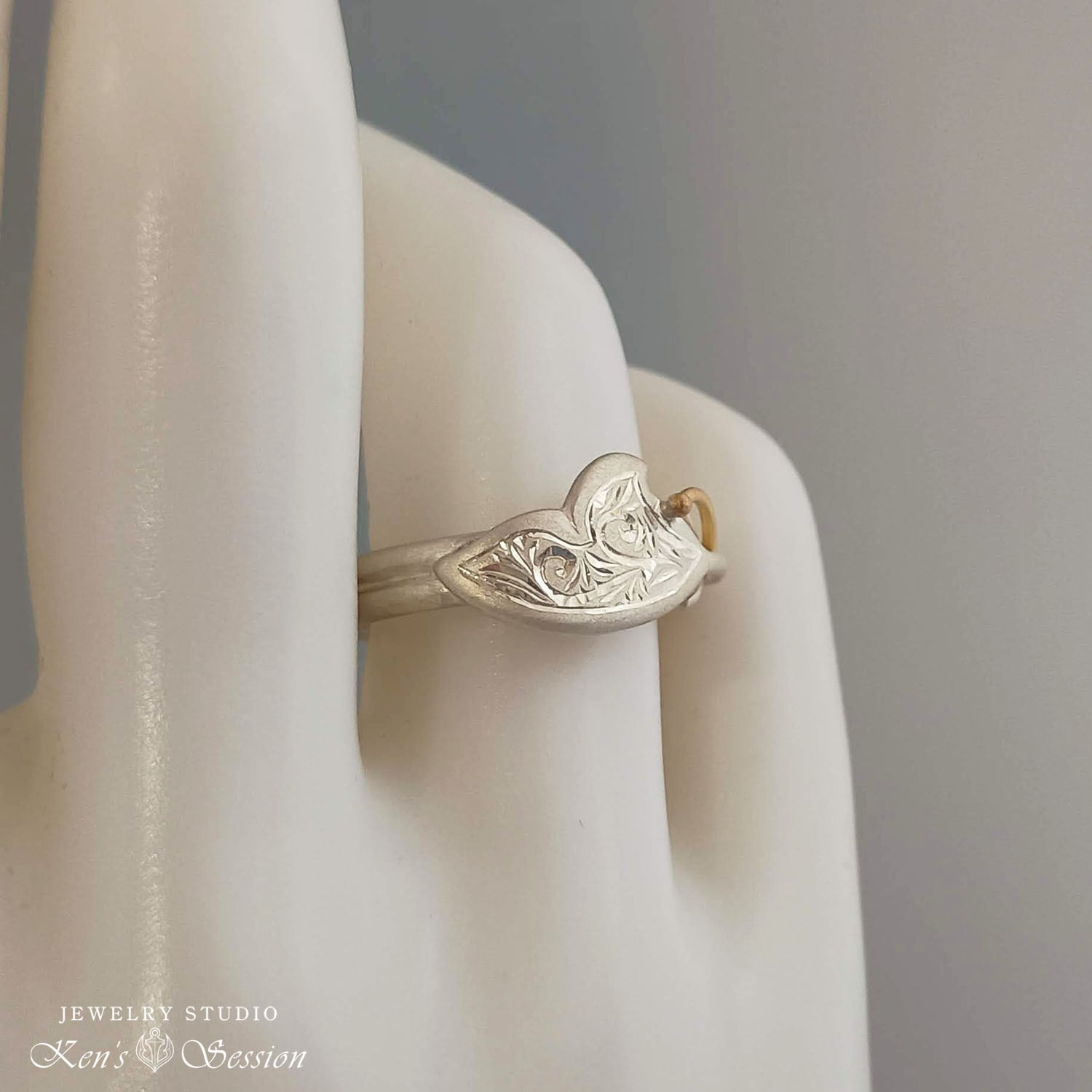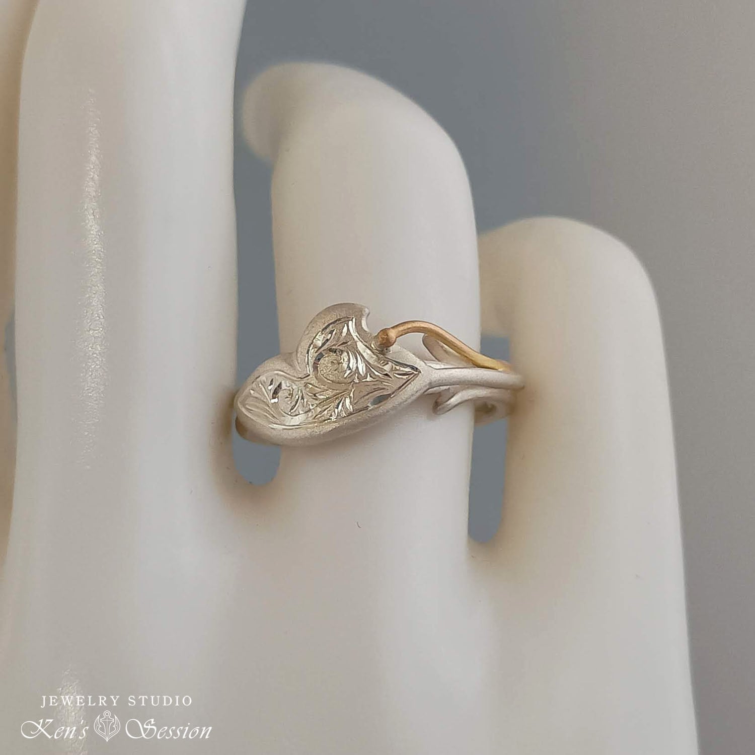 ユリの花弁をイメージしたプレートに、唐草模様を手彫りにより施されたリングです。