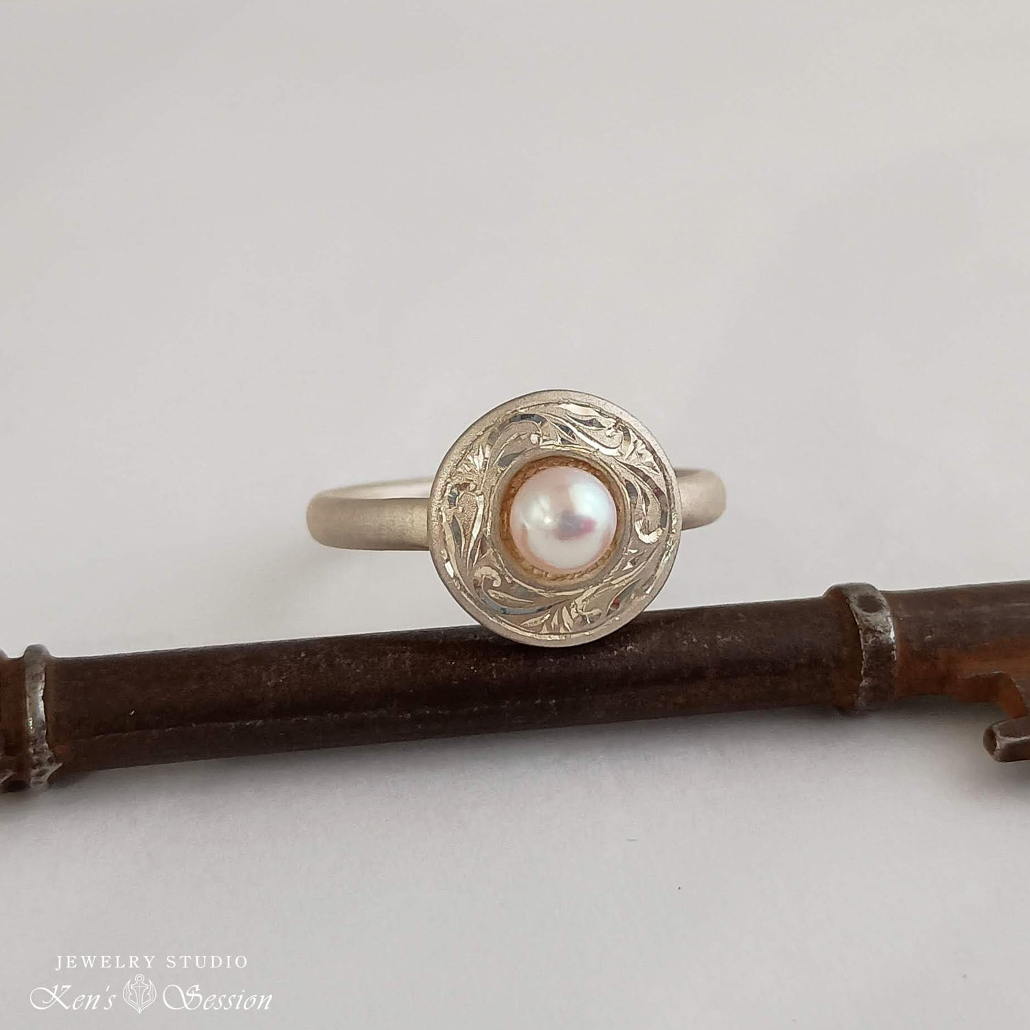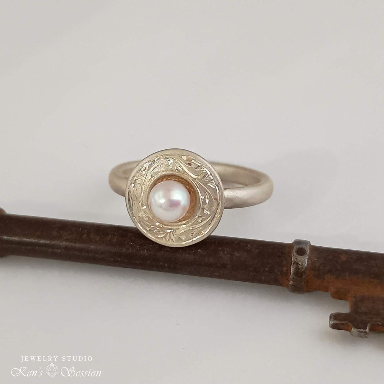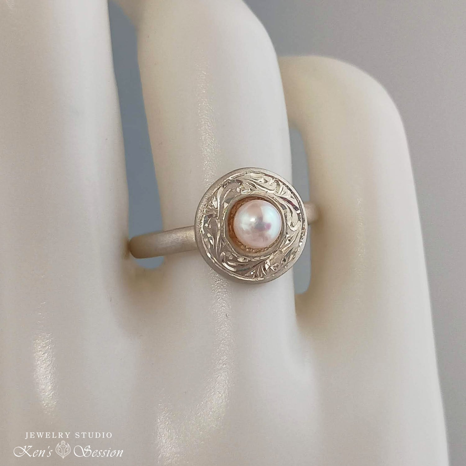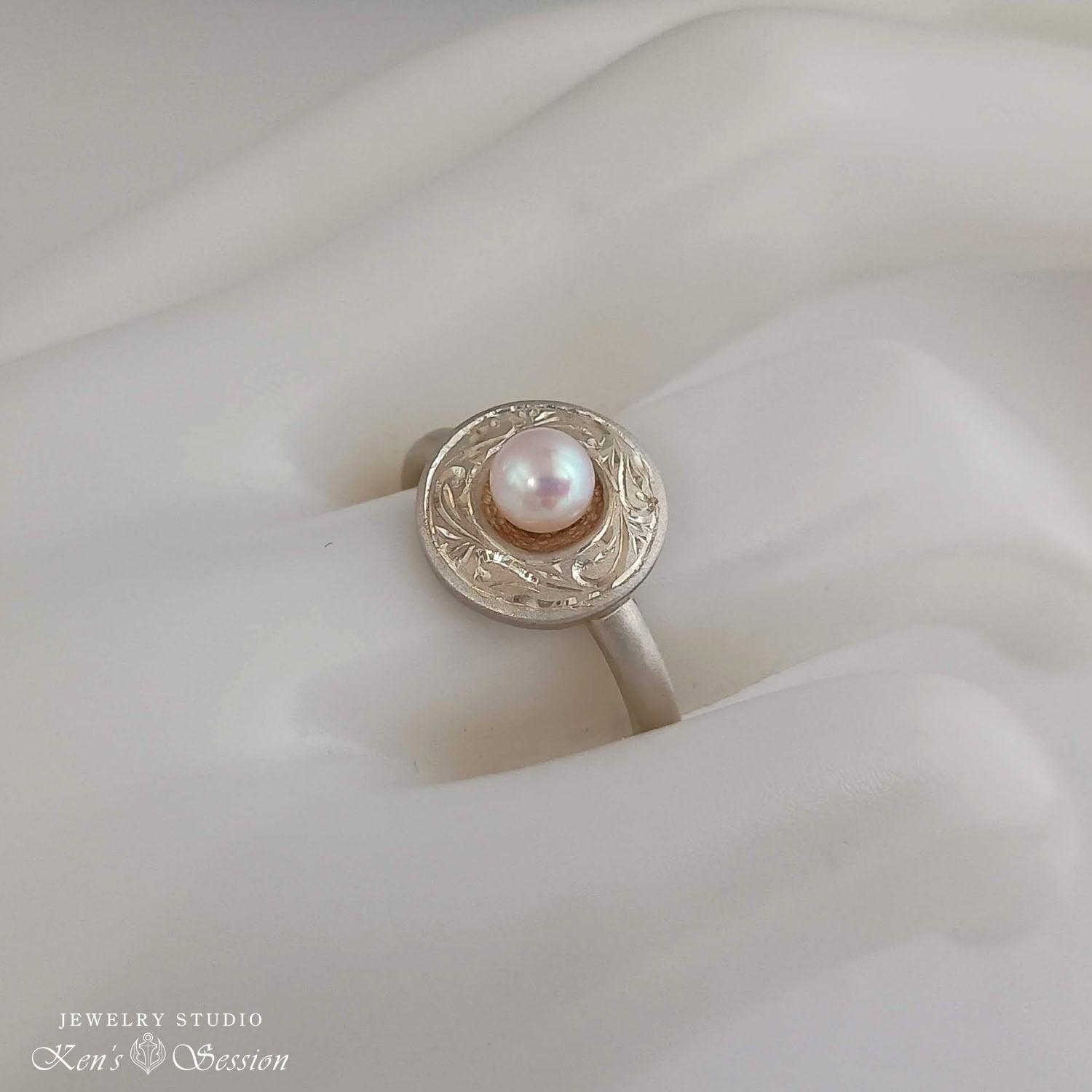 センターに留めたアコヤパールを周りに、唐草模様を手彫りにより施されたリングです。