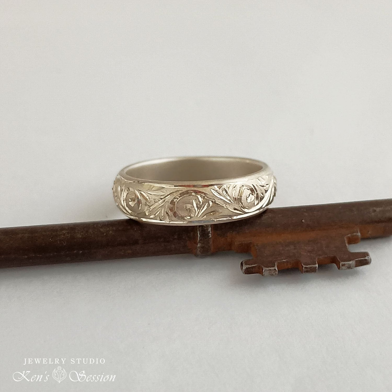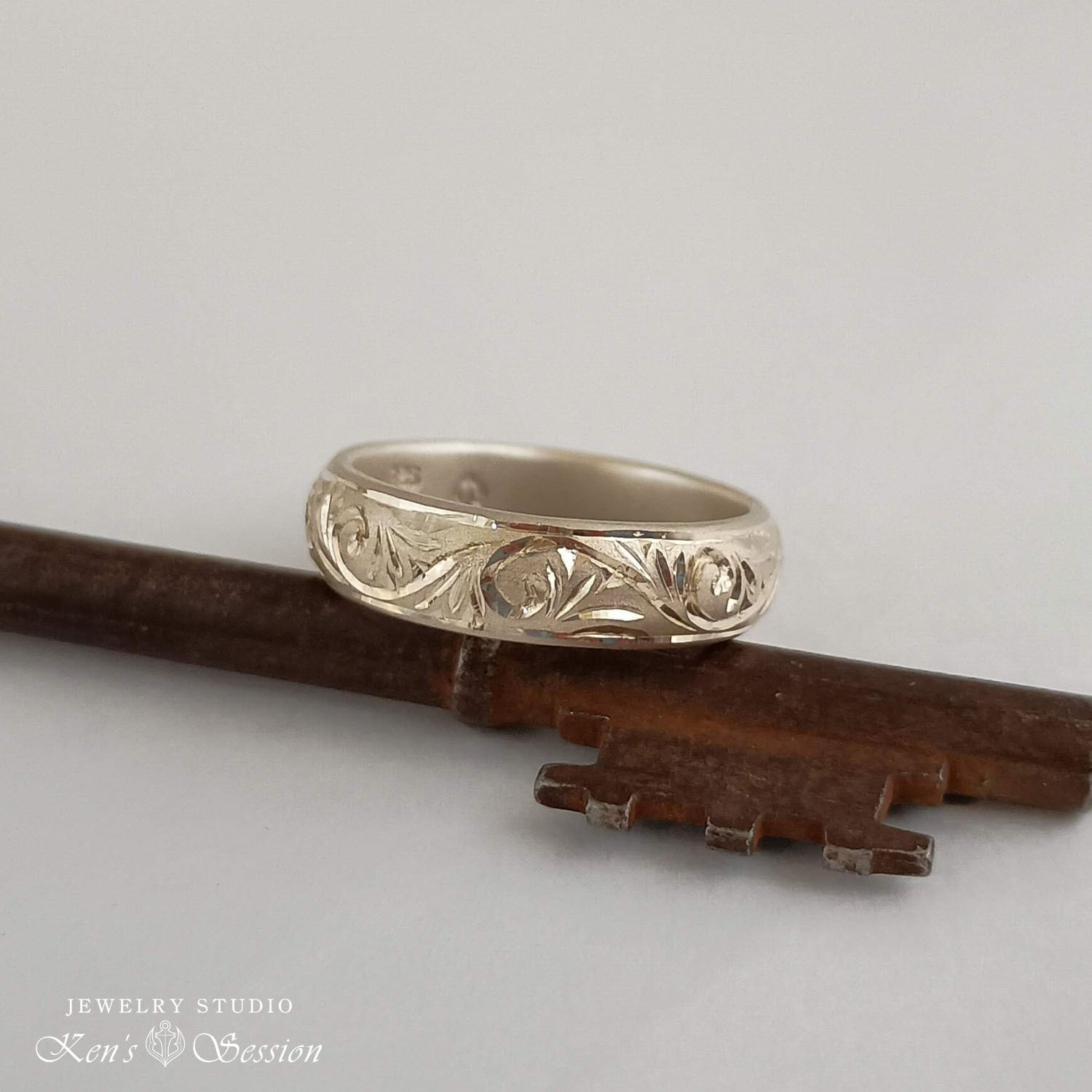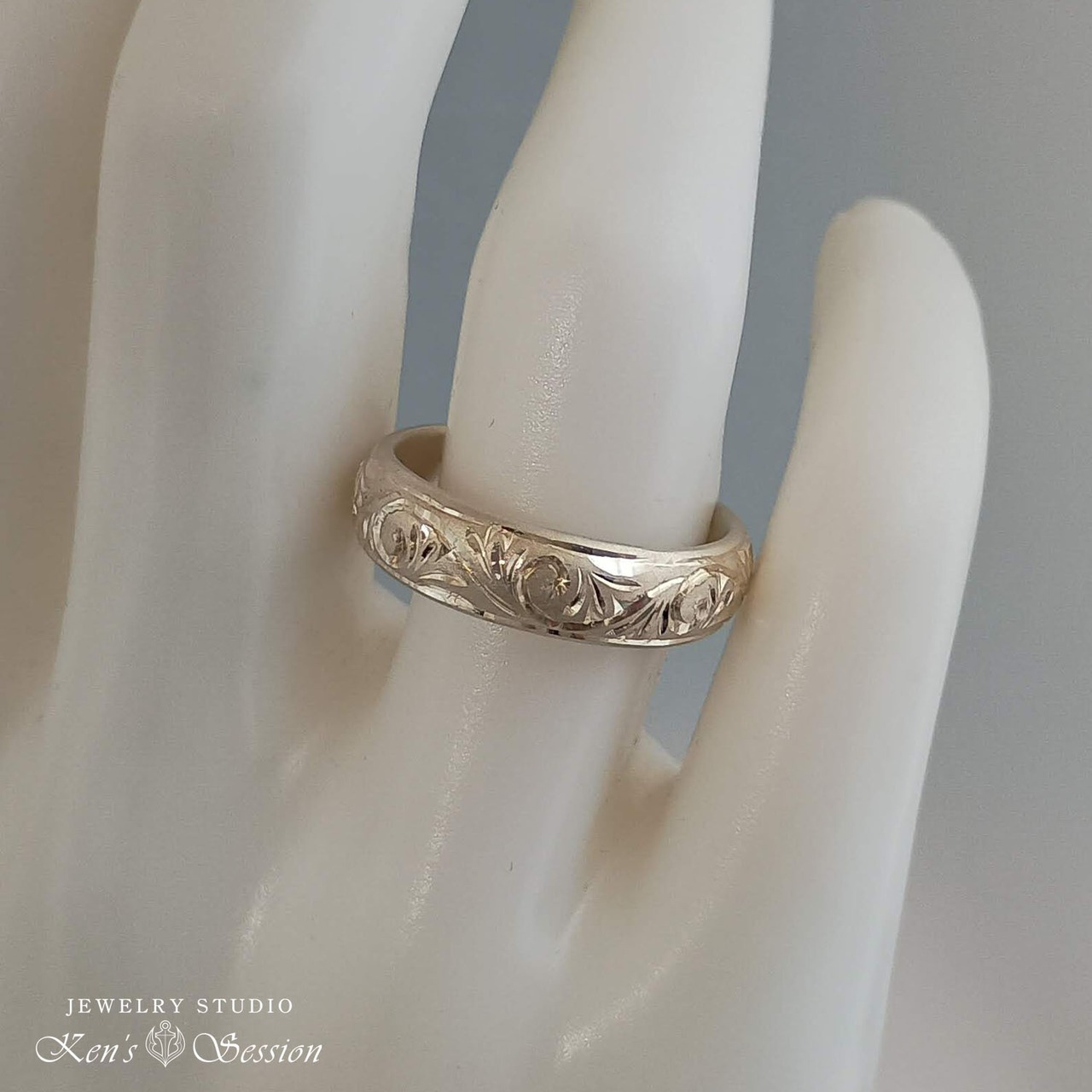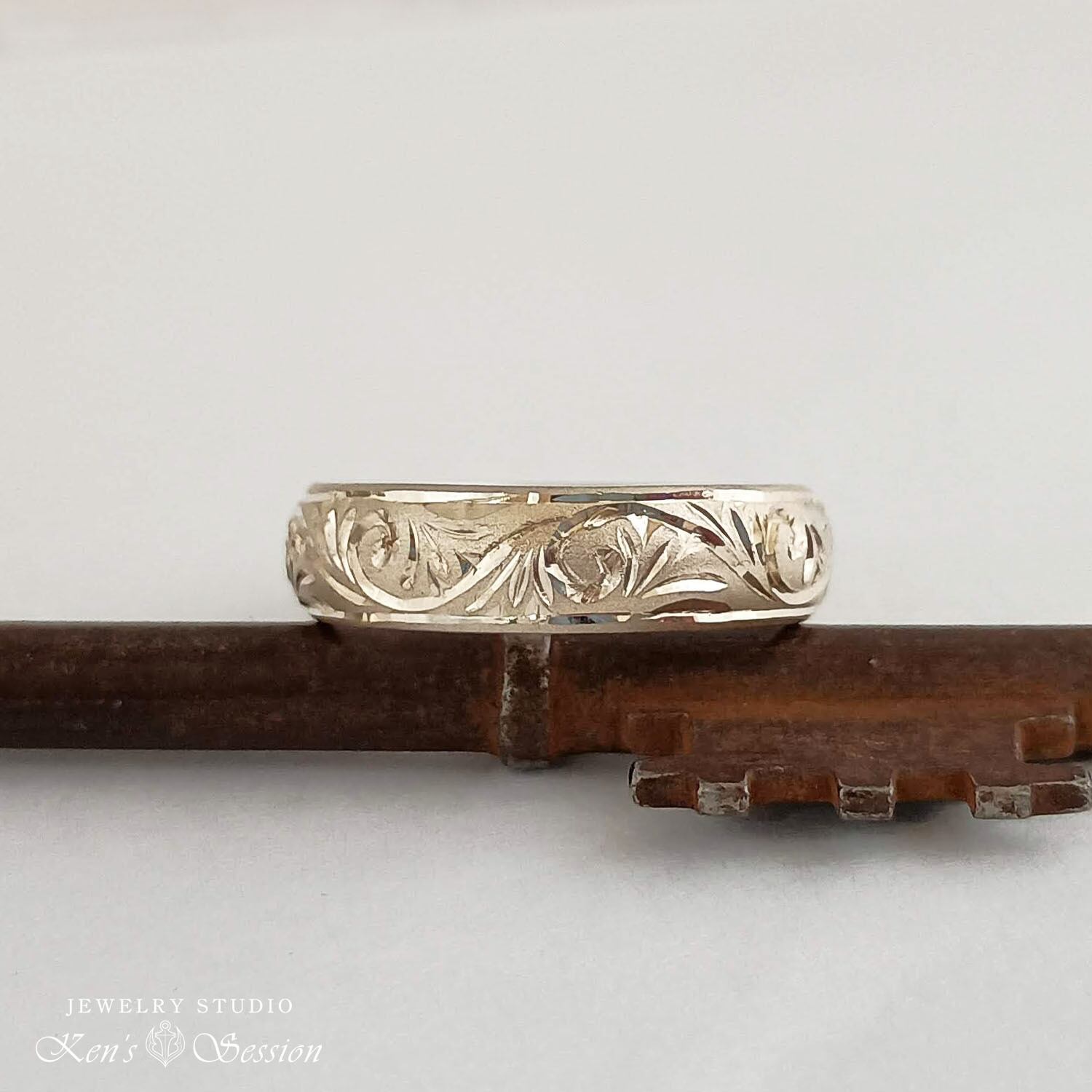 シルバーの甲丸リング(カマボコ型)をベースに、唐草模様を手彫りにより施されたリングです。