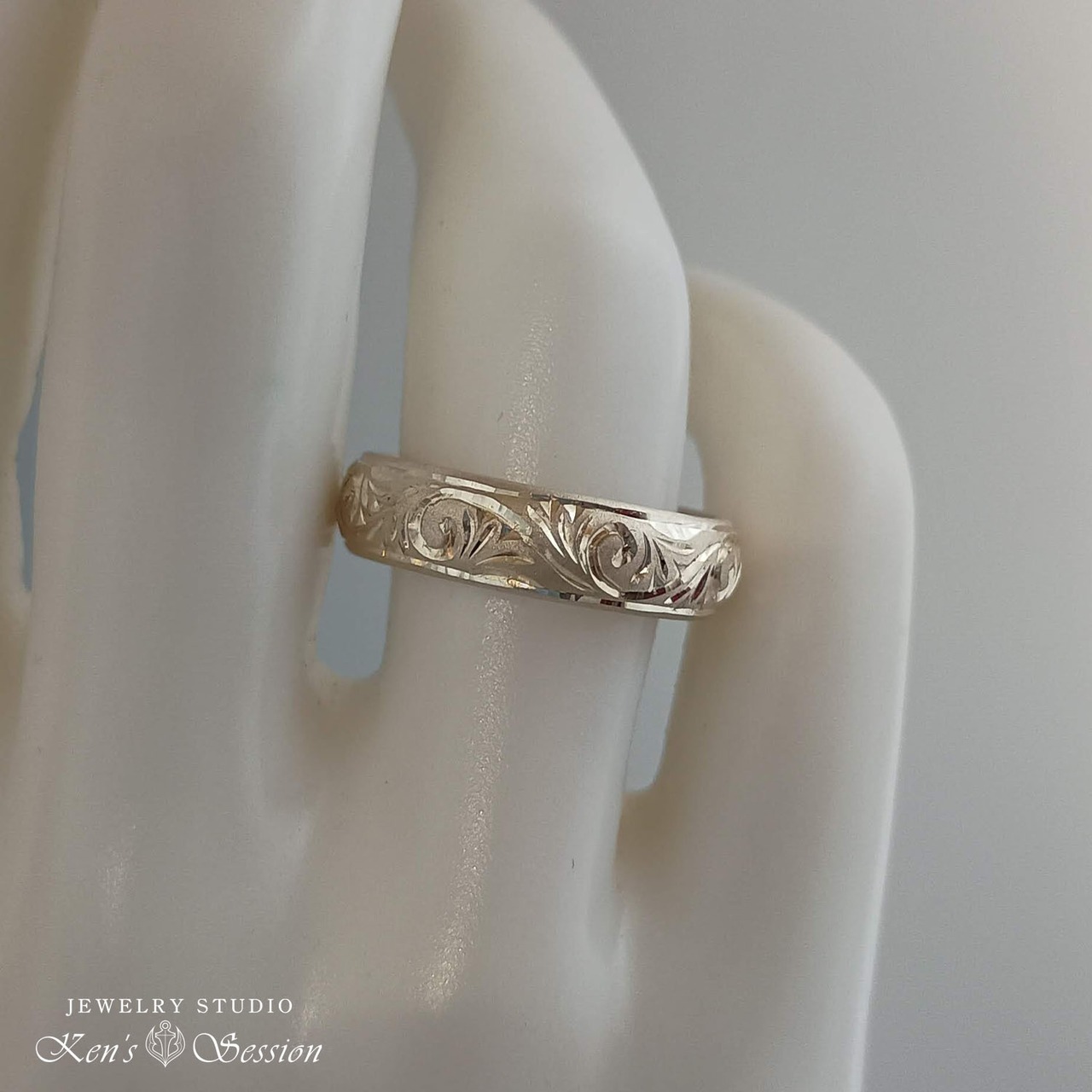 丸いラインが、平打ちベースよりも柔らかい印象になり、表面を梨地(艶消し)仕上げにして唐草模様を彫っているので、彫った部分がキラキラと輝きます。