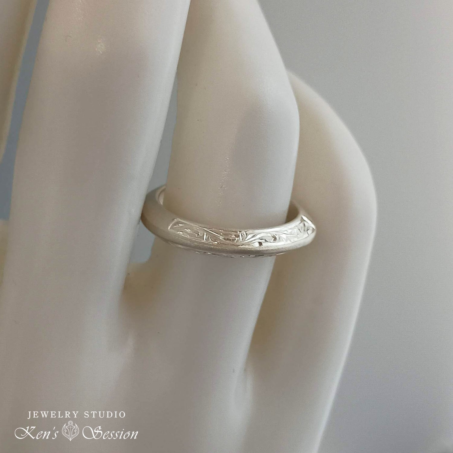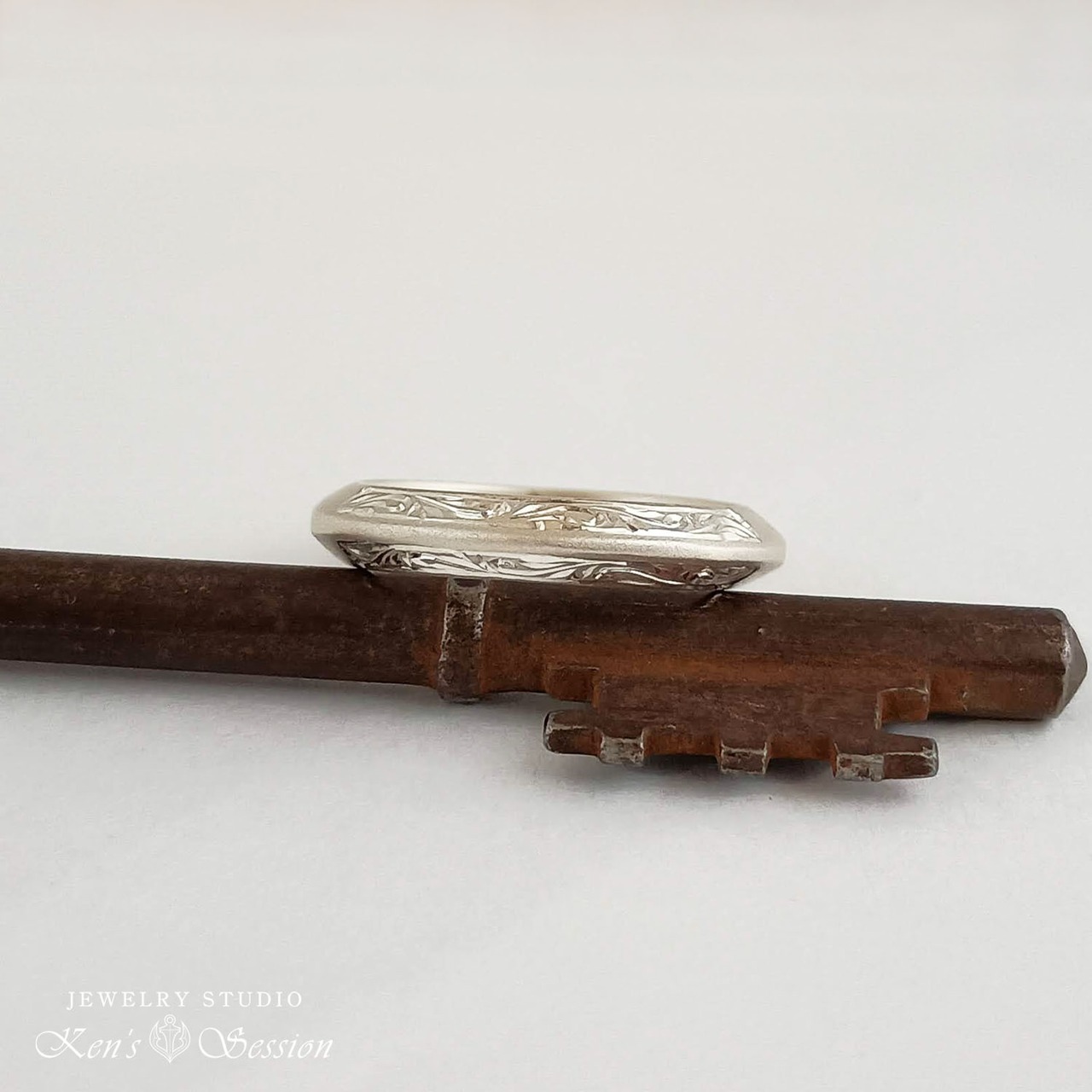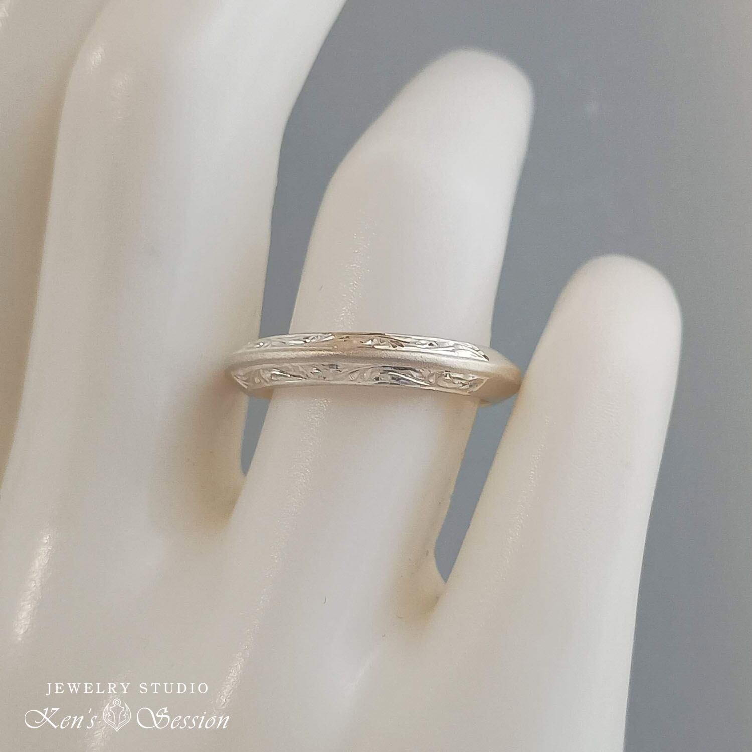 三角形の角線のリングに唐草模様を手彫りにより施されたリングです。