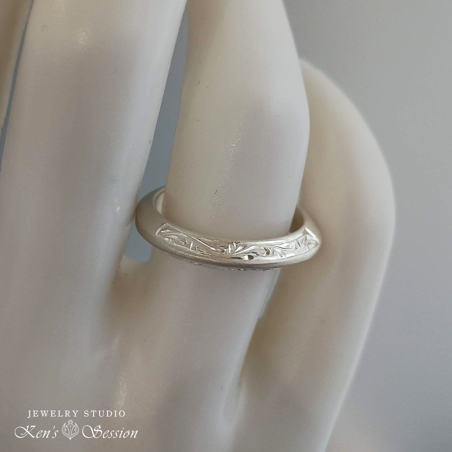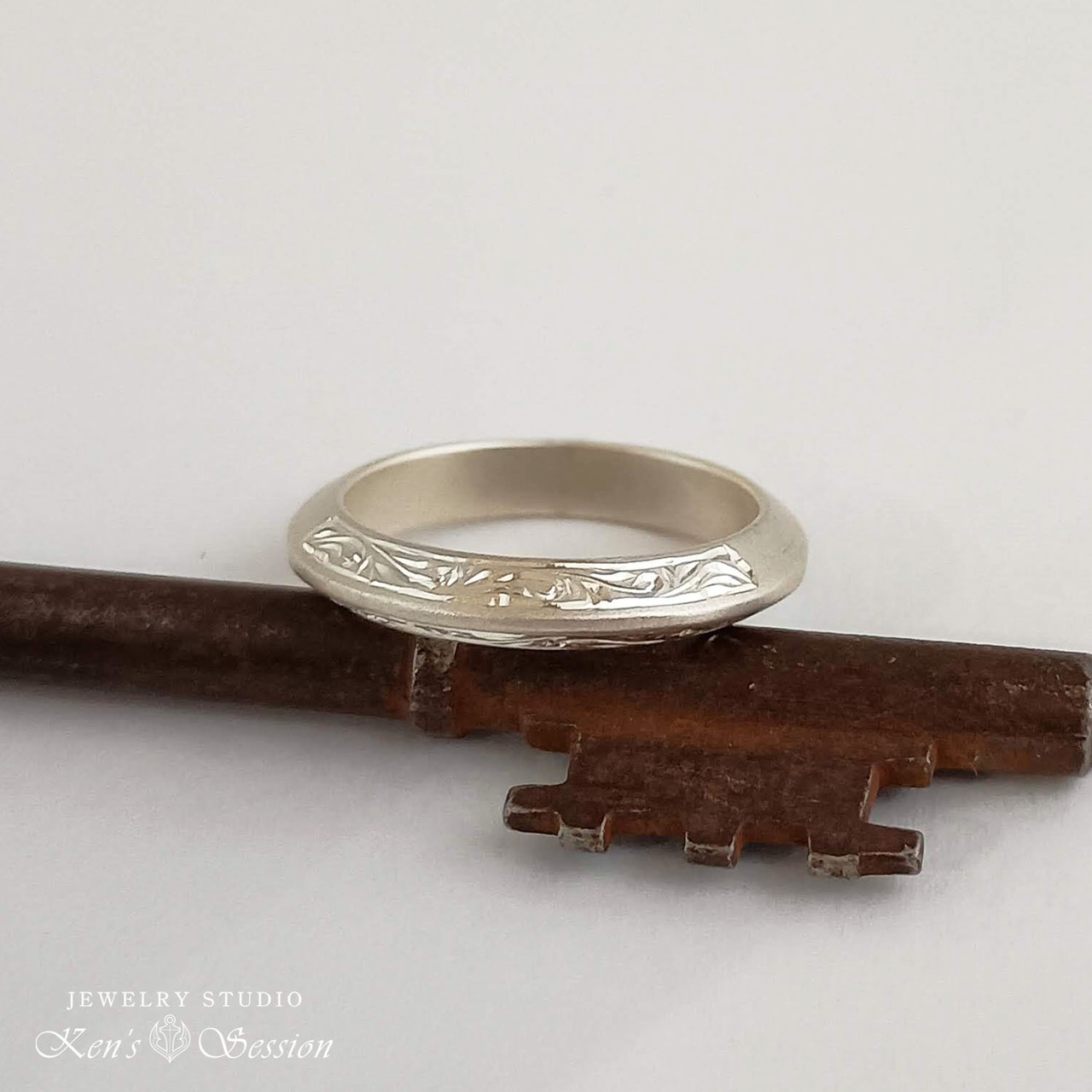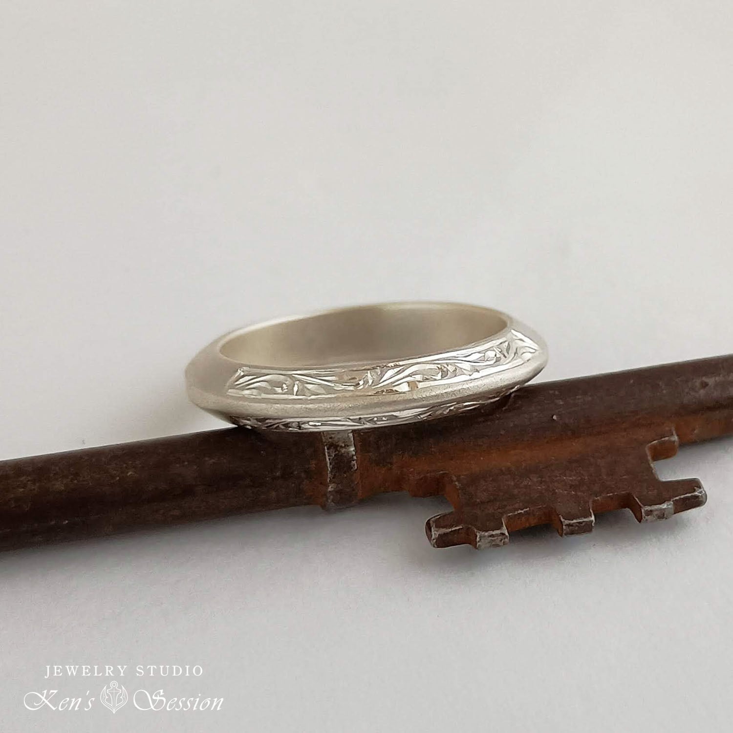 三角形の角線のリングに唐草模様を手彫りにより施されたリングです。