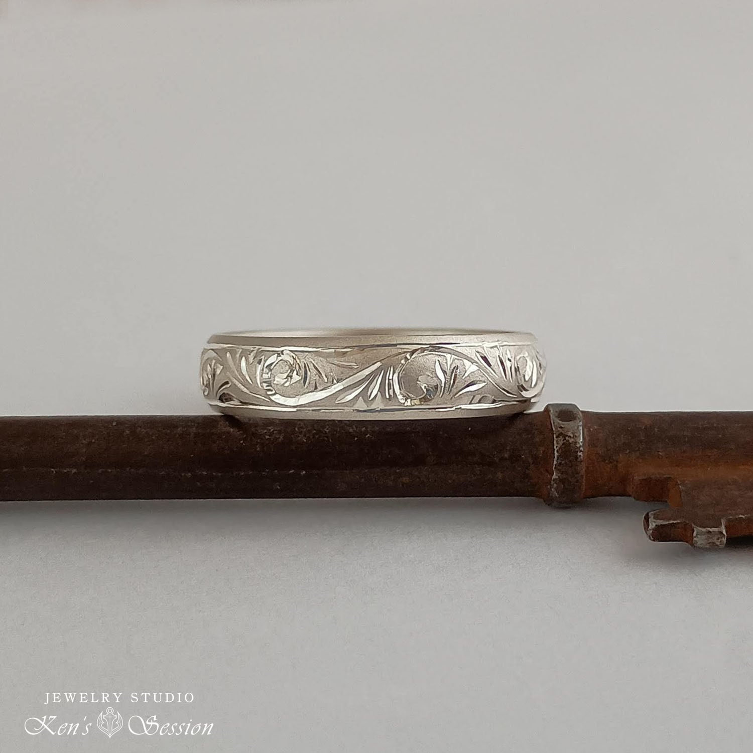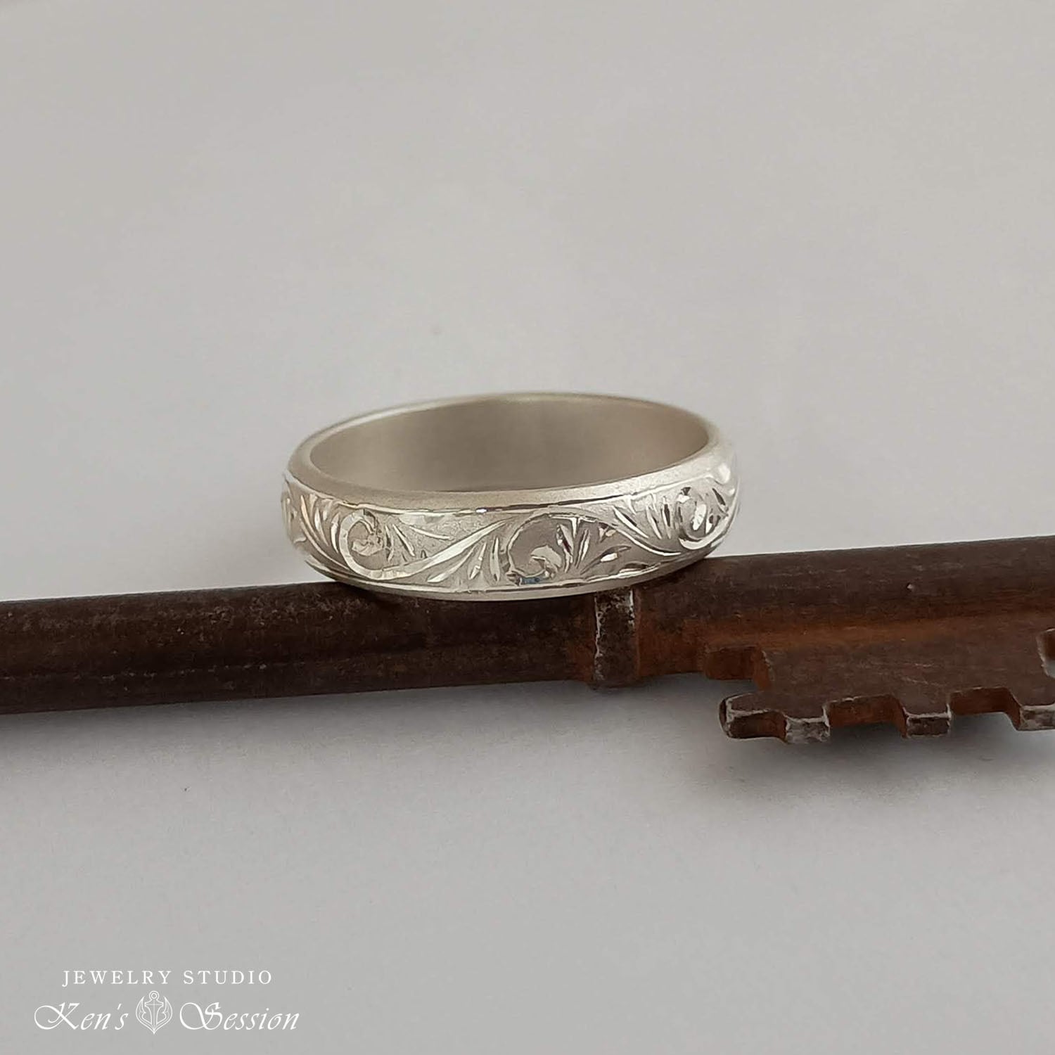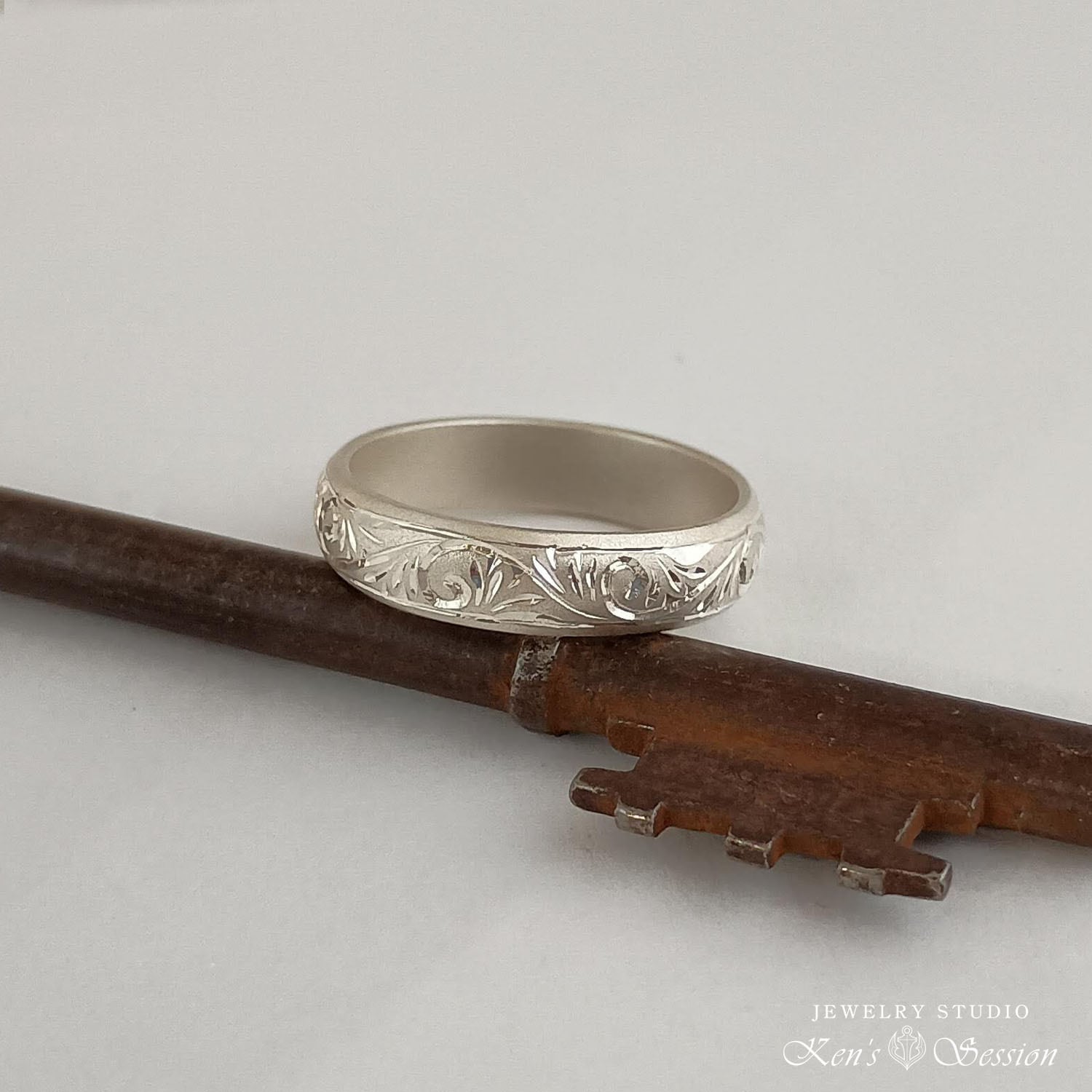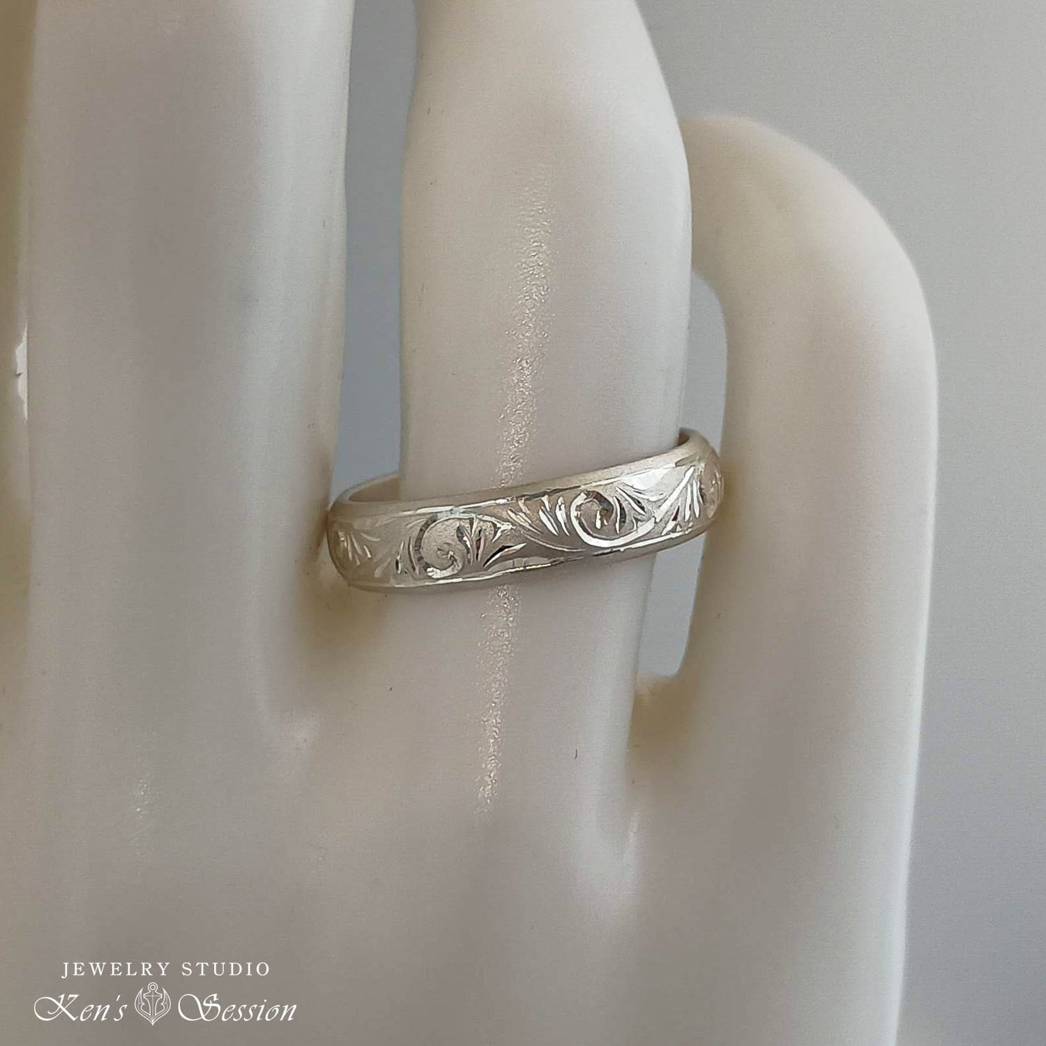 シルバーの甲丸リング(カマボコ型)をベースに、唐草模様を手彫りにより施されたリングです。
