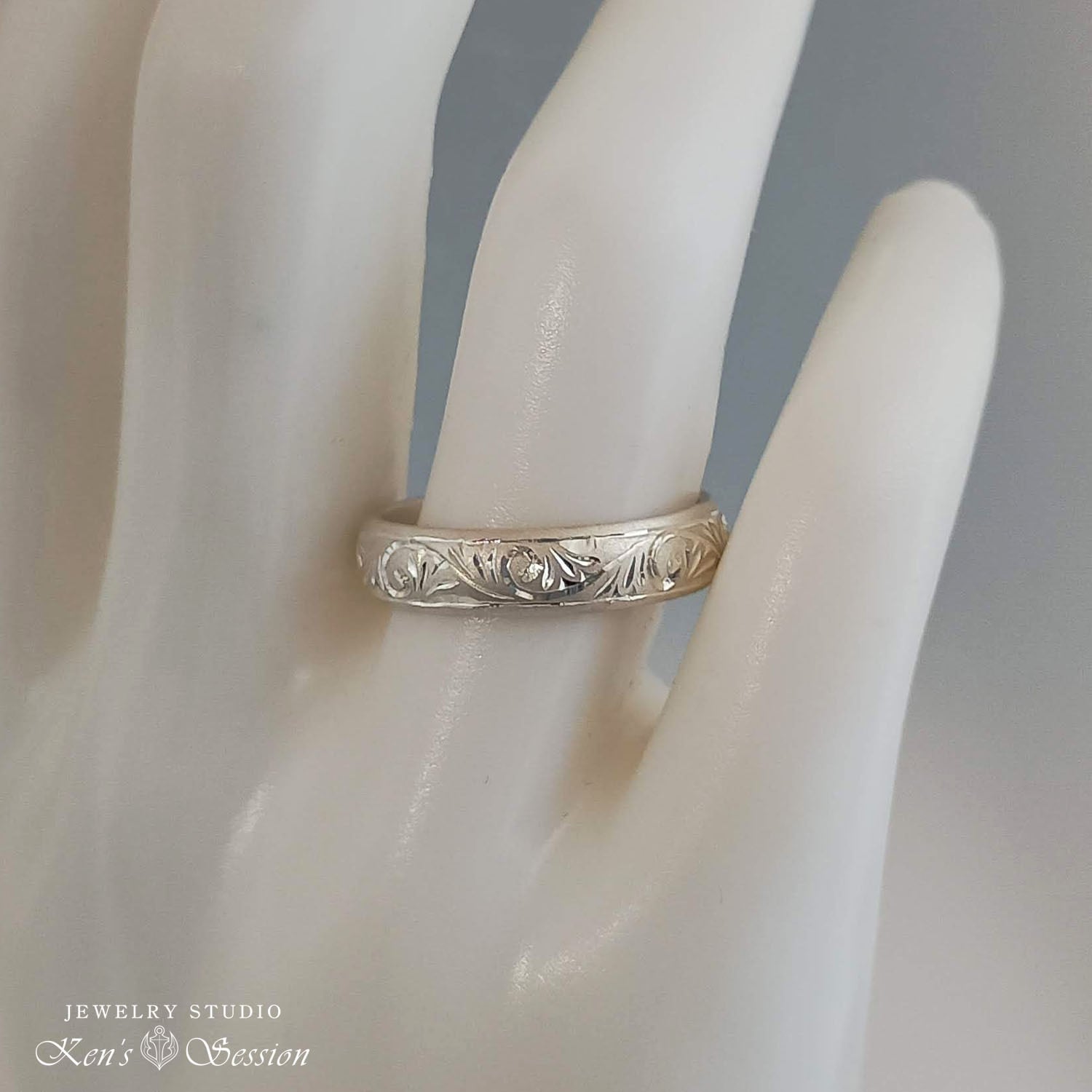 丸いラインが、平打ちベースよりも柔らかい印象になり、表面を梨地(艶消し)仕上げにして唐草模様を彫っているので、彫った部分がキラキラと輝きます。