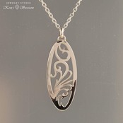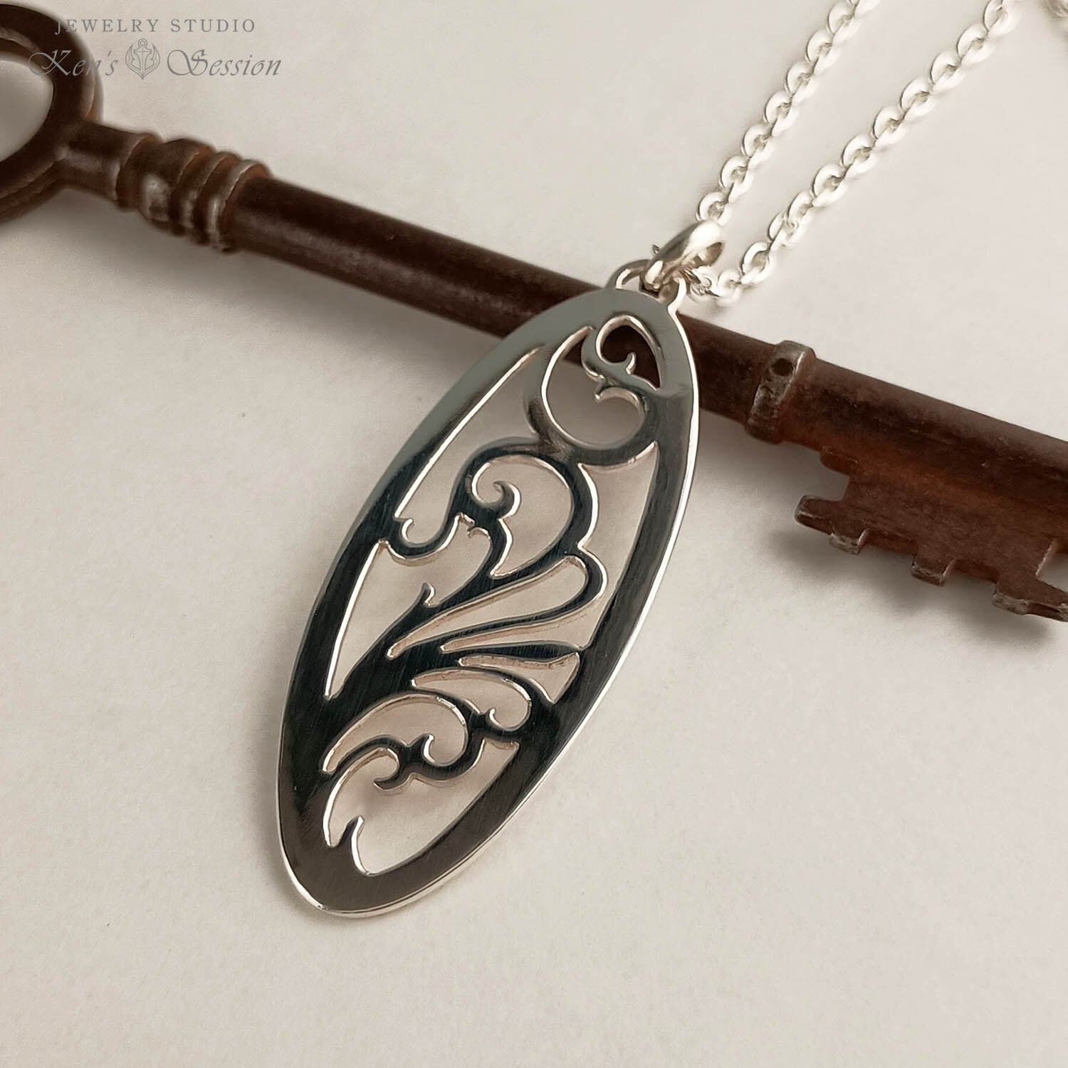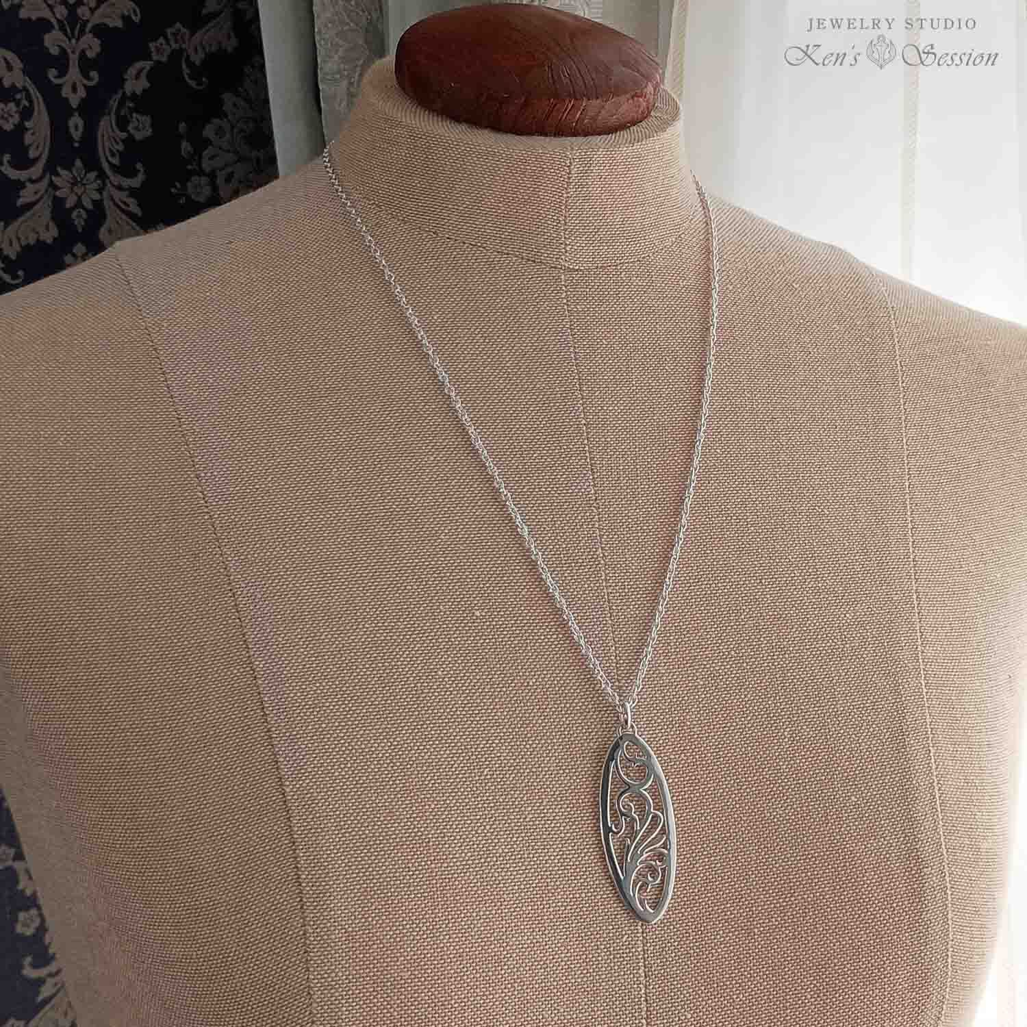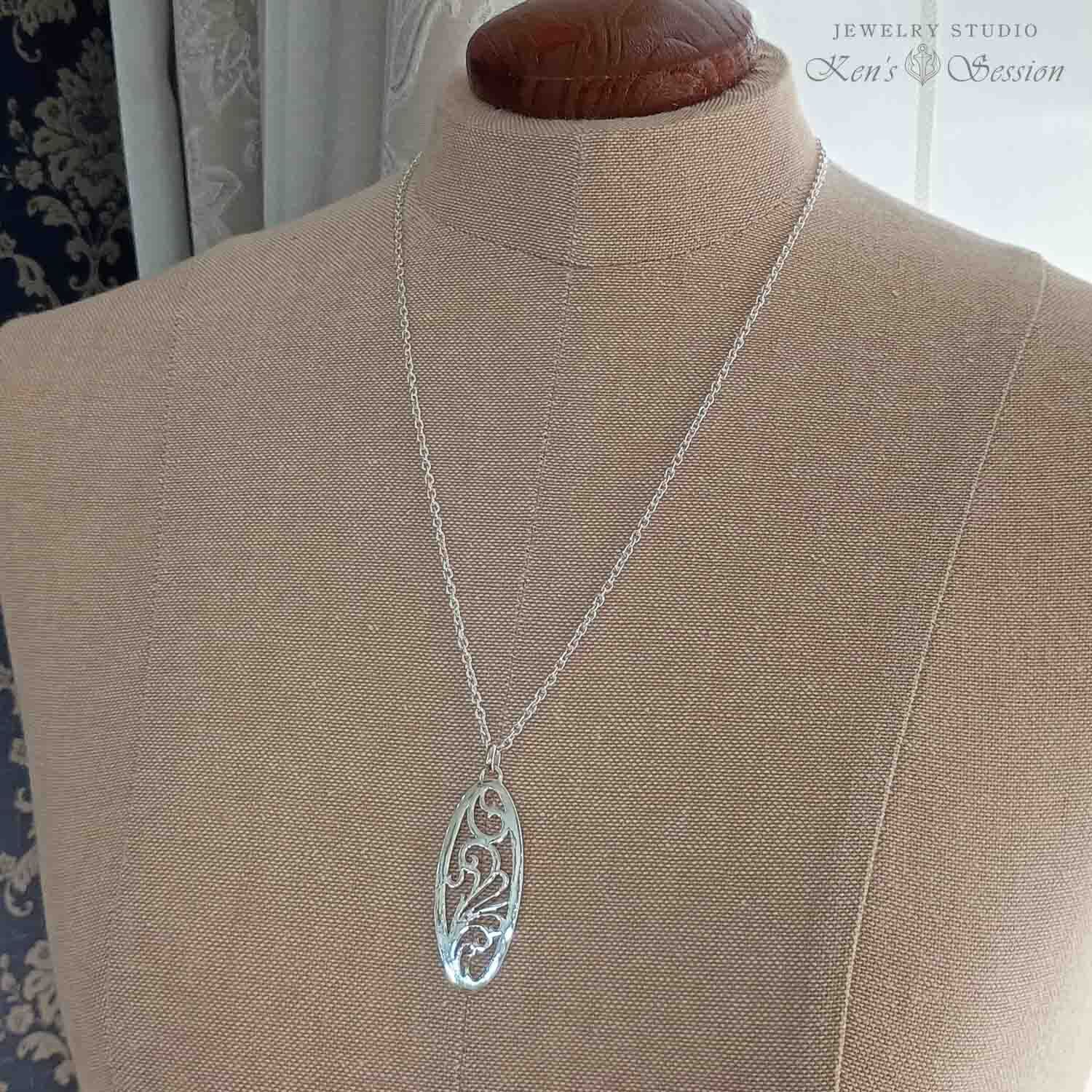 シルバーのプレートに唐草模様を透かしたペンダントです。