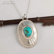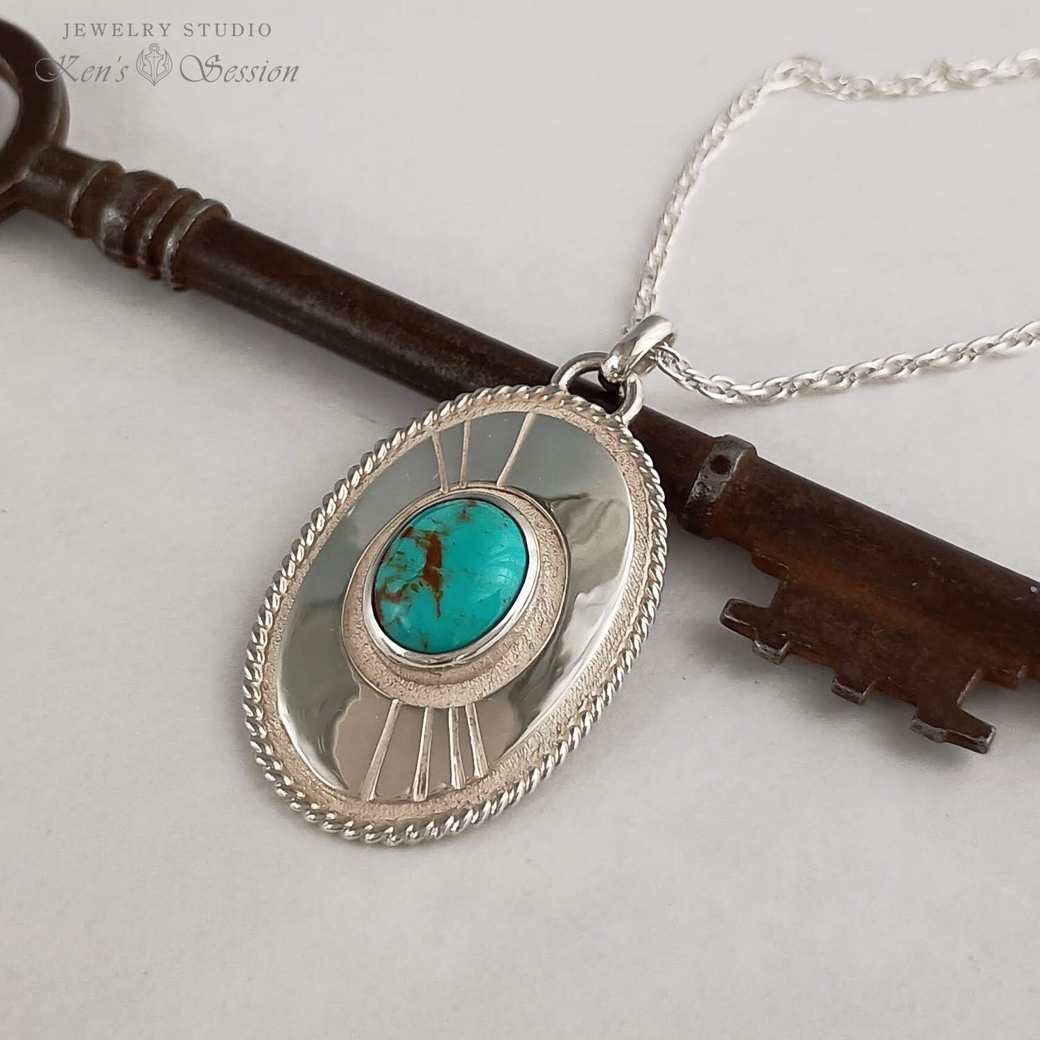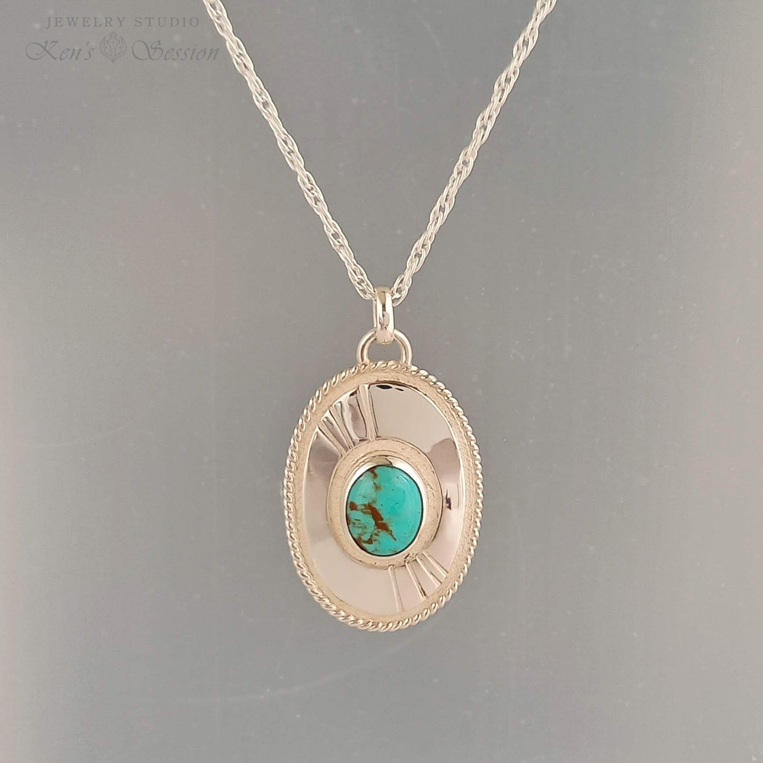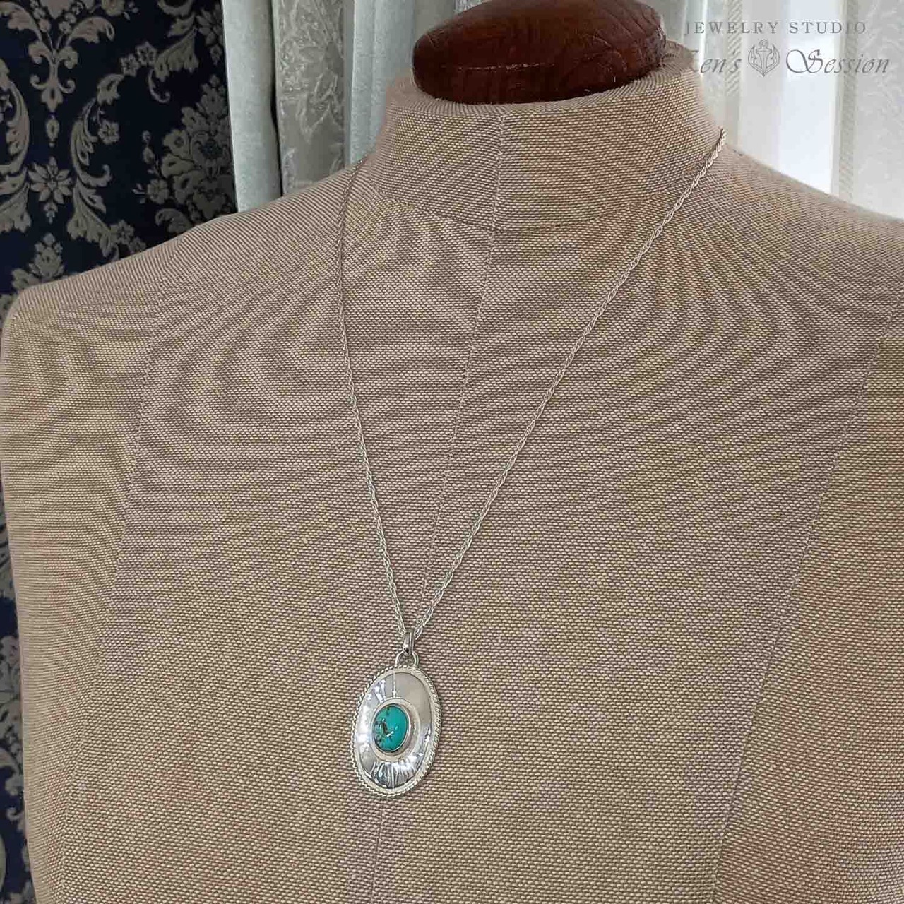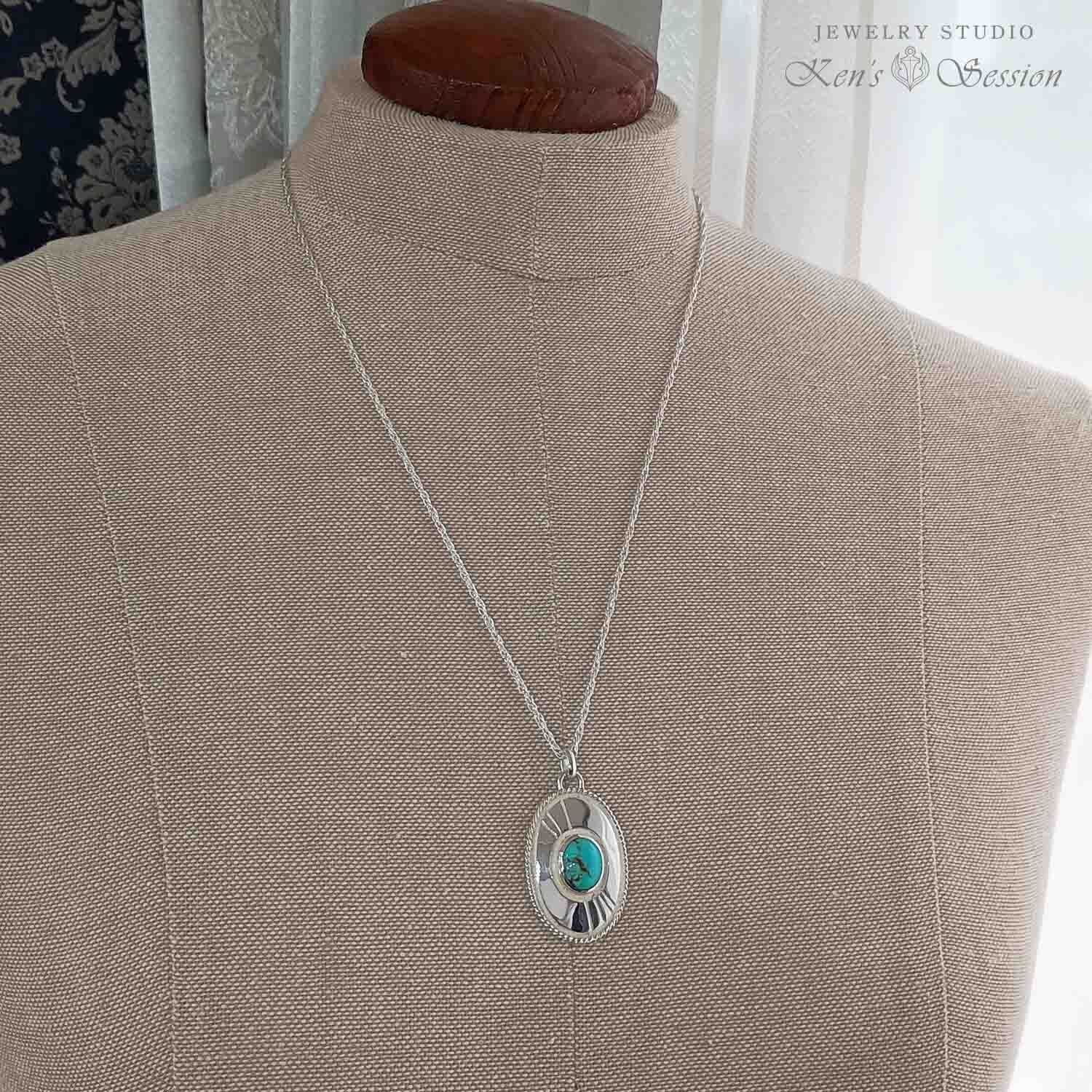 ツイストワイヤーで一周を囲った楕円のベースの中央に、ターコイズを留めたペンダントです。 ターコイズは、アメリカ合衆国アリゾナ州キングマン鉱山で採掘された物で、青の色味とマトリックスが綺麗な石です。 ベースは、貼り合わせをしたプレートタイプで、シンプルなベースはターコイズを引き立てます。
