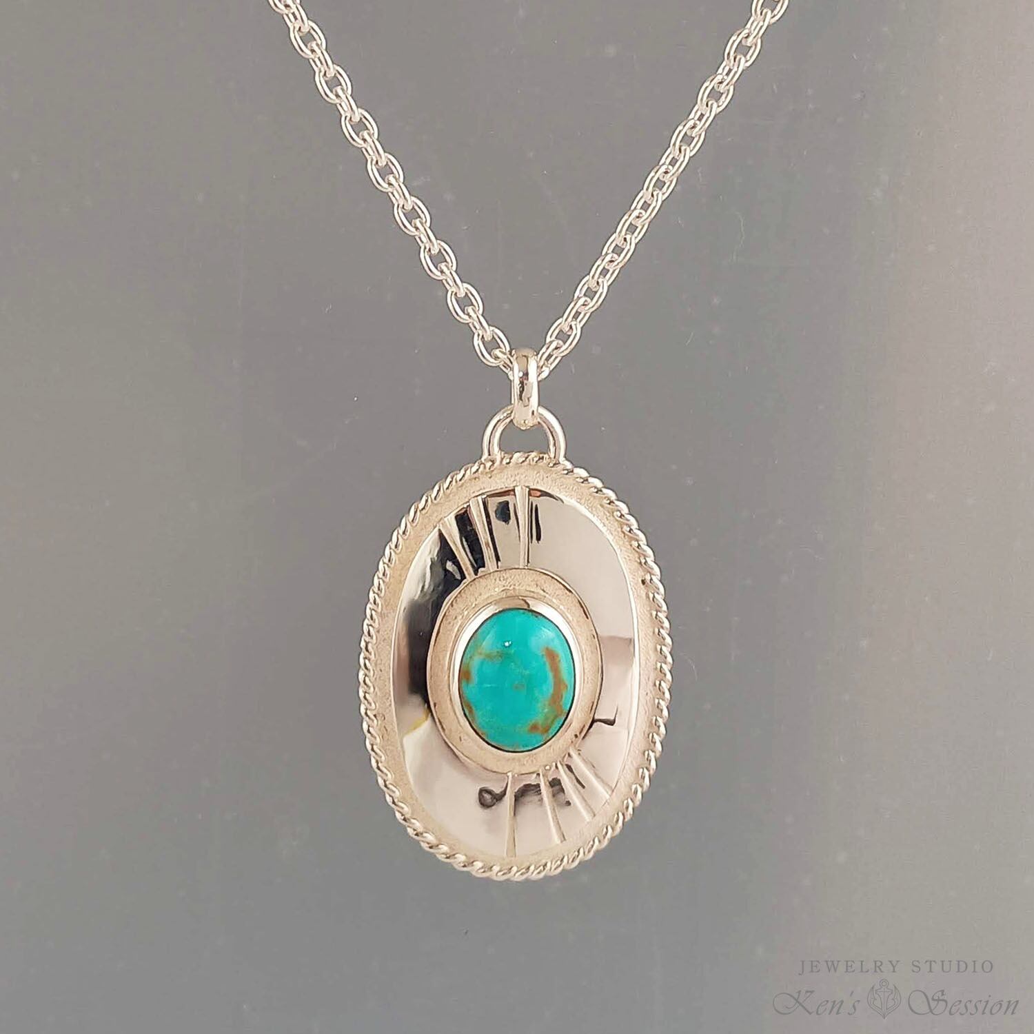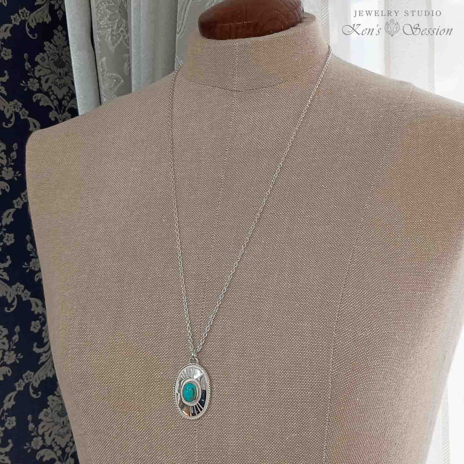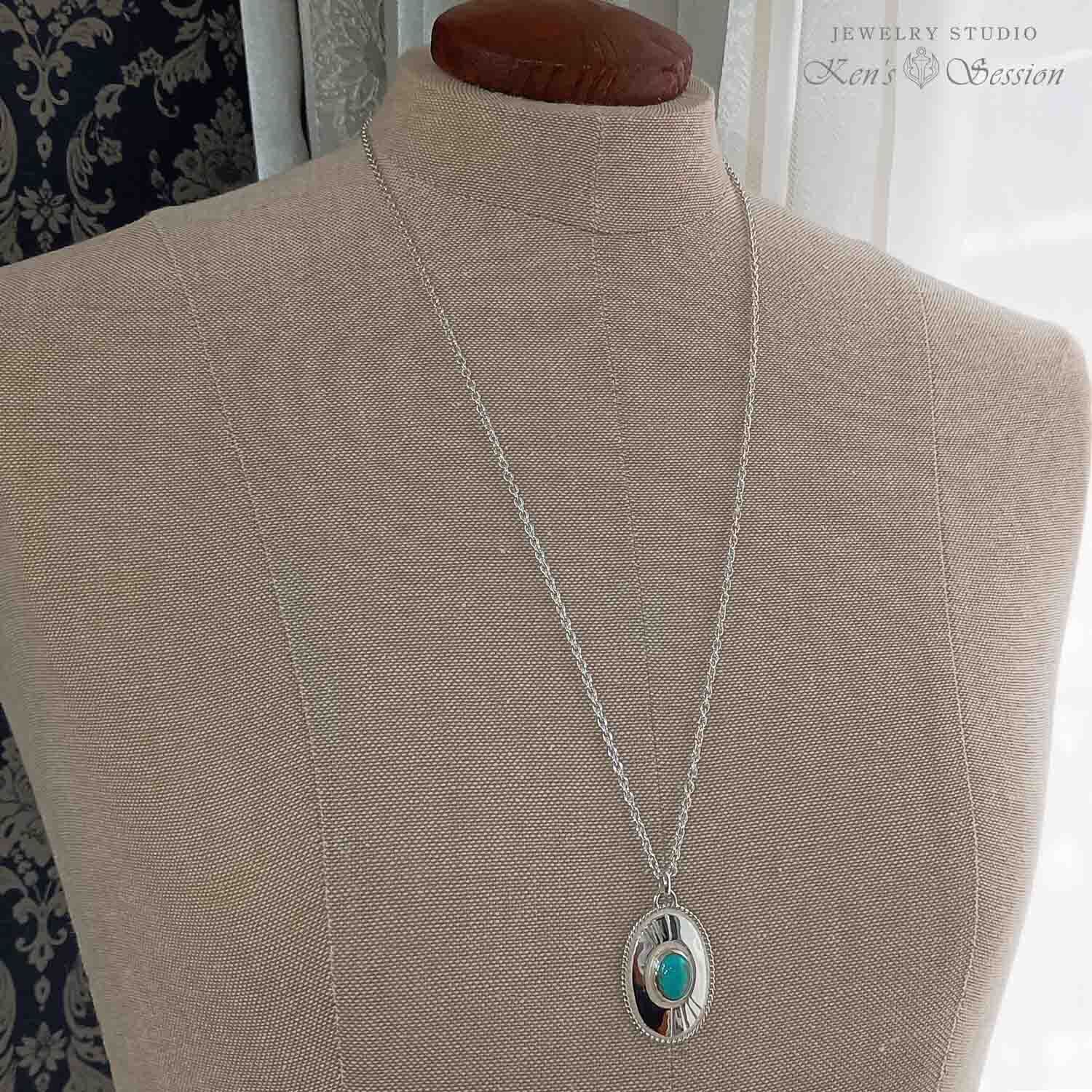 ツイストワイヤーで一周を囲った楕円のベースの中央に、ターコイズを留めたペンダントです。 ターコイズは、アメリカ合衆国アリゾナ州キングマン鉱山で採掘された物で、青の色味とマトリックスが綺麗な石です。 ベースは、貼り合わせをしたプレートタイプで、シンプルなベースはターコイズを引き立てます。