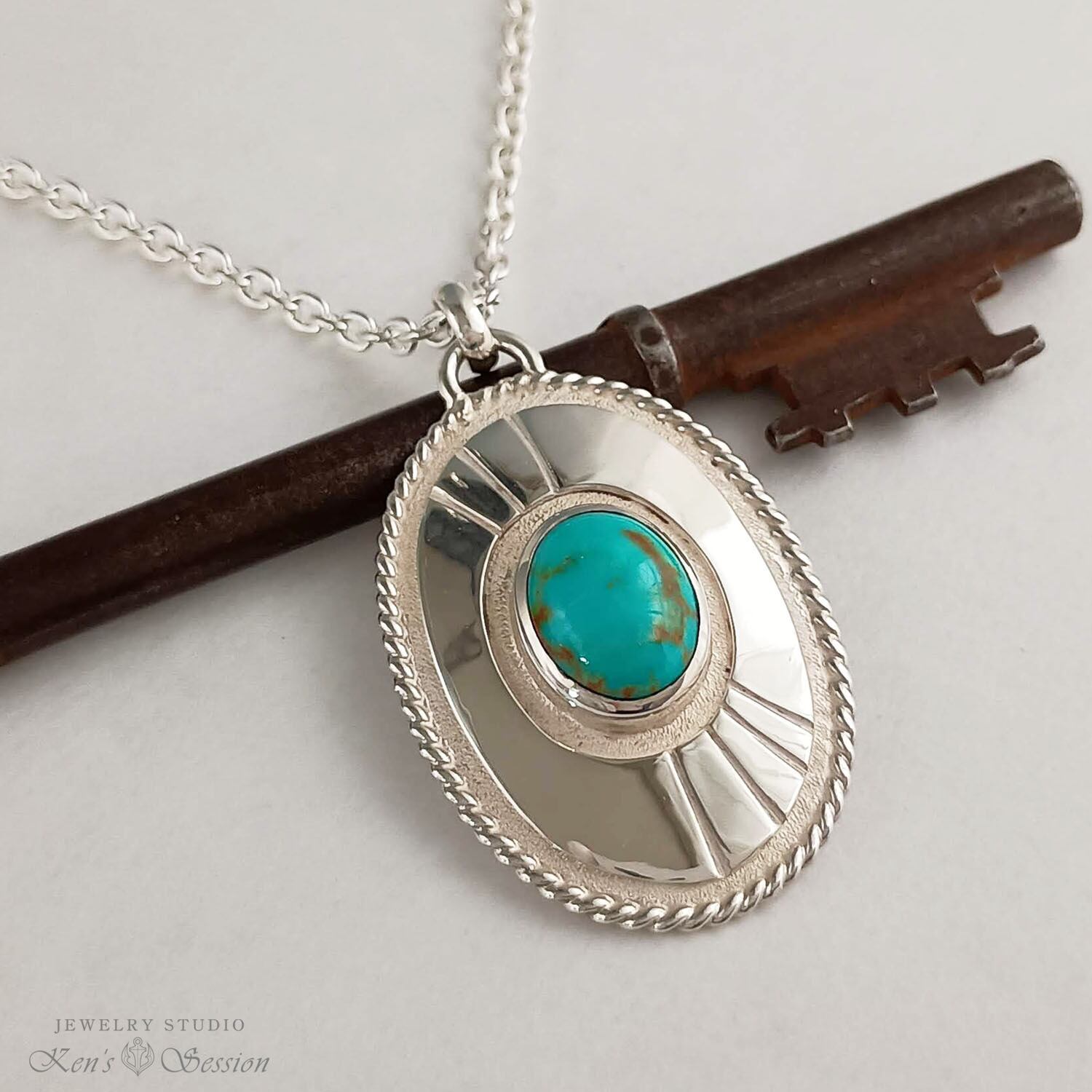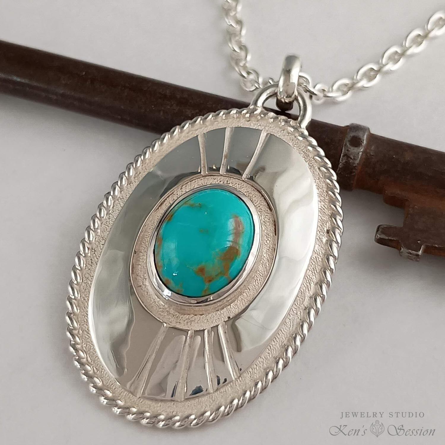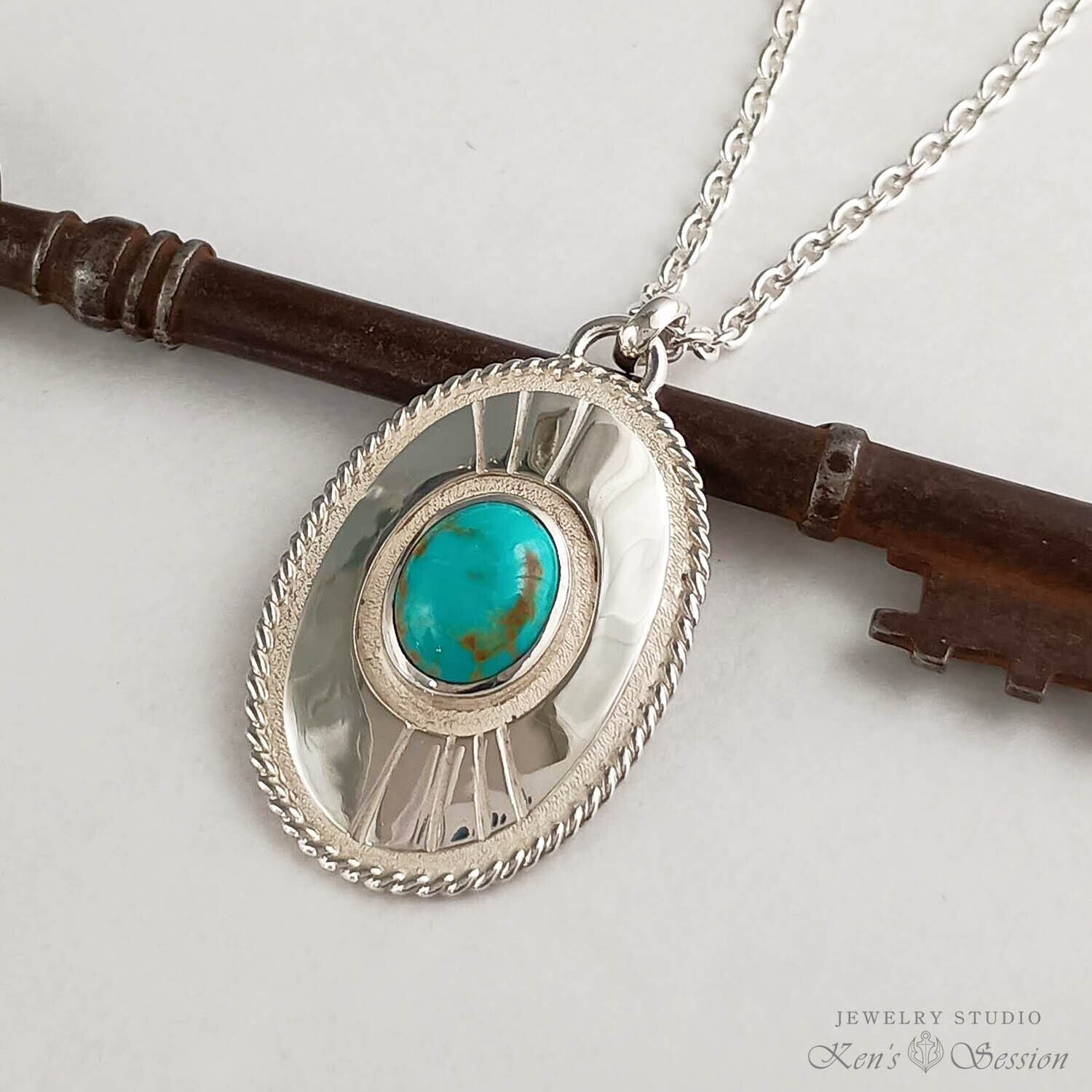 ツイストワイヤーで一周を囲った楕円のベースの中央に、ターコイズを留めたペンダントです。 ターコイズは、アメリカ合衆国アリゾナ州キングマン鉱山で採掘された物で、青の色味とマトリックスが綺麗な石です。 ベースは、貼り合わせをしたプレートタイプで、シンプルなベースはターコイズを引き立てます。