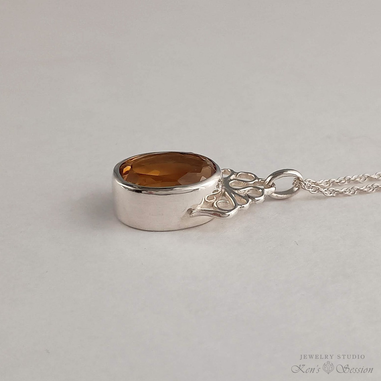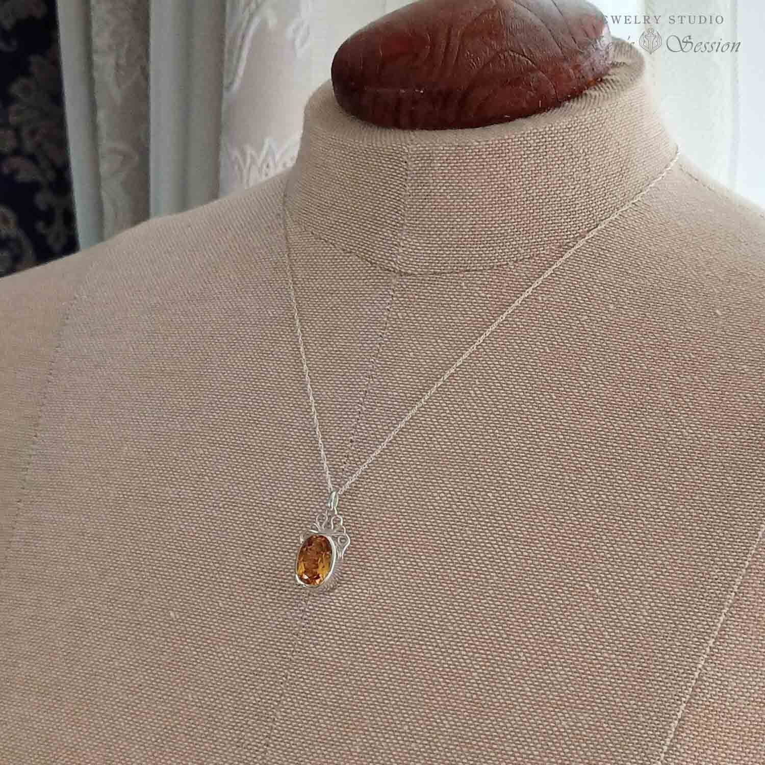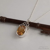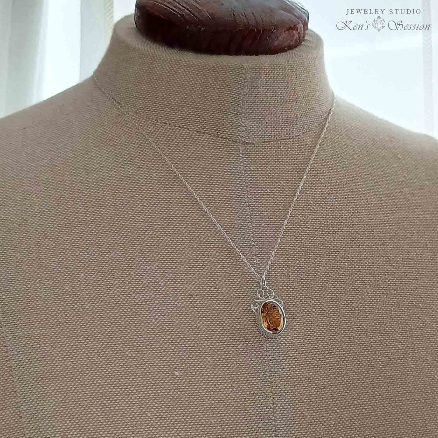 石枠の上部に唐草模様の飾りを付けたペンダントです。 留めたシトリンは濃い目の黄色で、肌馴染みが良いのと、程良く存在感があります。