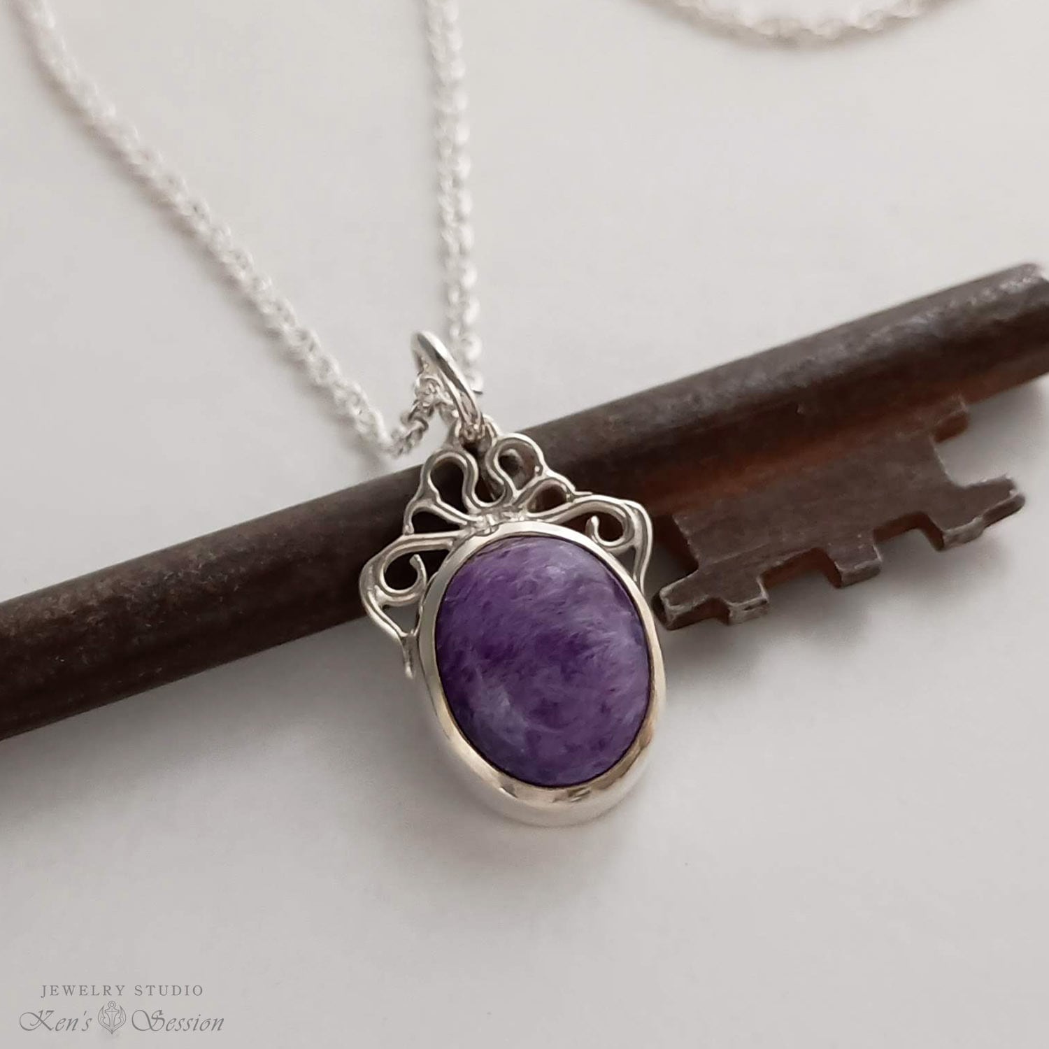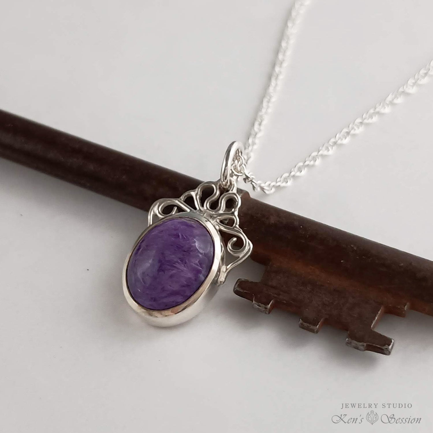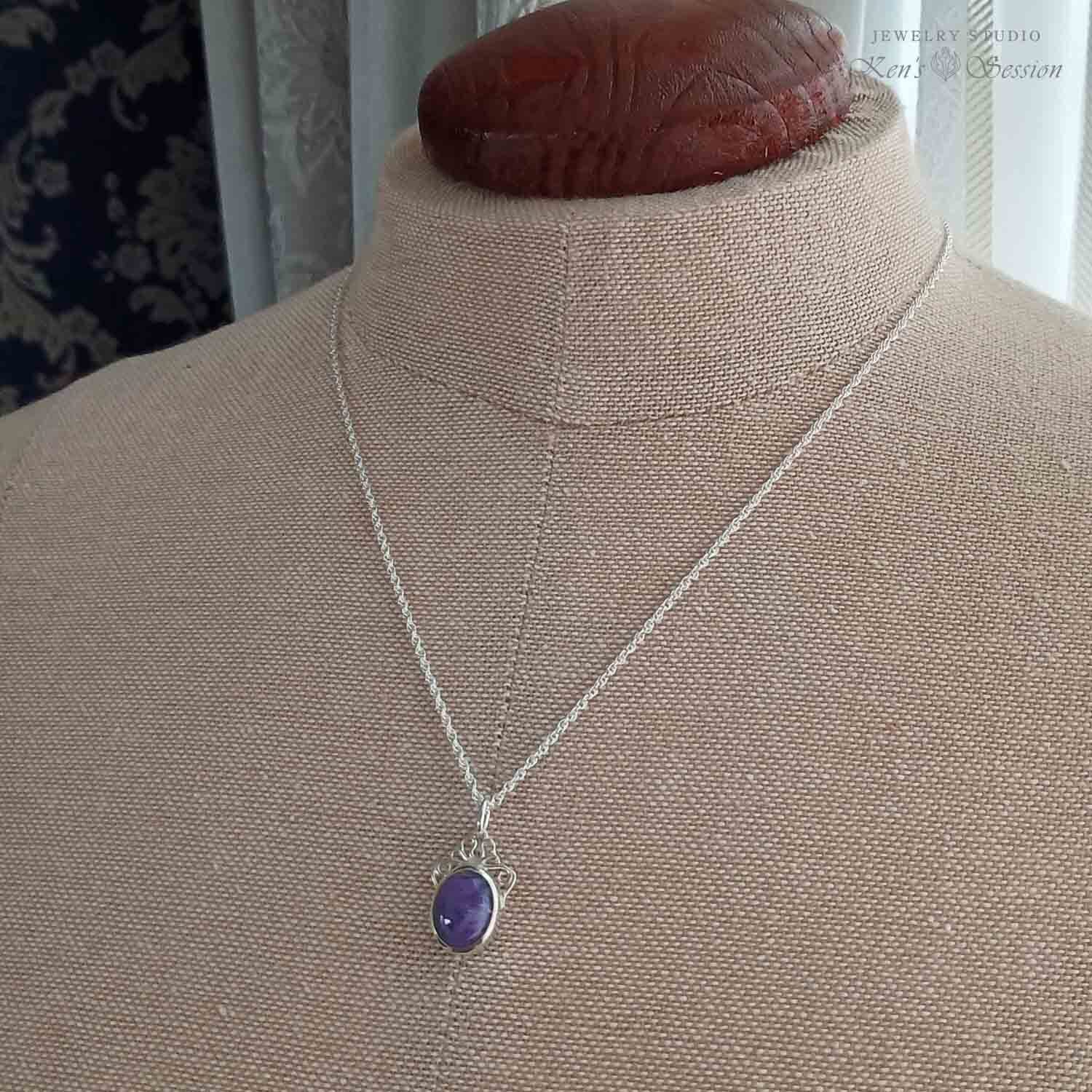 石枠の上部に唐草模様の飾りを付けたペンダントです。 留めたチャロアイトは深く落ち着いた紫の石で、程良く存在感があり人気の色味です。