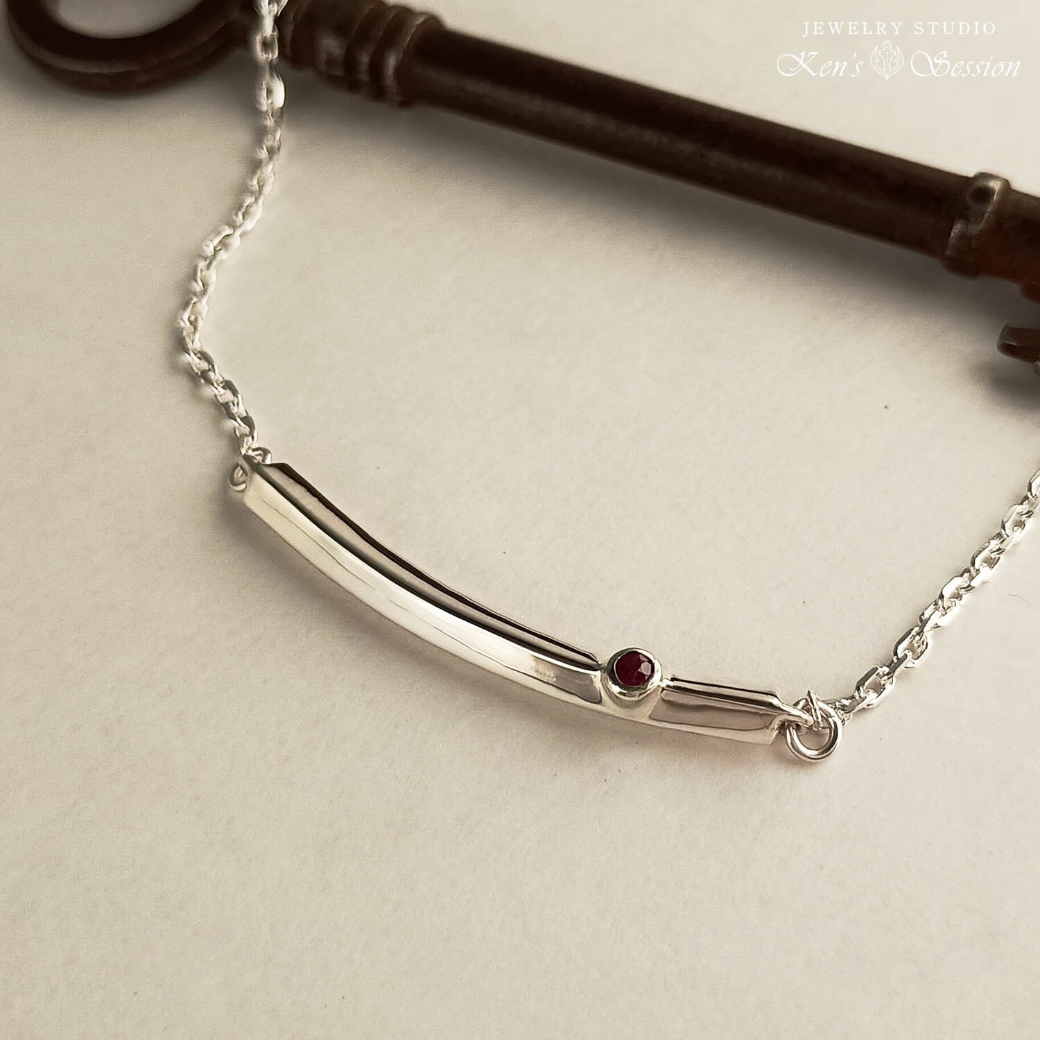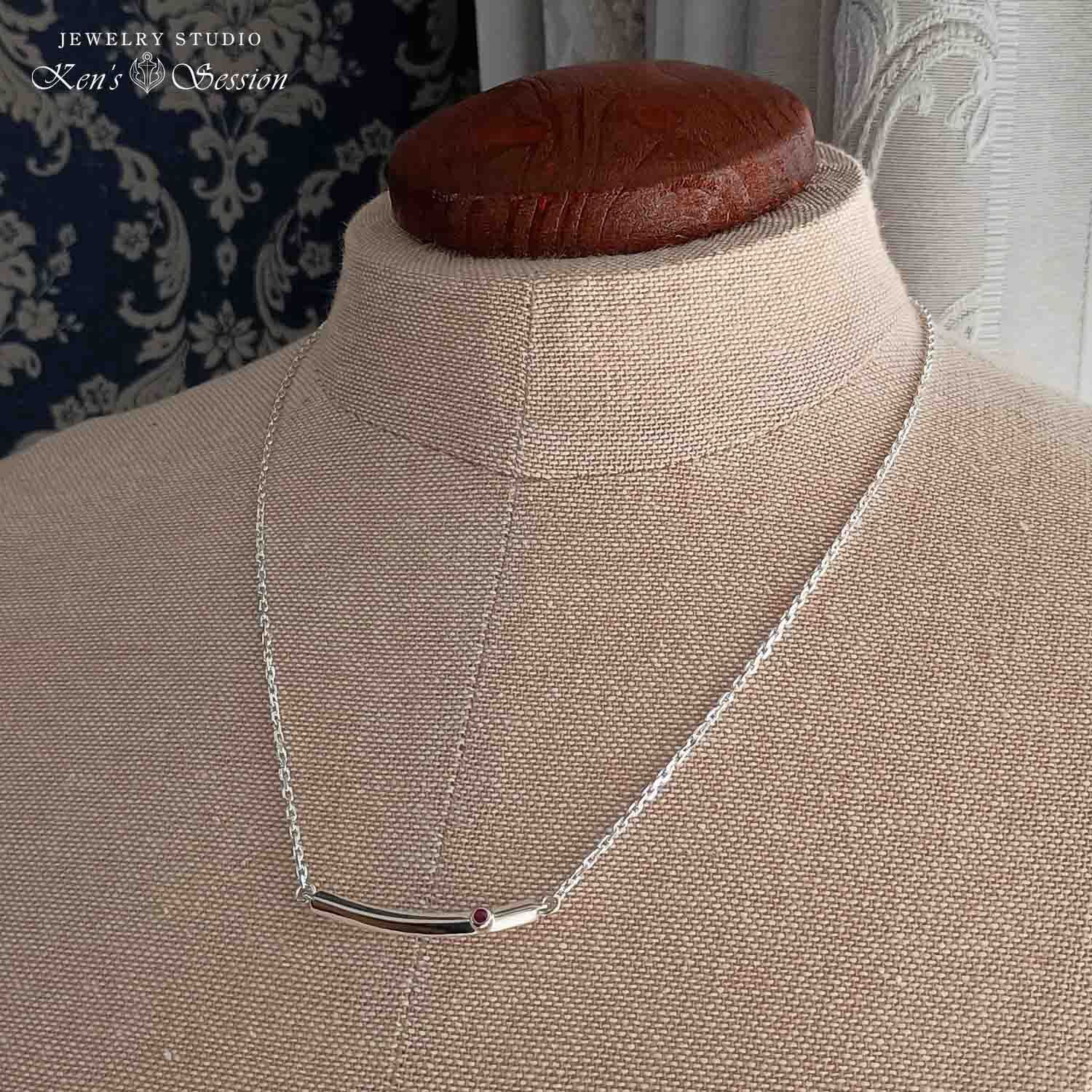 チェーンを左右の両方から吊るタイプで、ペンダント部分が前にある以上、金具が前にくる心配がないので、気楽に着けて楽しめます。 シンプルなデザインにさり気ないルビーが輝くネックレスです。 手仕事のジュエリーを首元で楽しみたい方に身に着けていただきたいジュエリーです。