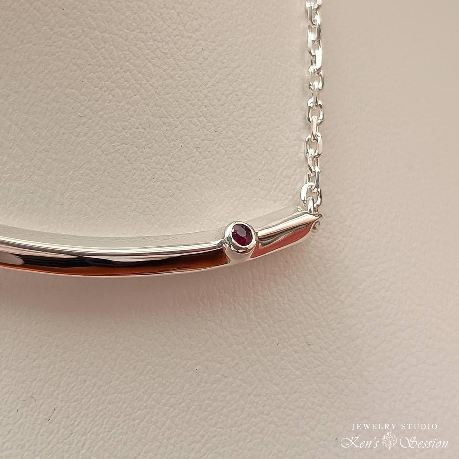ダイヤ型の角線に、ワンポイントのルビーを留めたネックレスです。