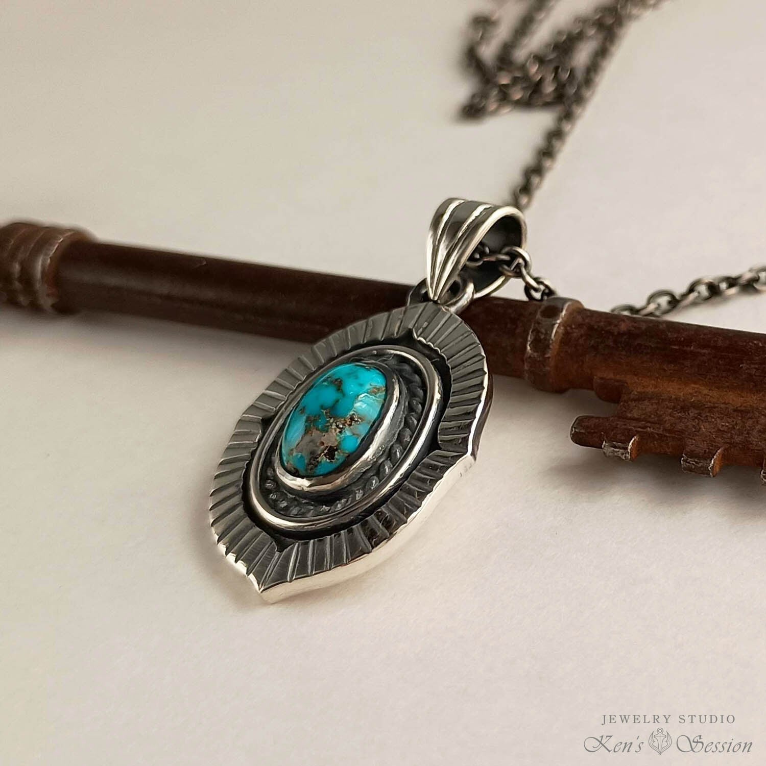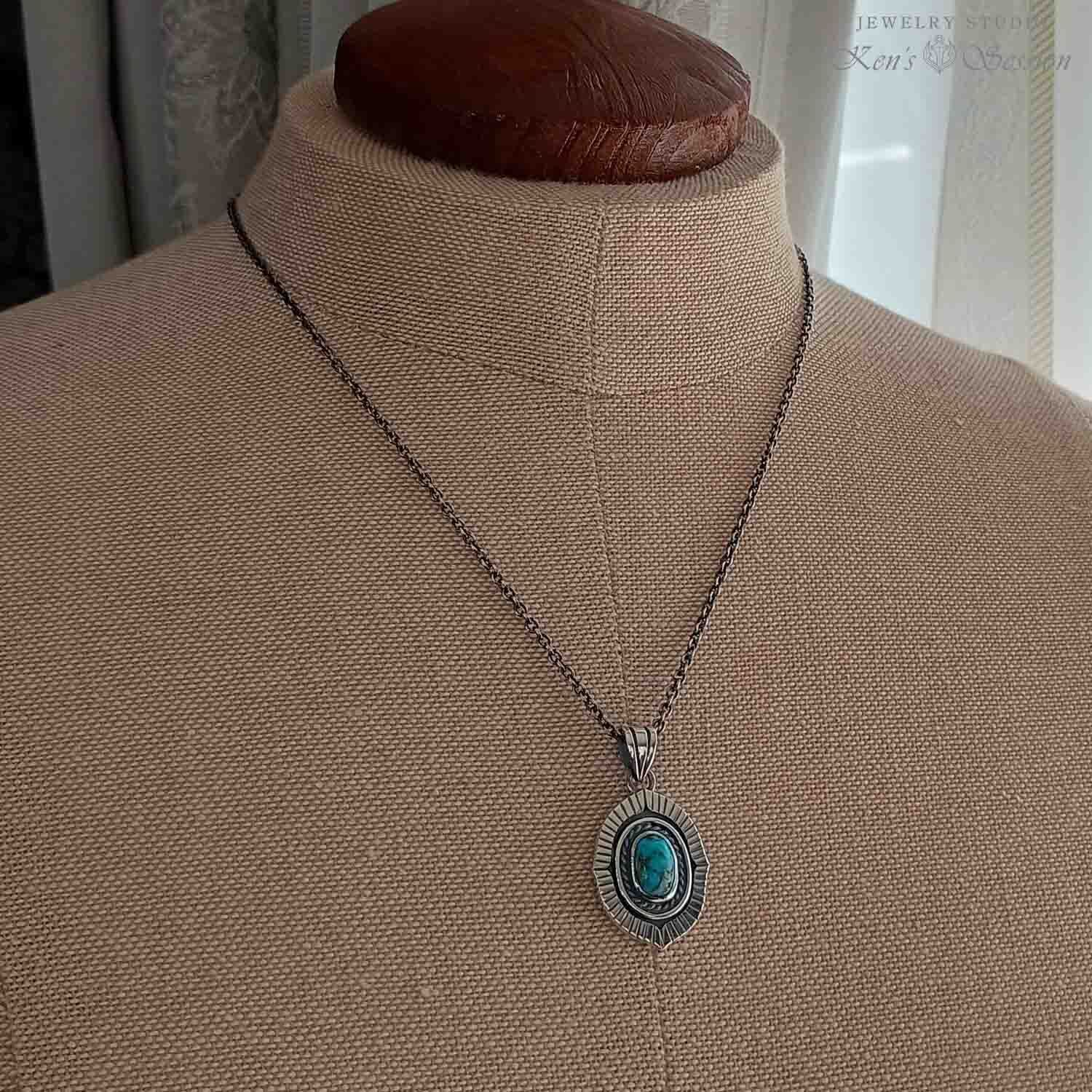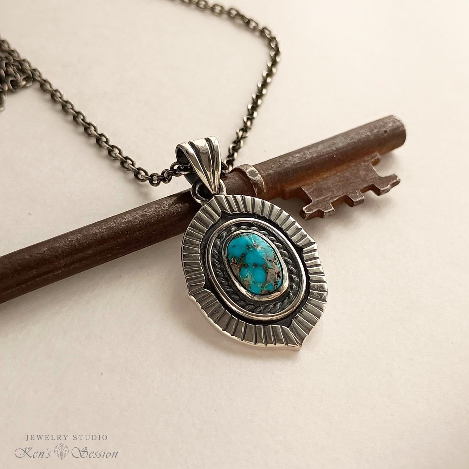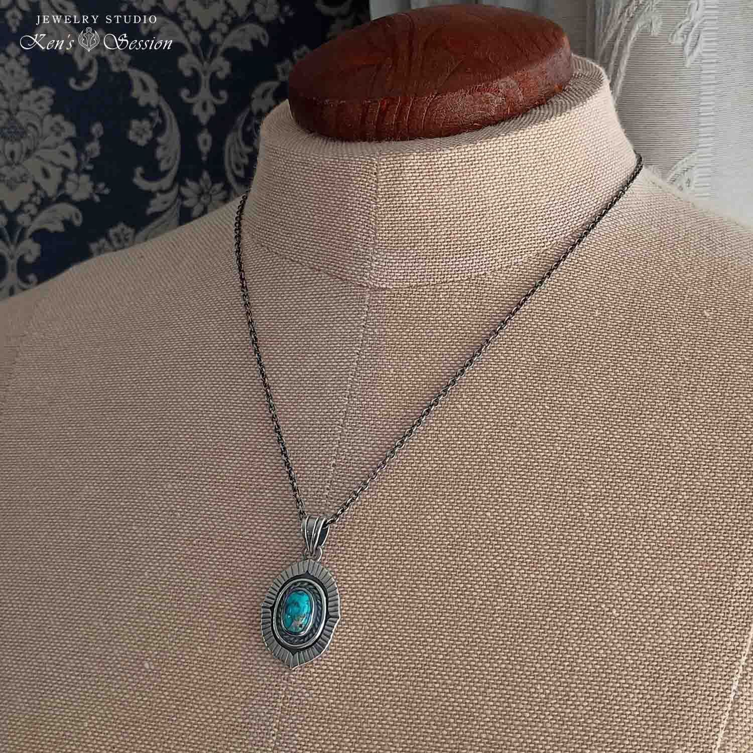 鮮やかな青が美しいターコイズをシルバーのベースに留めたペンダントです。 ターコイズは、アメリカ合衆国アリゾナ州キングマン鉱山で採掘された物で、黒仕上げしたベースに濃い青が映えます。 周りの放射状に溝が入っている部分も含めて、石周りの装飾を多く入れたので、手作りの凝ったペンダントとなりました。手仕事のジュエリーを首元で楽しみたい方に身に着けていただきたいジュエリーです。