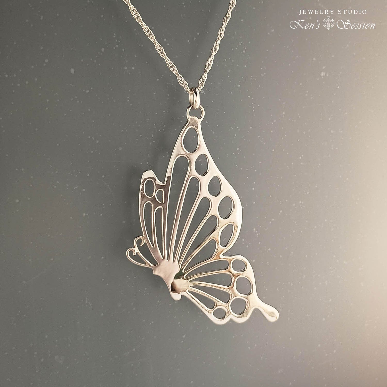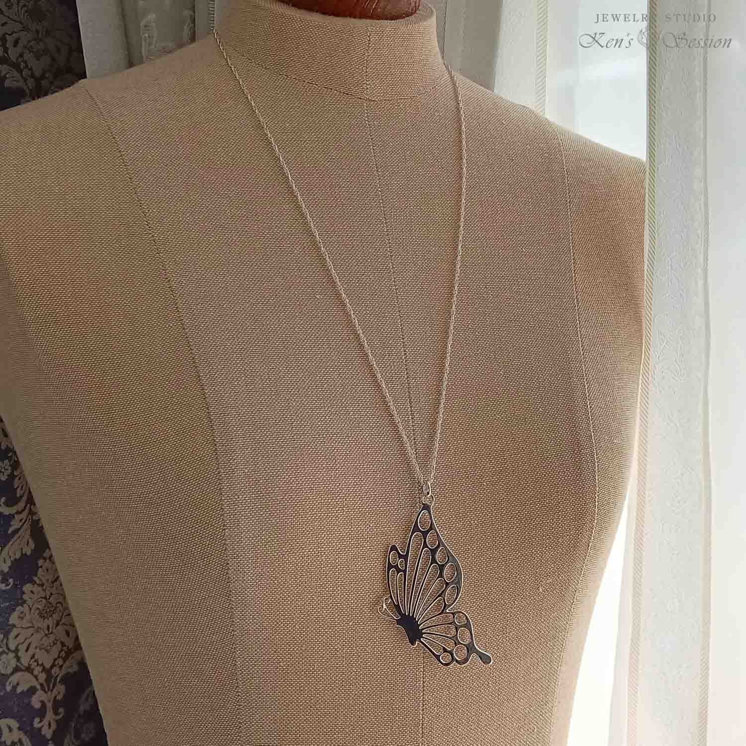 シルバーのプレートに蝶の柄を透かしたペンダントです。 彫金の透かし技法と呼ばれる、柄を一つ一つ糸鋸で切り抜いていく方法で、丁寧に制作しております。 優雅に花の周りを飛ぶ蝶をイメージして制作しました。 ロングネックレスにお勧めの、大きめのペンダントになりますので、このジュエリーを一つ着ければコーディネートが完成する存在感があります。 手仕事による透かしの輝きを、洋服を選ばずに楽しみたい方にお勧めです。