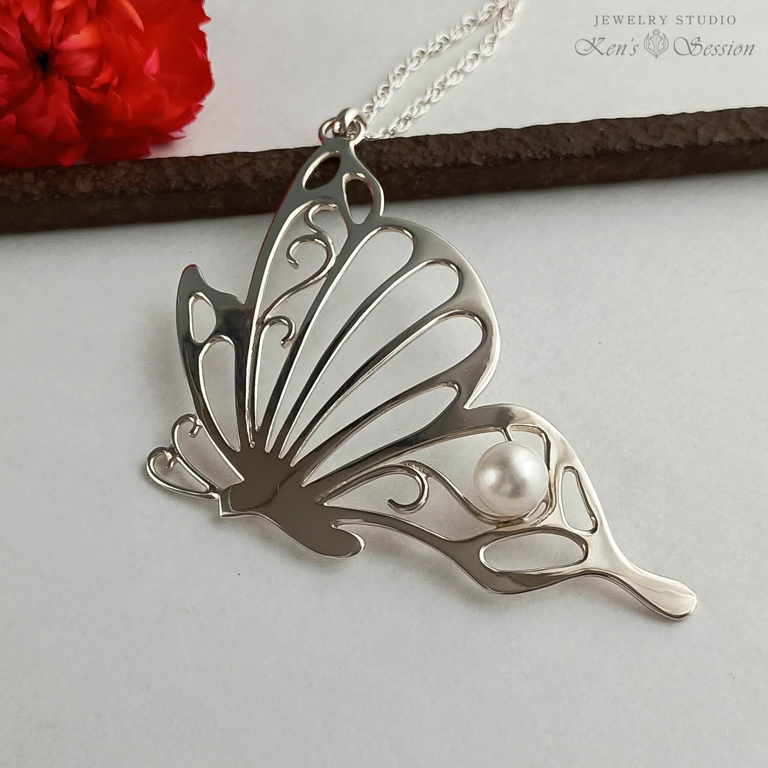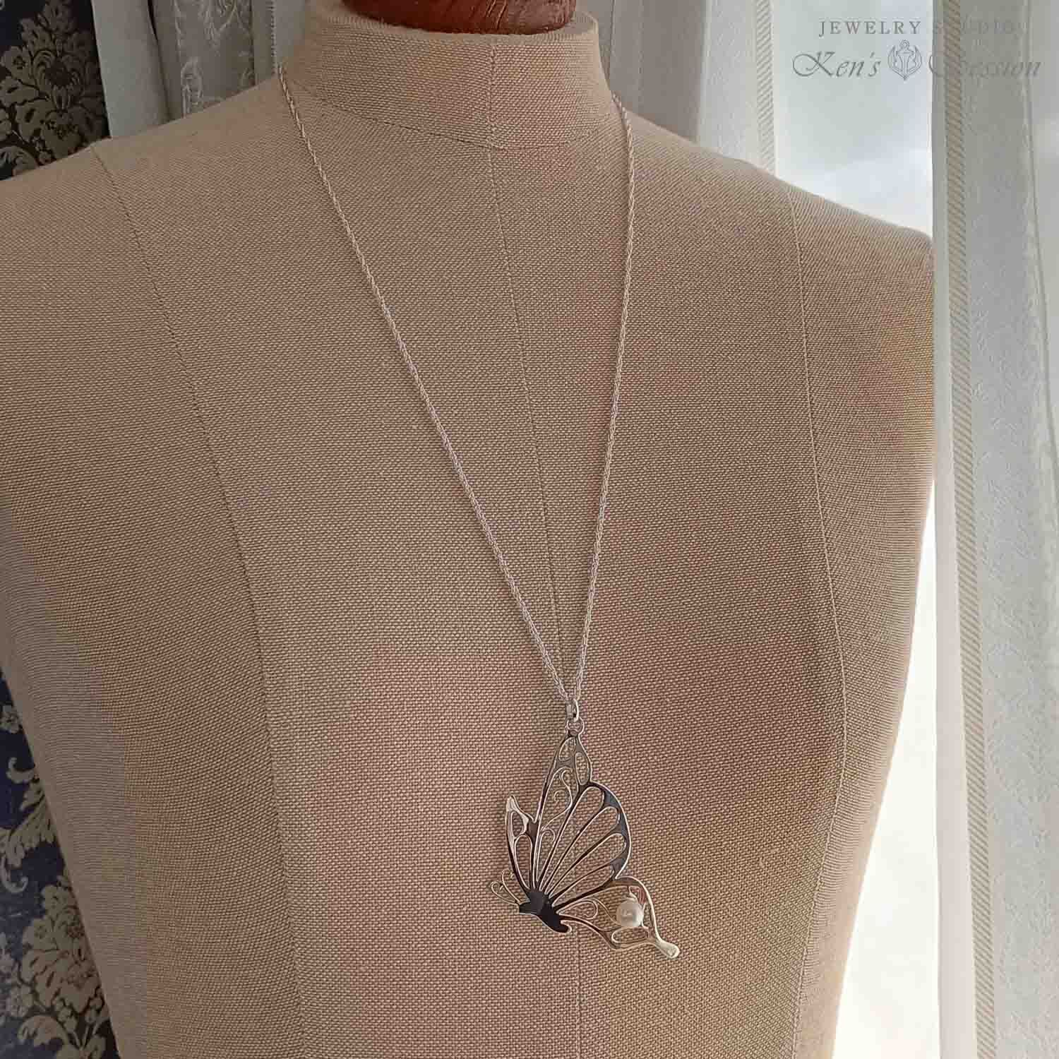 シルバーのプレートに蝶の柄を透かし、アクセントにアコヤ真珠を留めたペンダントです。 彫金の透かし技法と呼ばれる、柄を一つ一つ糸鋸で切り抜いていく方法で、丁寧に制作しております。 優雅に花の周りを飛ぶ蝶をイメージして制作しました。 ロングネックレスにお勧めの、大きめのペンダントになりますので、このジュエリーを一つ着ければコーディネートが完成する存在感があります。 手仕事による透かしの輝きを、洋服を選ばずに楽しみたい方にお勧めです。
