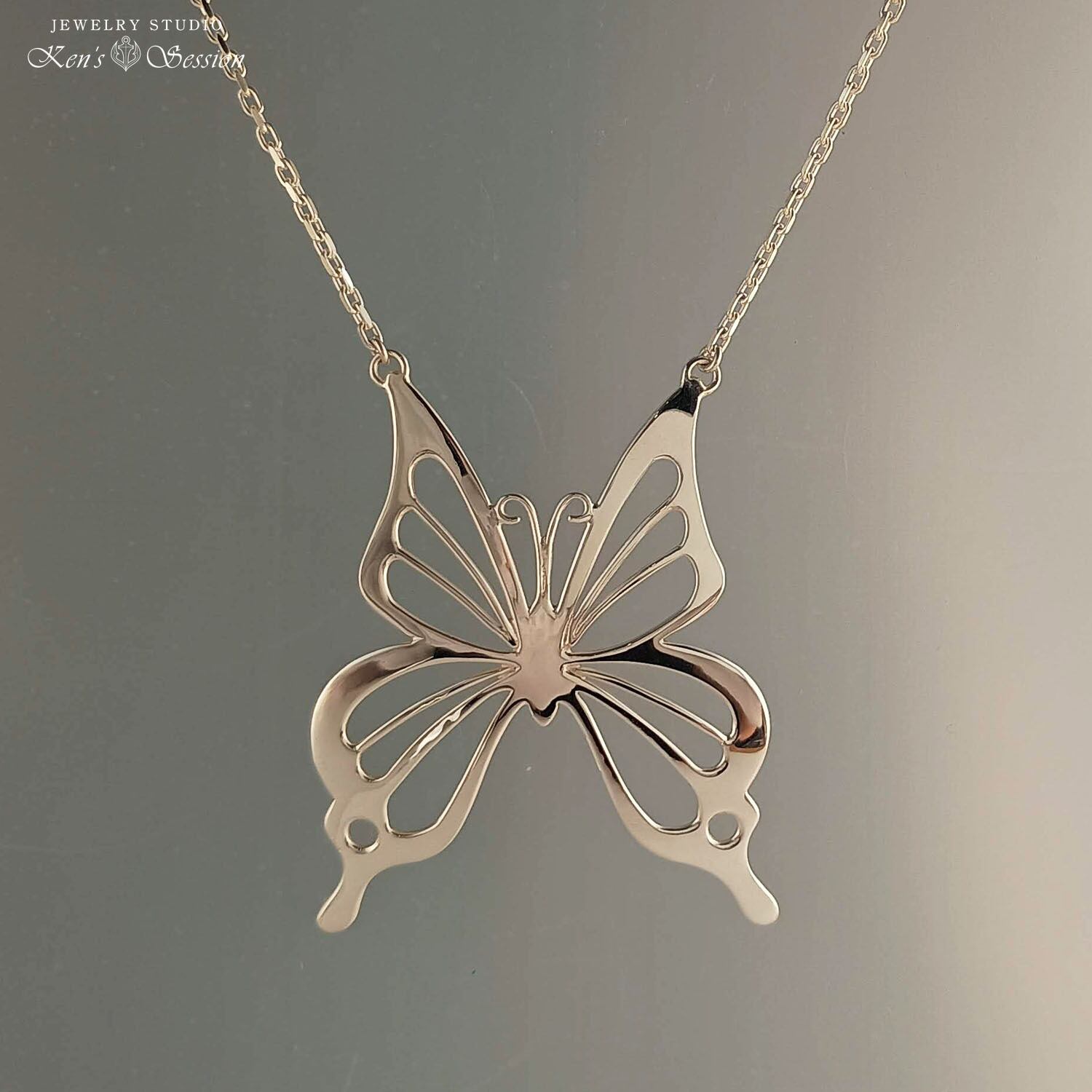 シルバーのプレートに蝶の柄を透かしたペンダントです。 彫金の透かし技法と呼ばれる、柄を一つ一つ糸鋸で切り抜いていく方法で、丁寧に制作しております。 蝶が優雅に力強く羽ばたく姿をイメージして制作しました。 チェーンを左右の両方から吊るタイプで、ペンダント部分が前にある以上、金具が前にくる心配がないので、気楽に着けて楽しめます。存在感がある、手仕事による透かしの輝きを、洋服を選ばずに楽しみたい方にお勧めです。