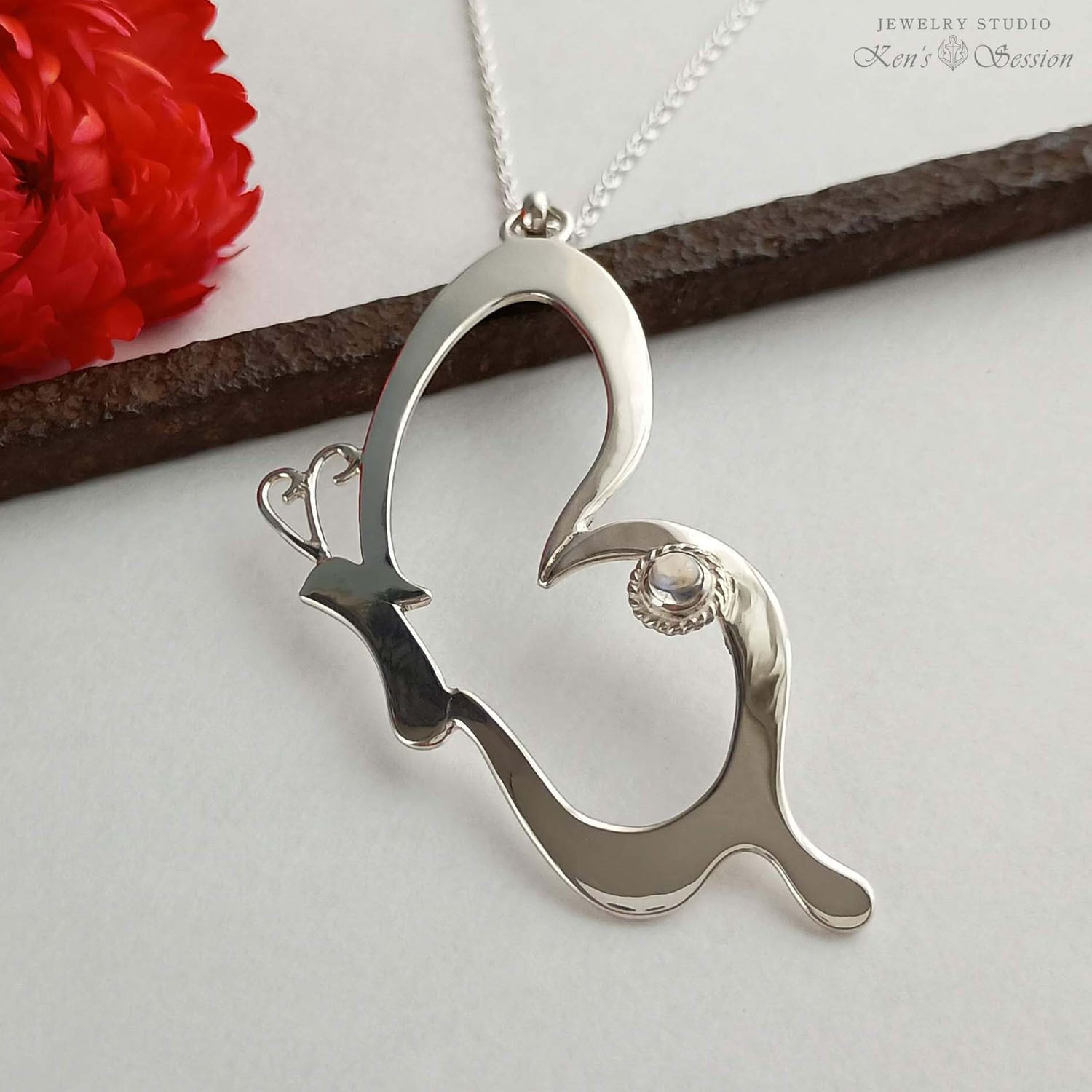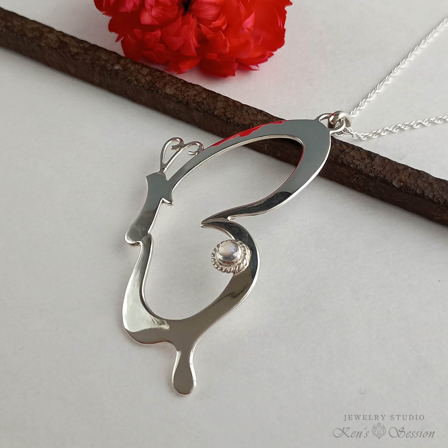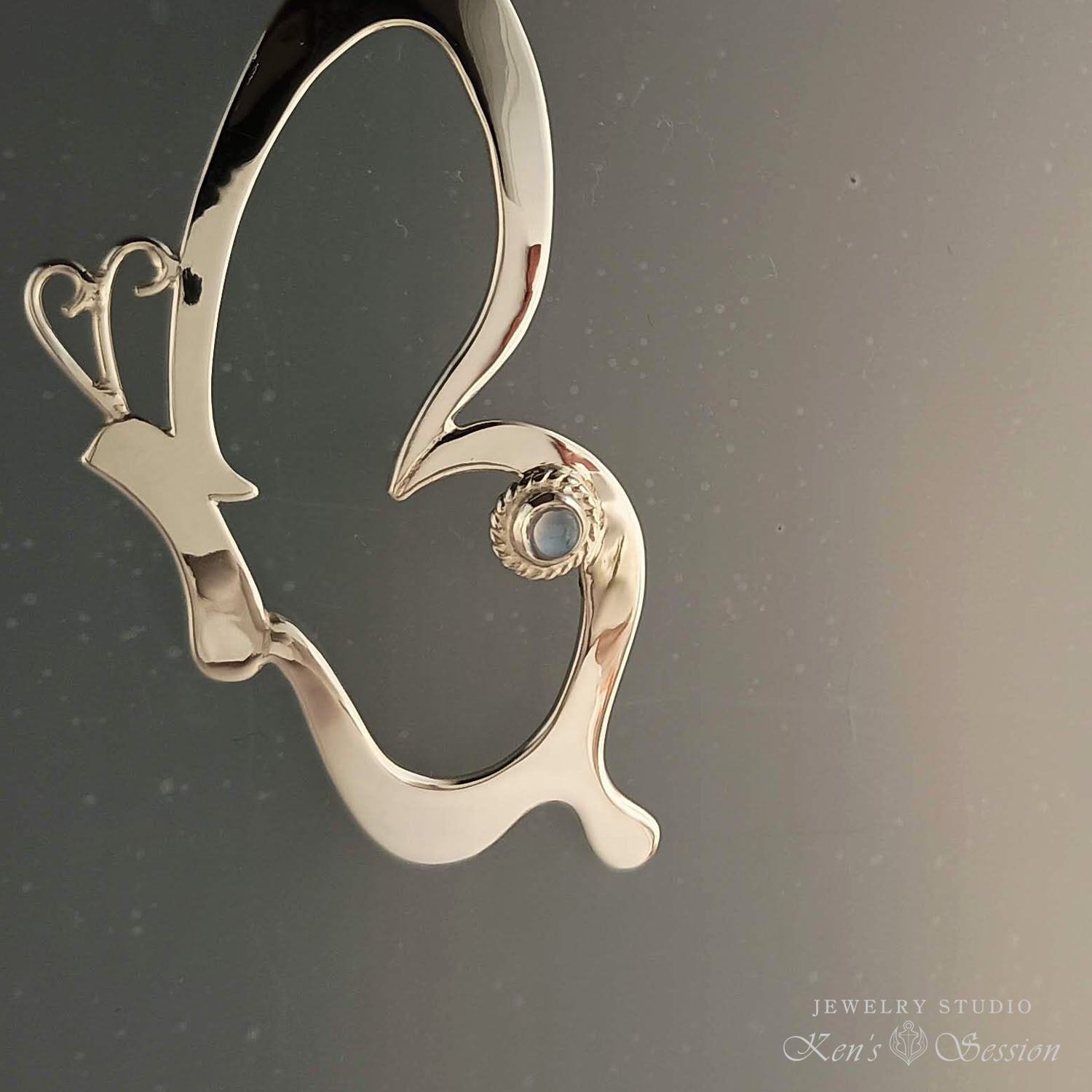 シルバーのプレートに蝶の柄を透かしたペンダントです。 優雅に花の周りを飛ぶ蝶のシルエットを、フレームのようにスッキリと表現しました。 アクセントに留めた石はブルームーンストーンで、ラウンドカボションで可愛らしく、黒や茶色など濃い洋服に合わせると青の色が増します。 ロングネックレスにお勧めの大きさで、シンプルなデザインは着ている洋服の柄も蝶のシルエットの中に見え、洋服を選ばずに楽しめます。手仕事による透かしの輝きを、胸元で飾りたい方にお勧めです。