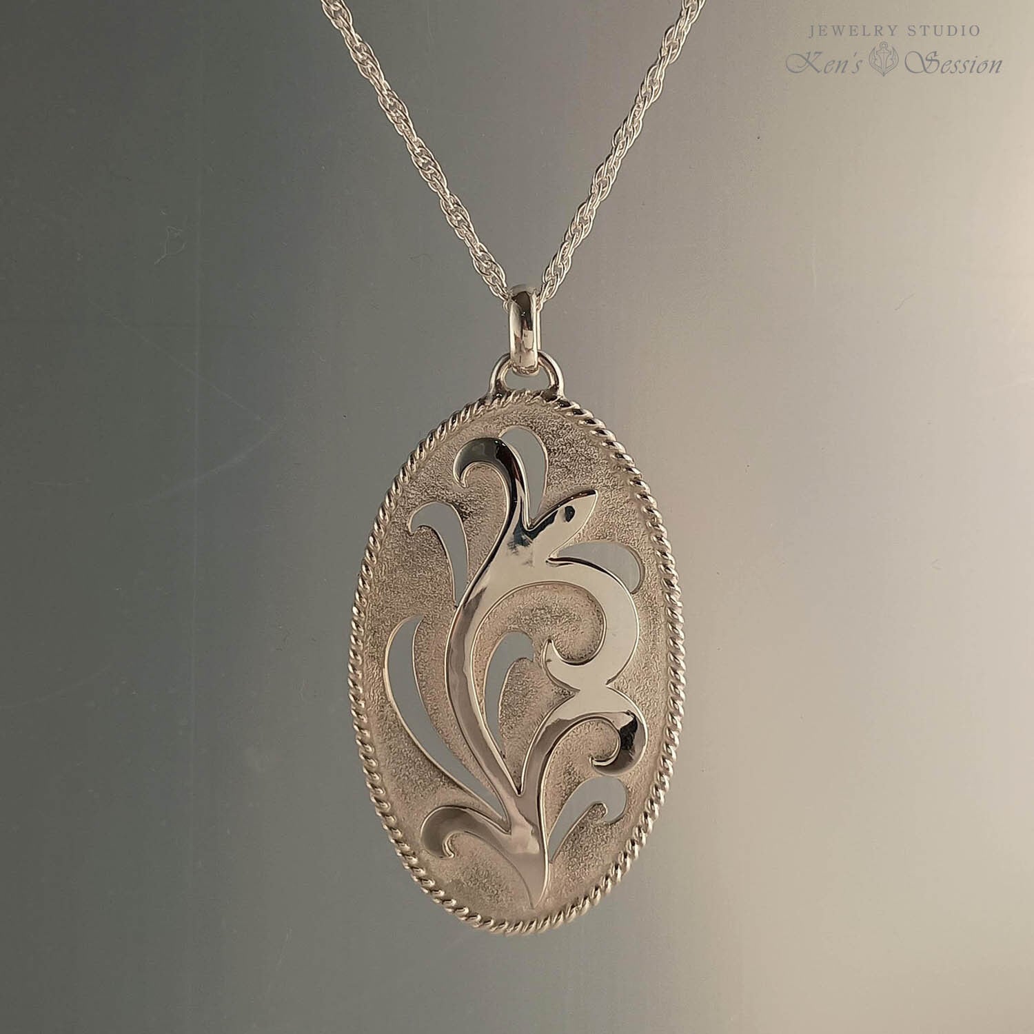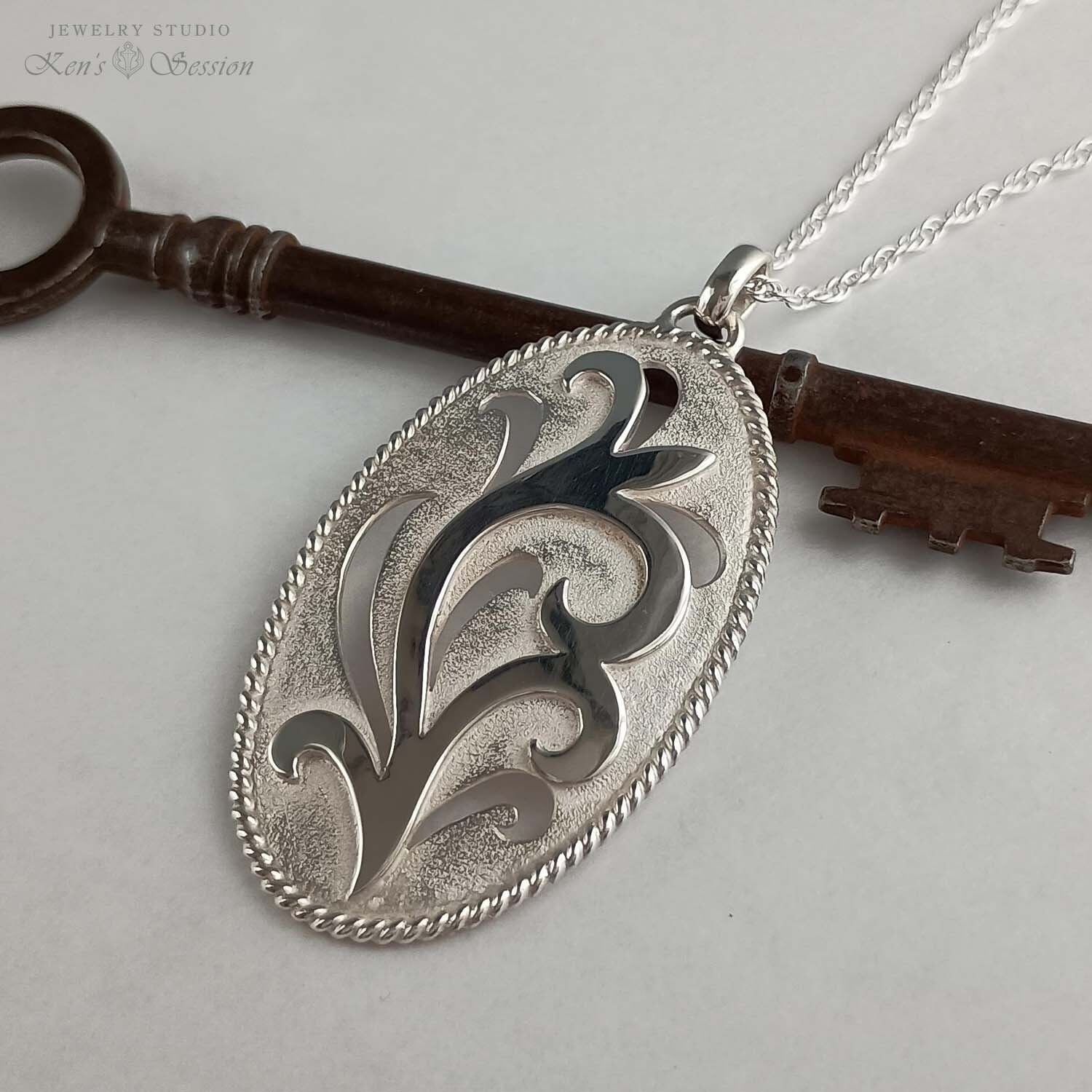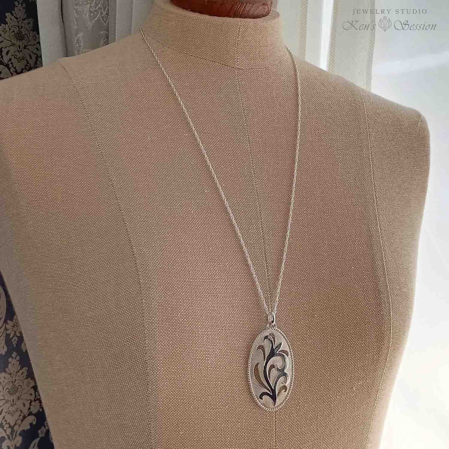 唐草模様を透かしと、貼り合わせで表現したペンダントです。 縁はより線をまわし、ひと手間が華やかな印象を与えます。 ロングネックレスにお勧めな少し大きめのペンダントですが、唐草の一部である、透かしの部分が軽やかな印象を与えます。 白仕上げにより、柄がくっきりとし、遠めでも細工が分かるデザインです。 手仕事による透かしの輝きを、洋服を選ばずに楽しみたい方にお勧めです。