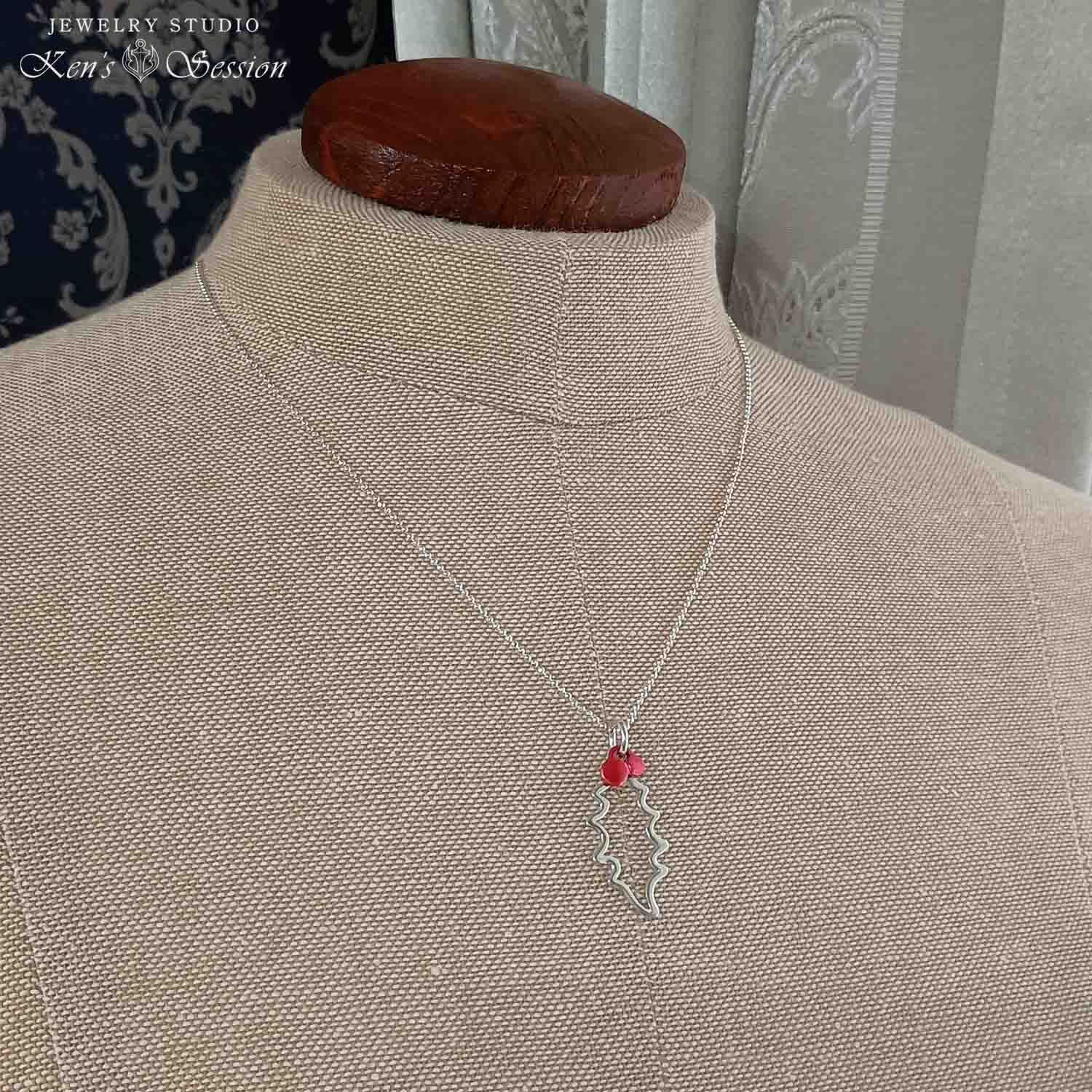 冬になると赤の実の色が綺麗な、セイヨウヒイラギをモチーフにしたペンダントです。 日本の伝統技法「緋銅」の技術を使って実を表現し、ベースはシルバーの板を透かして葉を表現しております。 クリスマス時期はもちろん、他の季節でも、銀と赤の色がコーディネートにアクセントを加えます。 40~45cmの短めに合う大きさで、手仕事による輝きを、洋服を選ばずに楽しみたい方にお勧めです。
