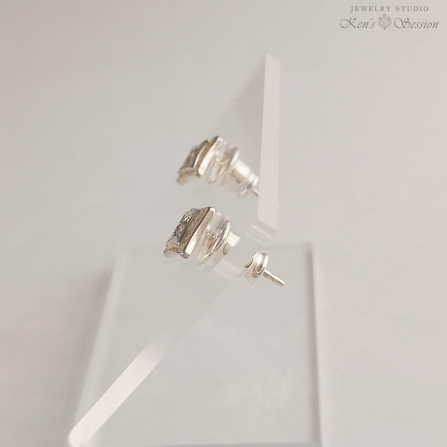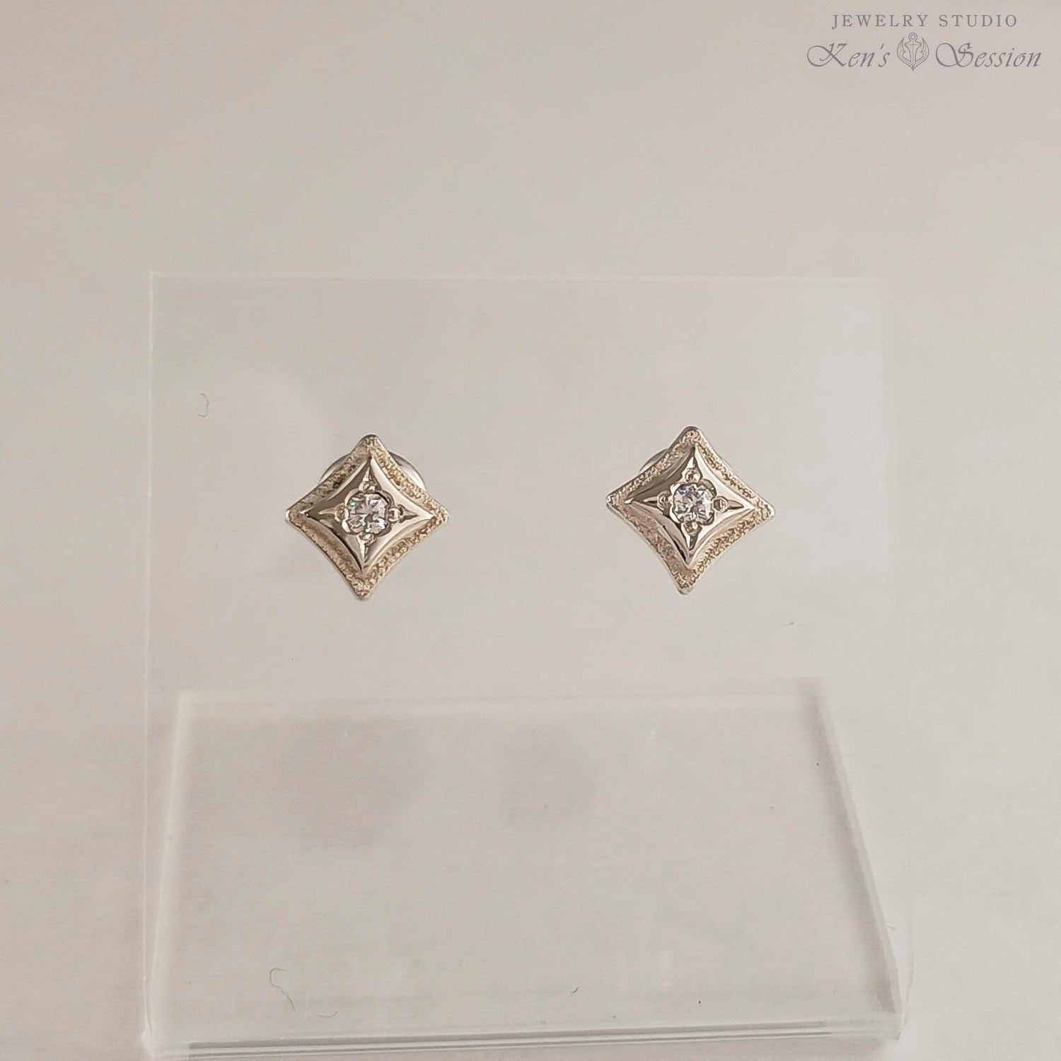 地を荒らし、二段に重ねた四角のシルバーのベースに、キュービックジルコニアを彫り留めしたピアスになります。耳に着けた時、ダイヤ型になるようにポストを立てており、シャープな印象を与えます。 小ぶりなサイズでさり気なく、ストーンの部分に光が当たるとキラキラと輝きます。 シンプルなデザインで飽きずらくヘアカラーやスタイルも選ばずに身に着けられます。 手仕事による輝きを、耳元で楽しみたい方にお勧めです。