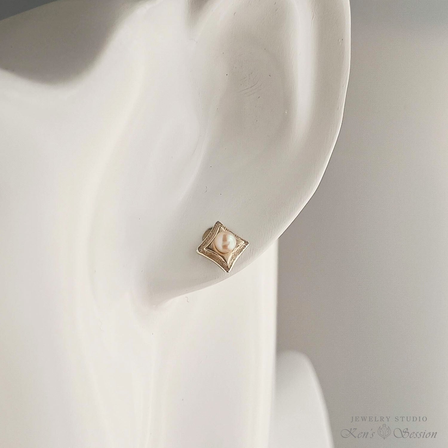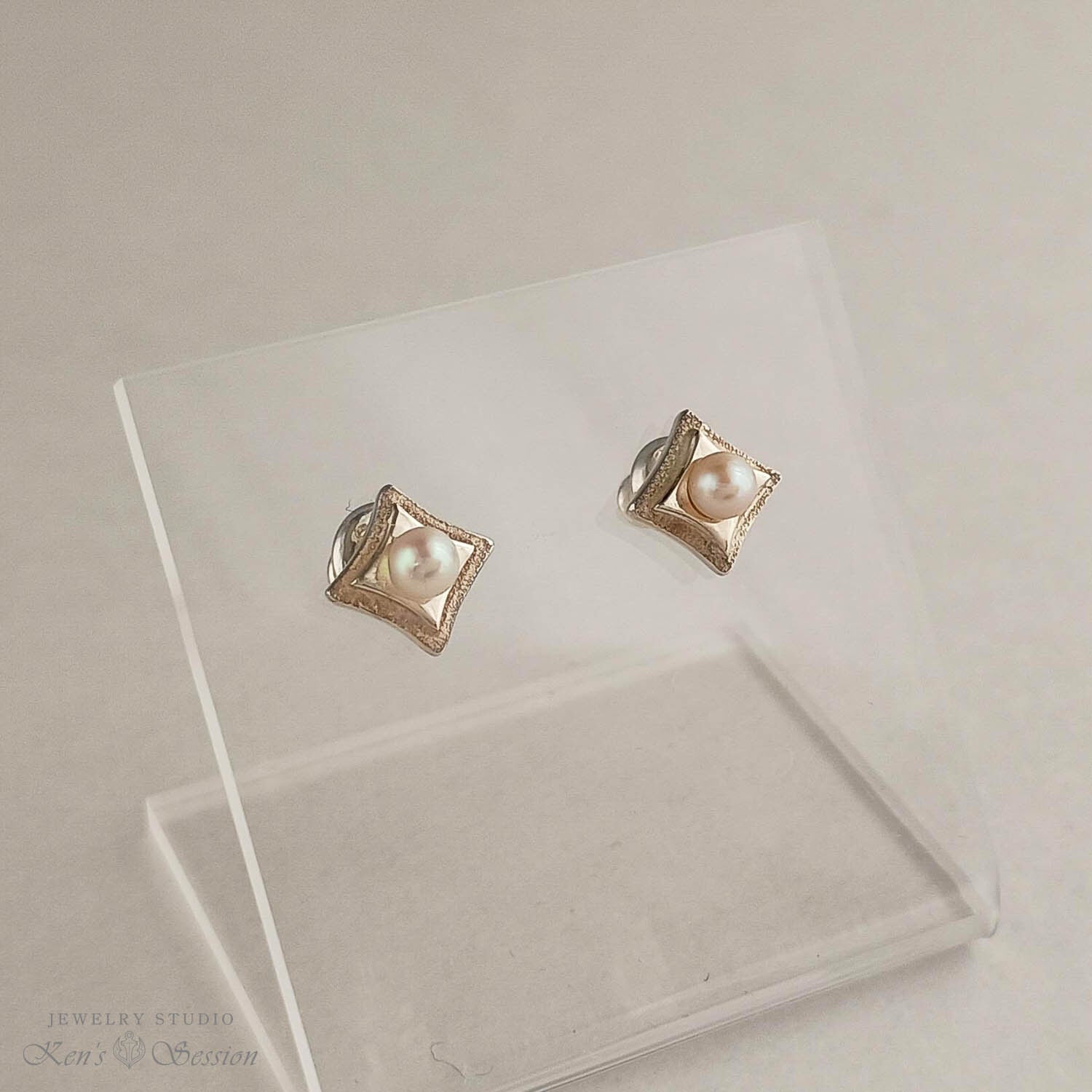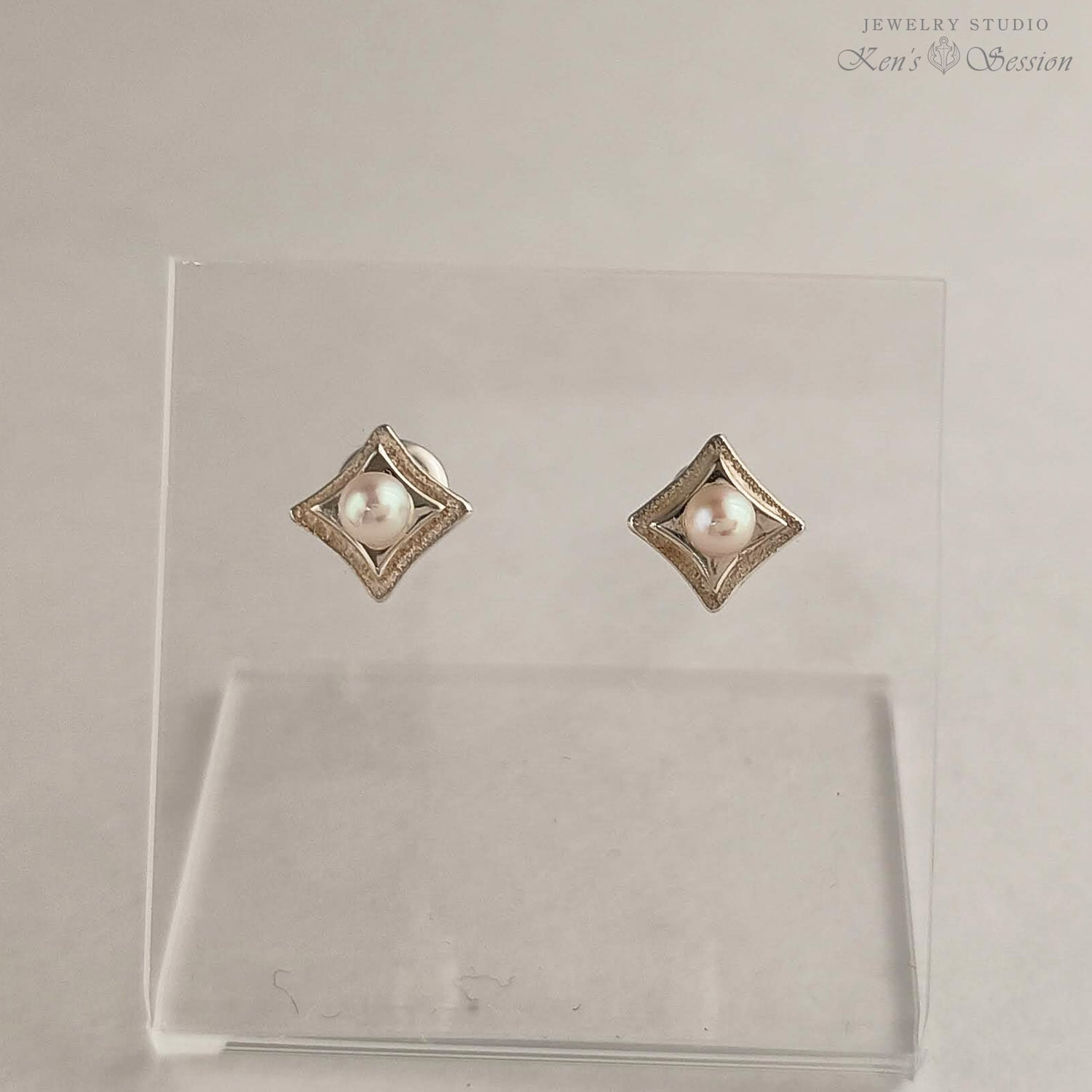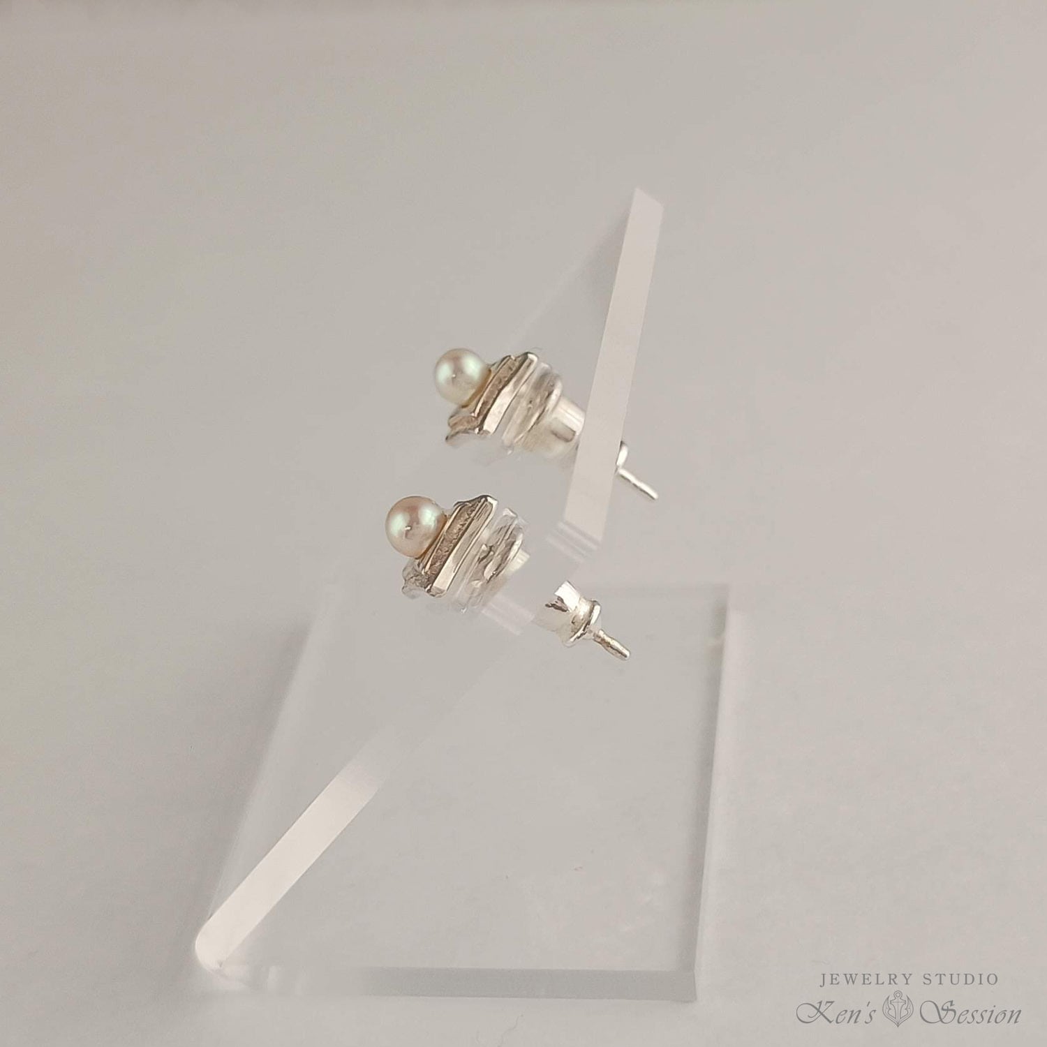 地を荒らし、二段に重ねた四角のシルバーのベースに、アコヤパールを留めたピアスになります。 耳に着けた時、ダイヤ型になるようにポストを立てており、シャープな印象を与えます。 小ぶりなサイズでさり気なく、パールの柔らかな色味が温かい雰囲気も醸し出します。 シンプルなデザインで飽きずらくヘアカラーやスタイルも選ばずに身に着けられます。 手仕事による輝きを、耳元で楽しみたい方にお勧めです。