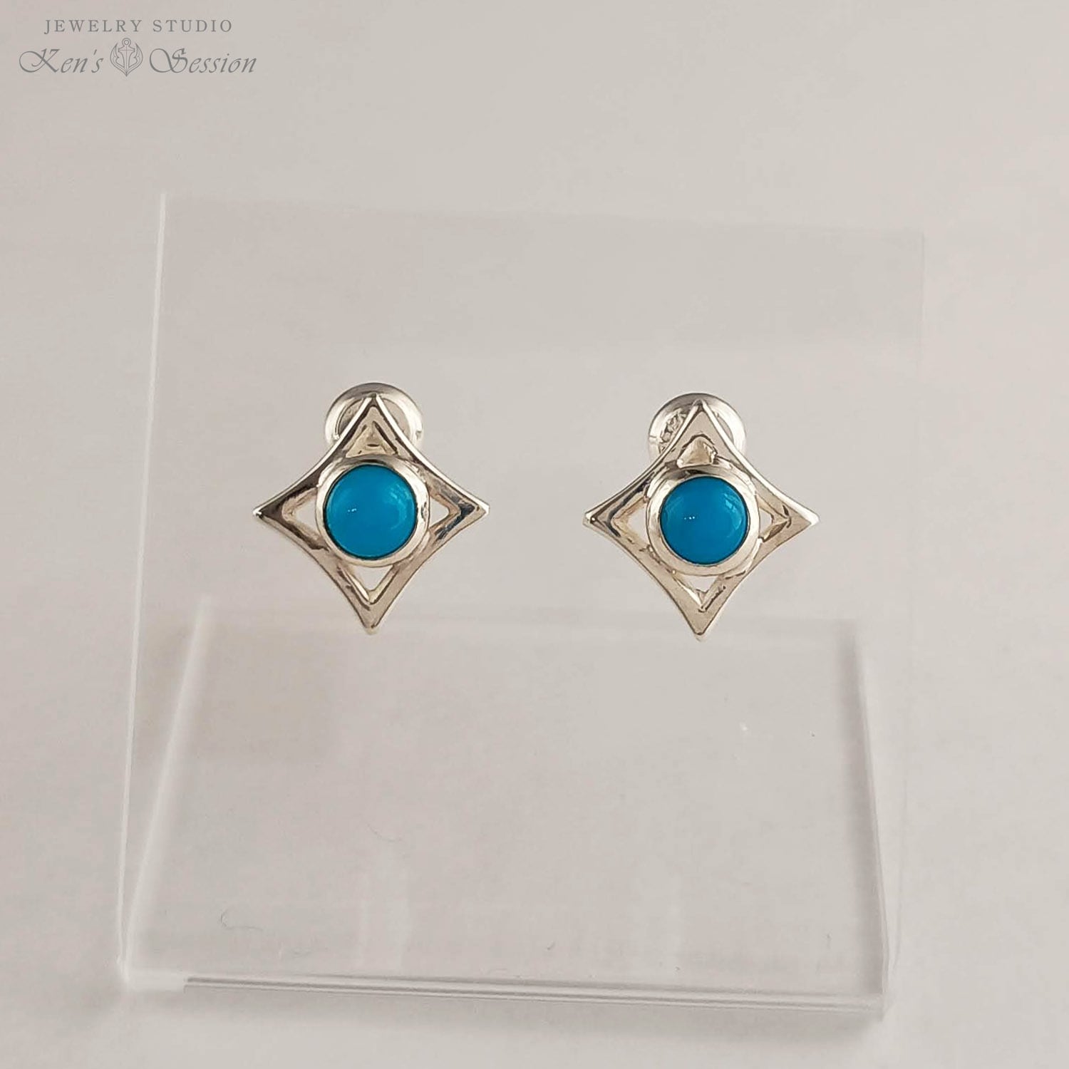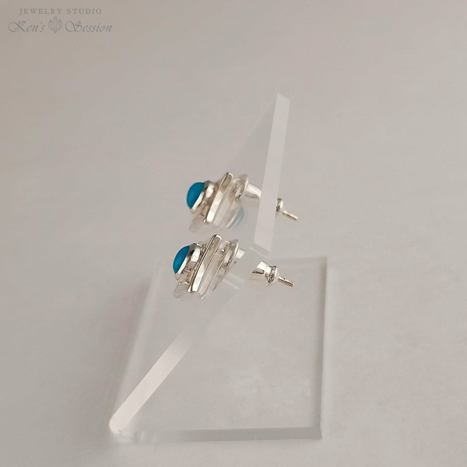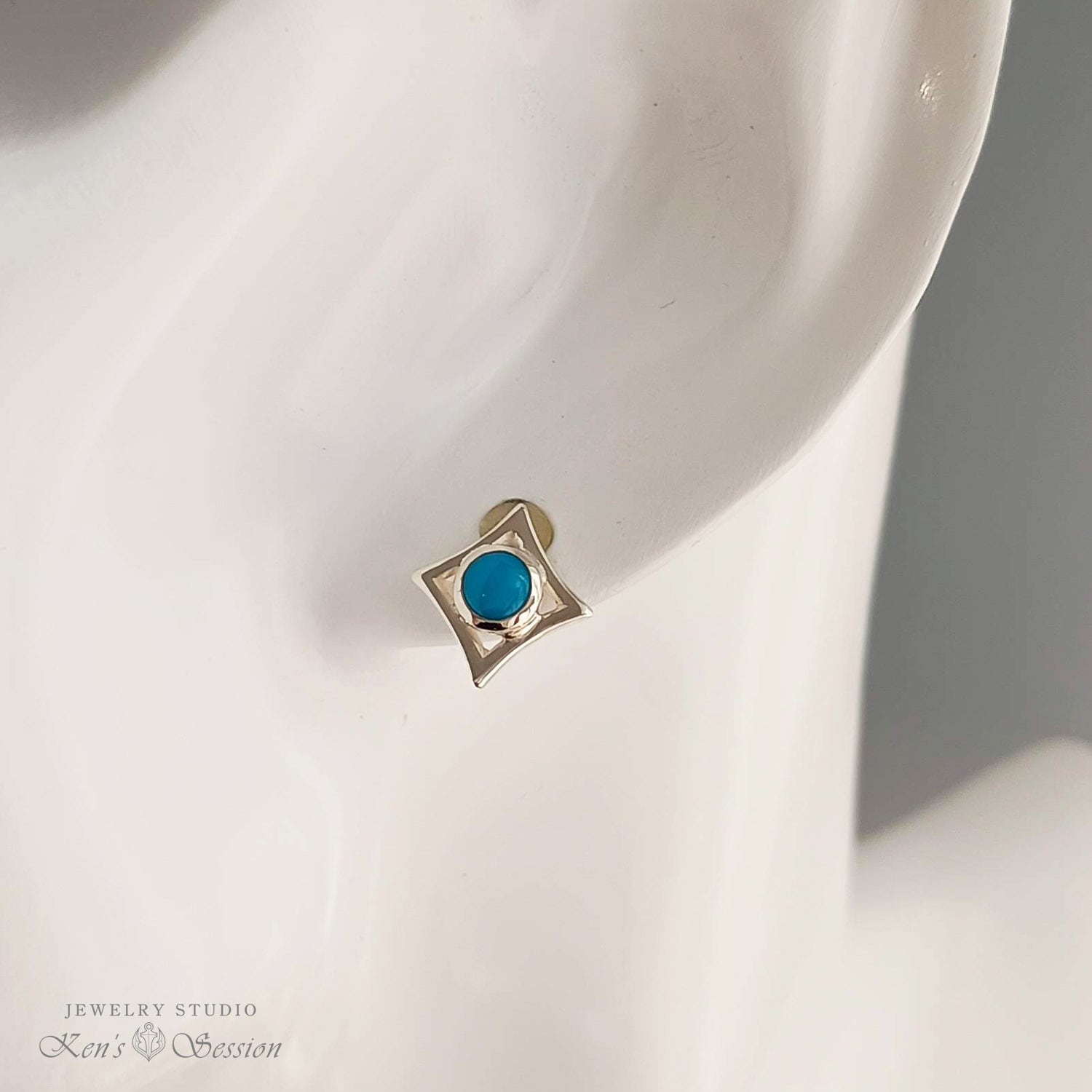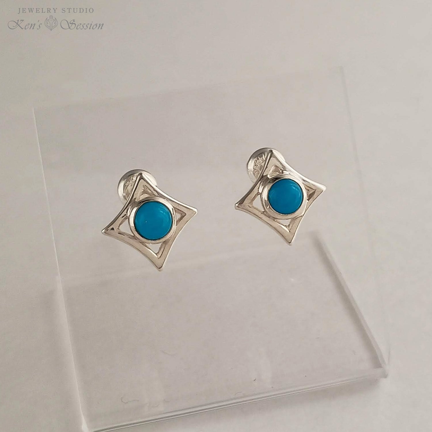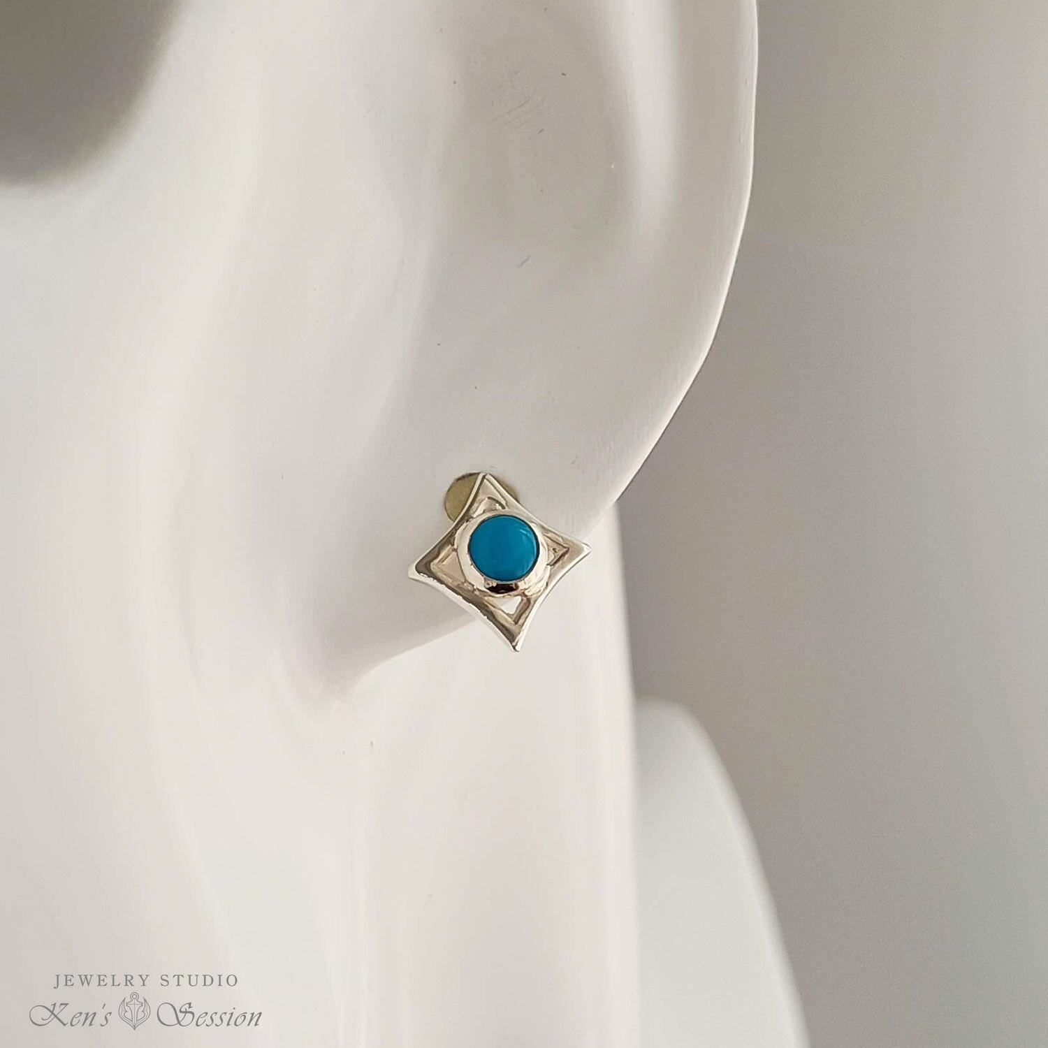 中を開けた四角のフレームのセンターにラウンドのターコイズを留めたピアスになります。 ターコイズは青の発色が良い物をチョイスしており、耳に着けた時に爽やかな印象を与えます。 今日のコーディネートを耳にも合わせたい方、手仕事による輝きを耳元で楽しみたい方にお勧めです。