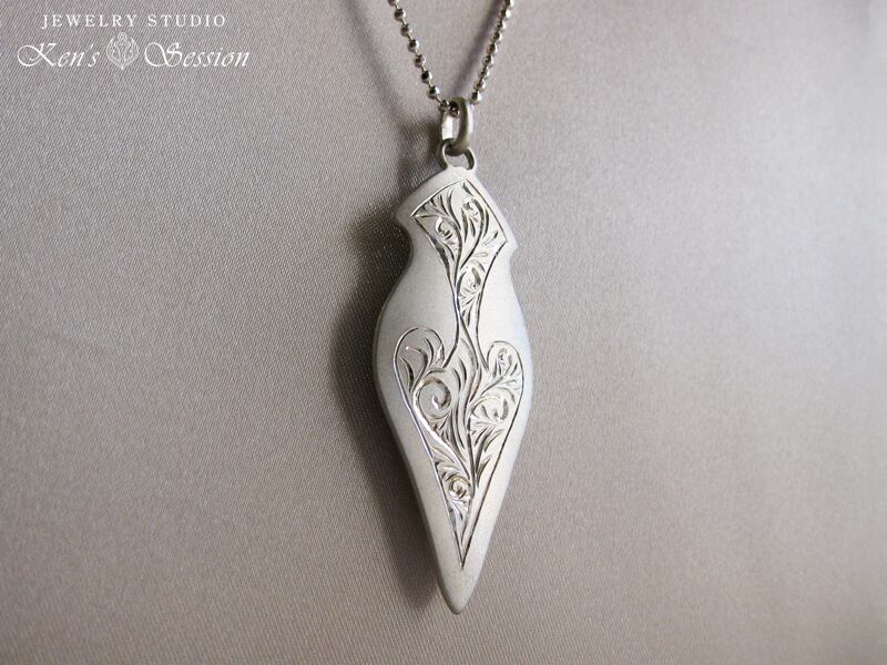 シルバーのプレートに唐草模様を手彫りにより施されたネックレスです。
