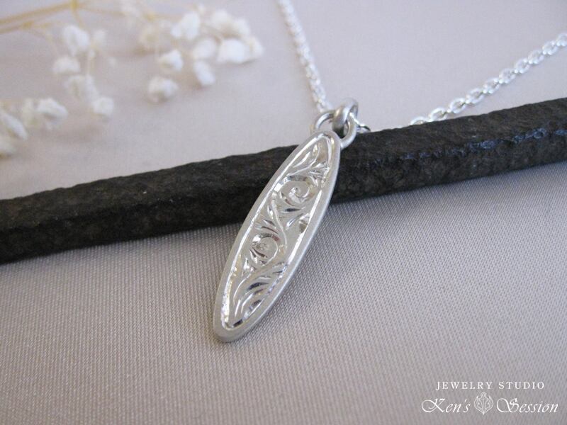 シルバーのプレートに唐草模様を手彫りにより施されたネックレスです。