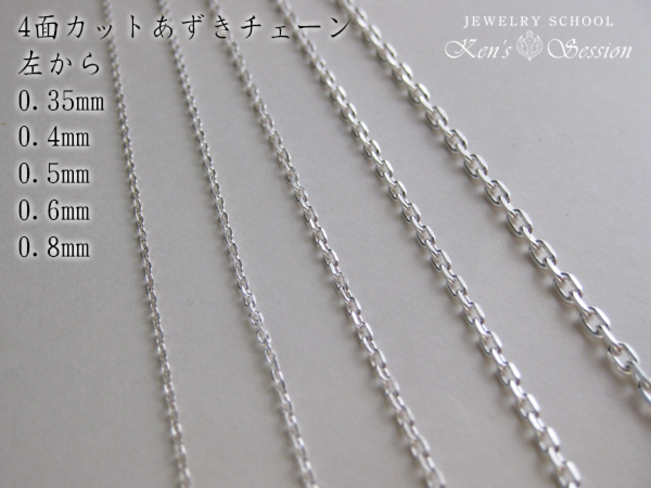 太さのイメージは、5種類の4面カットあずきチェーンの写真をご覧下さい。